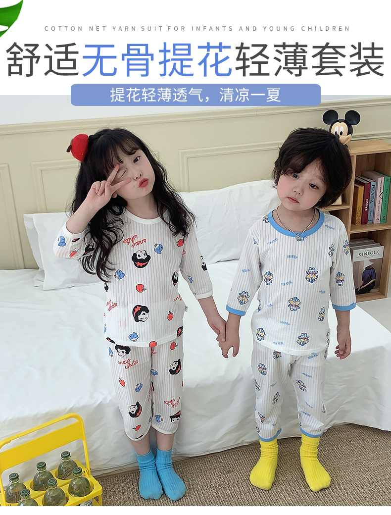 아동용 잠옷, 남아용 여름 뼈없는 가정복 세트, 남아 및 여아용 얇은 만화 7부 소매 아기 에어컨 의류스토어 가기