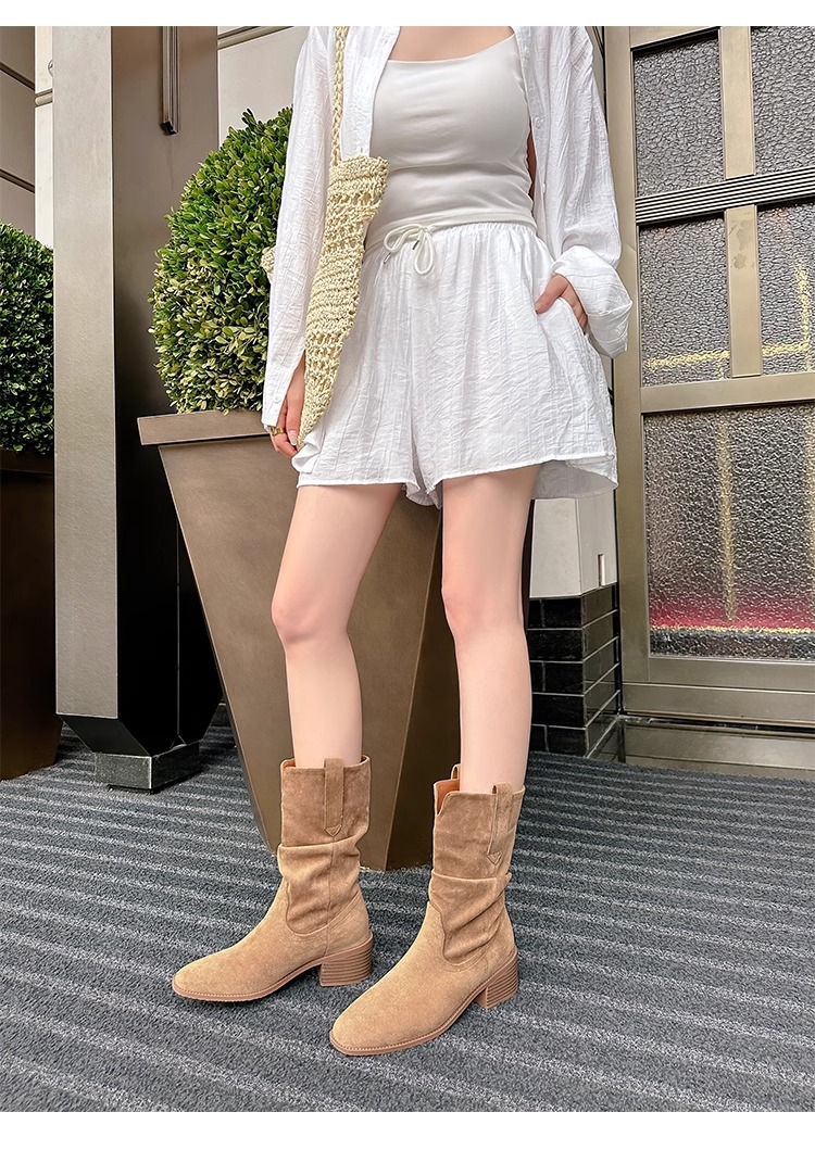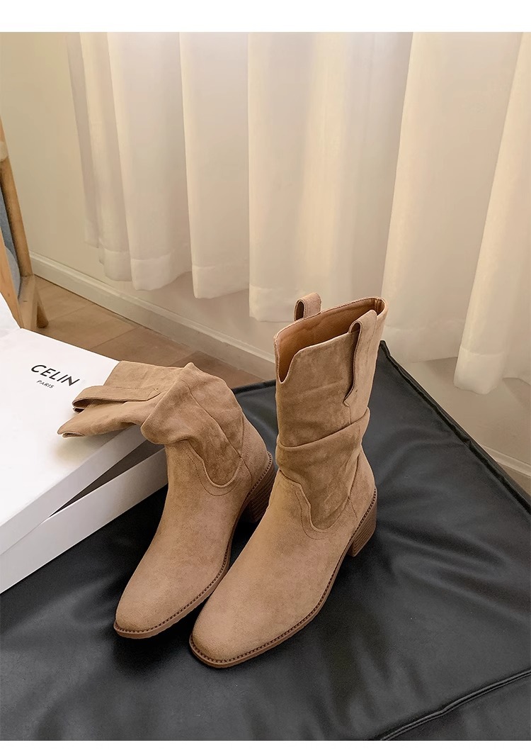 여성을위한 복고풍 다목적 카우보이 부츠 2025 봄, 가을 새로운 스타일 뾰족한 발가락 두꺼운 굽 주름 짧은 마틴 부츠 나이트 부츠