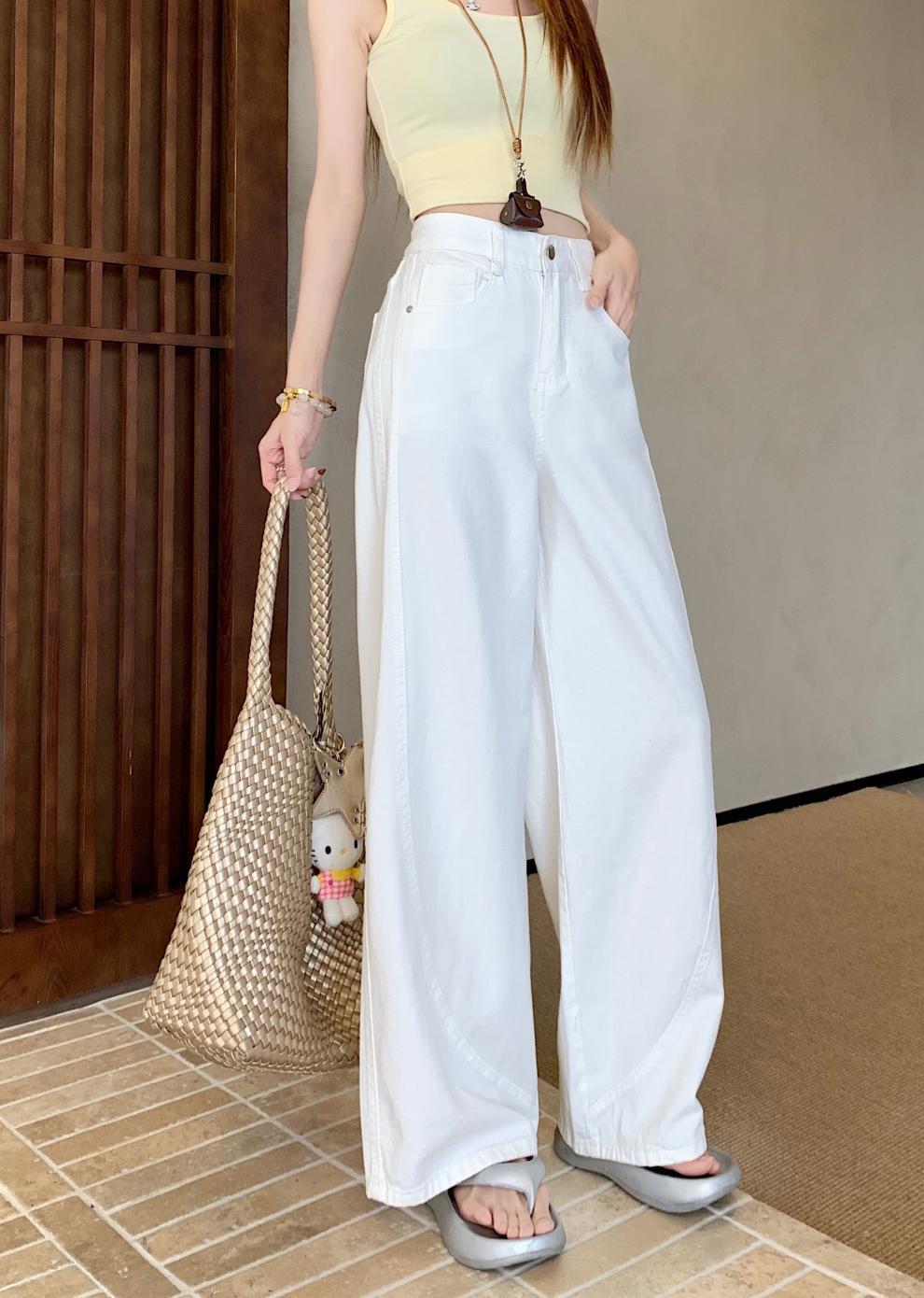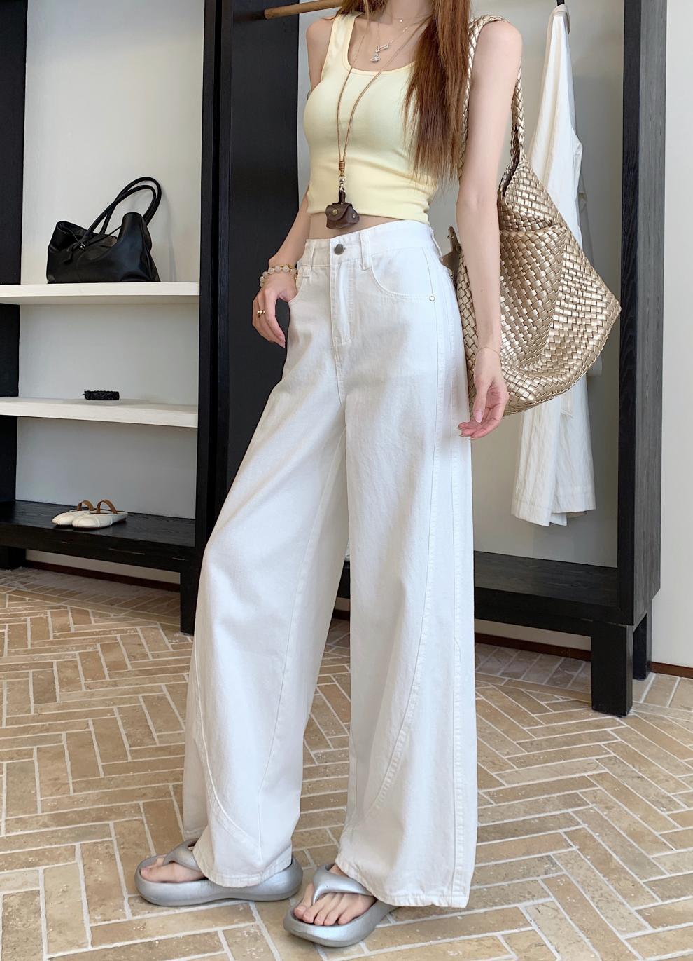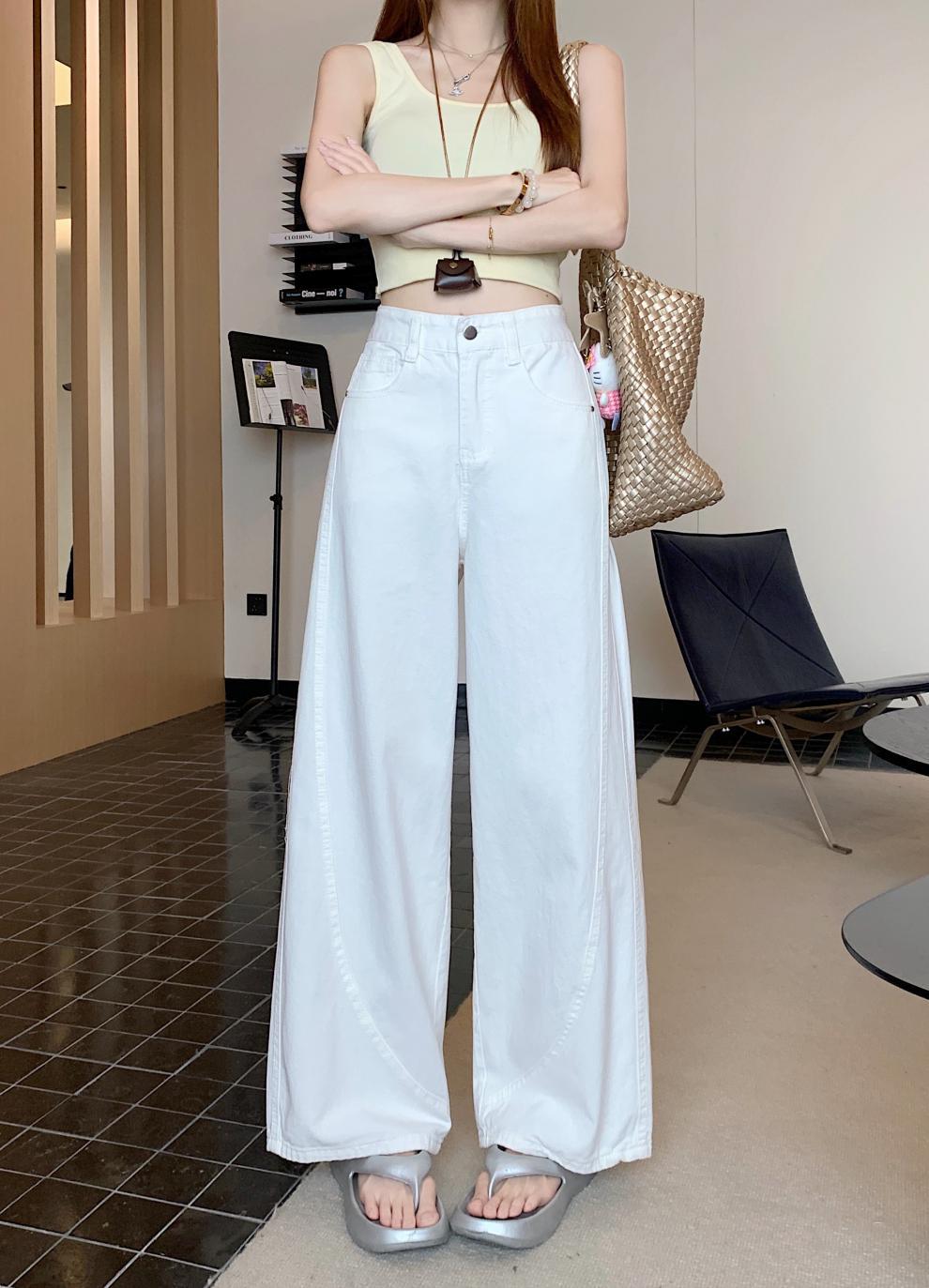 ~여름 여성용 스몰 아메리칸 디자인 청바지 하이웨이스트 루즈 드레이프 채플린 와이드 레그 바닥 길이 팬츠스토어 가기