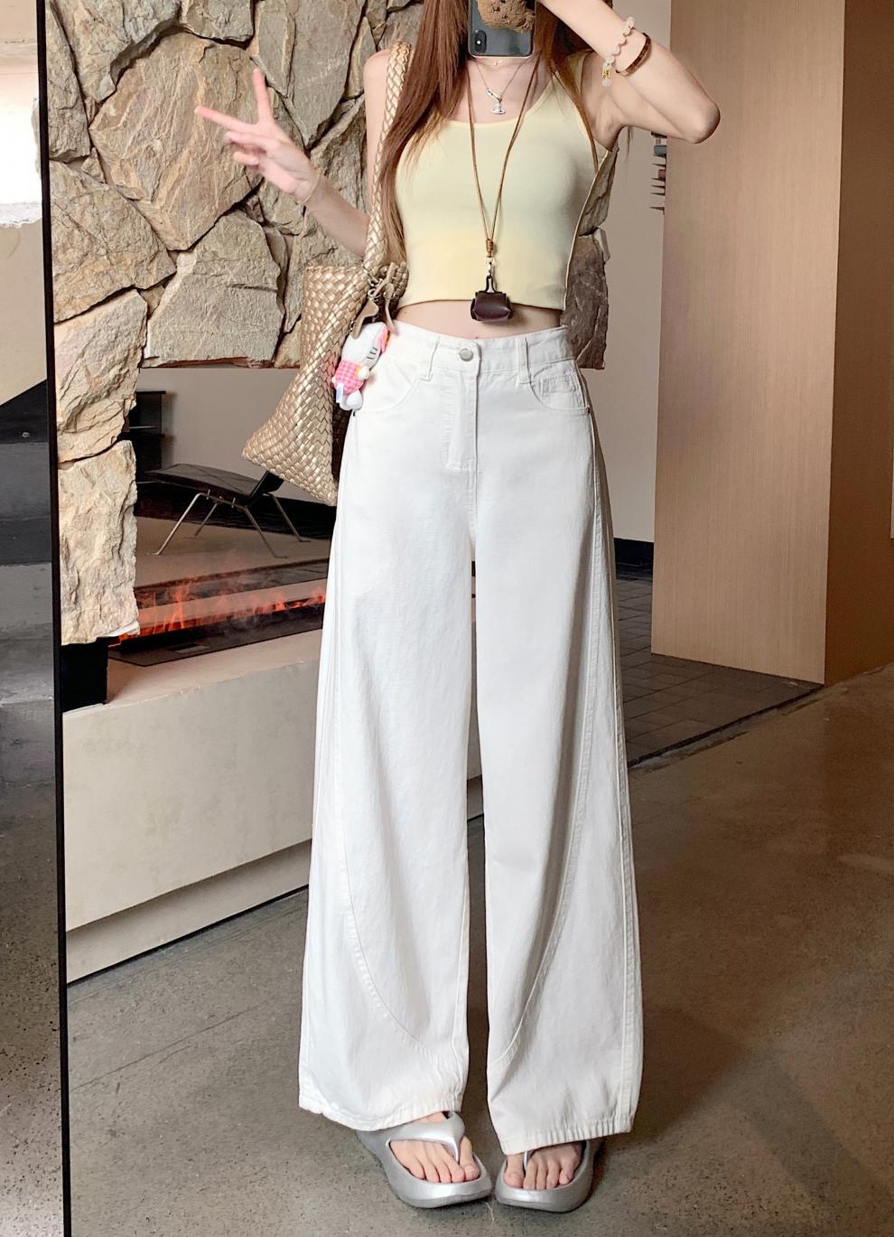 ~여름 여성용 스몰 아메리칸 디자인 청바지 하이웨이스트 루즈 드레이프 채플린 와이드 레그 바닥 길이 팬츠