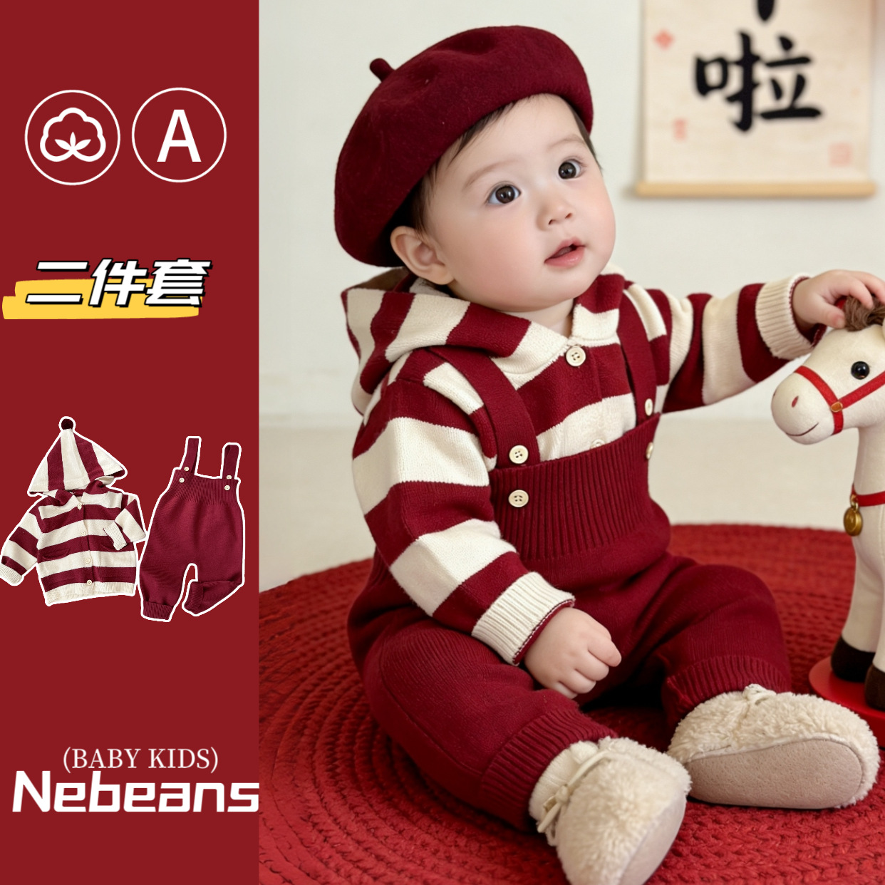 가을 신생아 옷 작업복 정장 한국식 원사 염색 줄무늬 니트 울 스웨트 셔츠 아기 옷