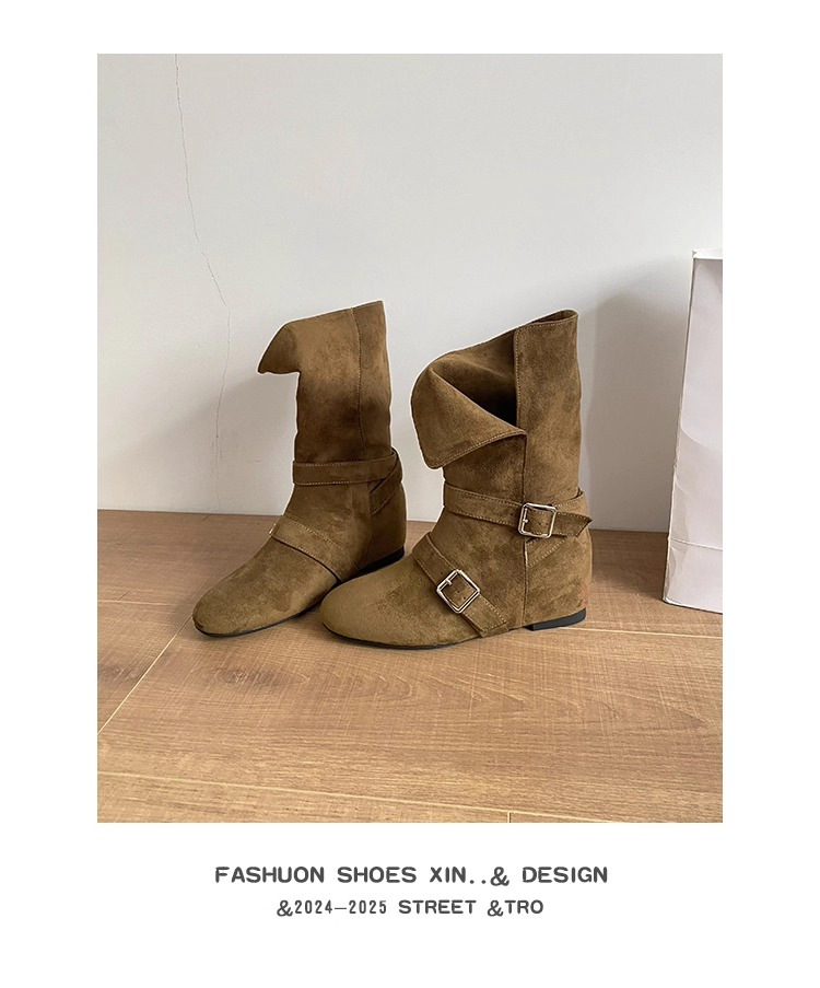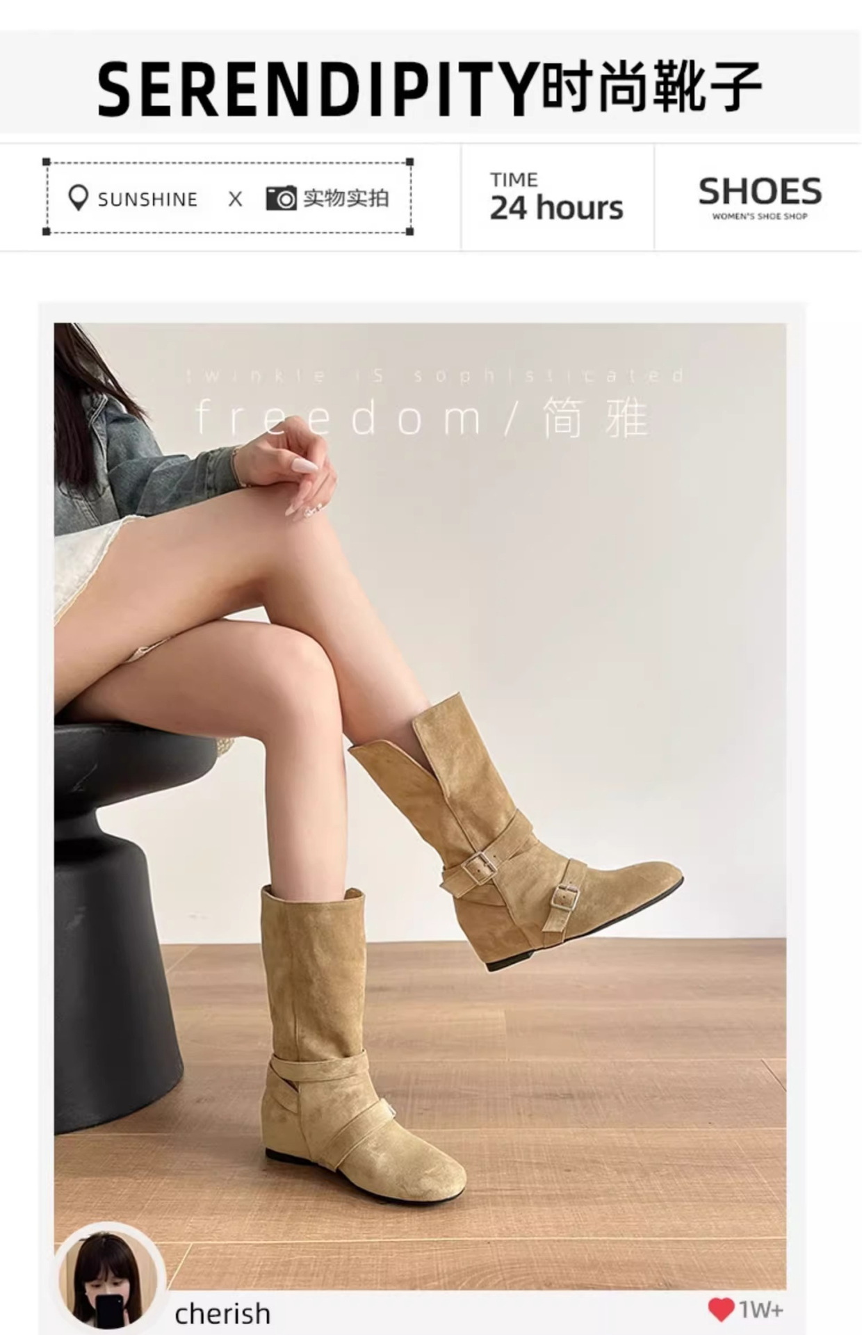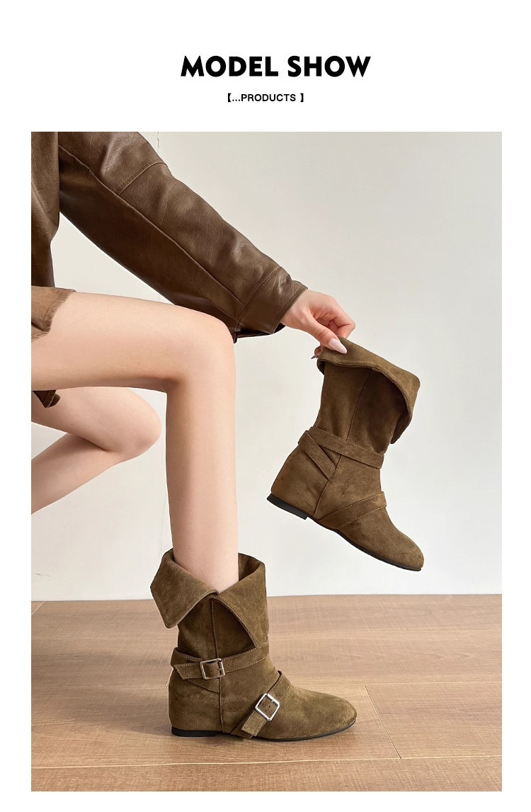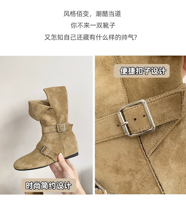 여성을 위한 레트로 벨트 버클 미드 튜브 부츠 2025 가을 겨울 새로운 슬림하고 다재다능한 웨스턴 부츠 내부 높이 증가 마틴 부츠스토어 가기