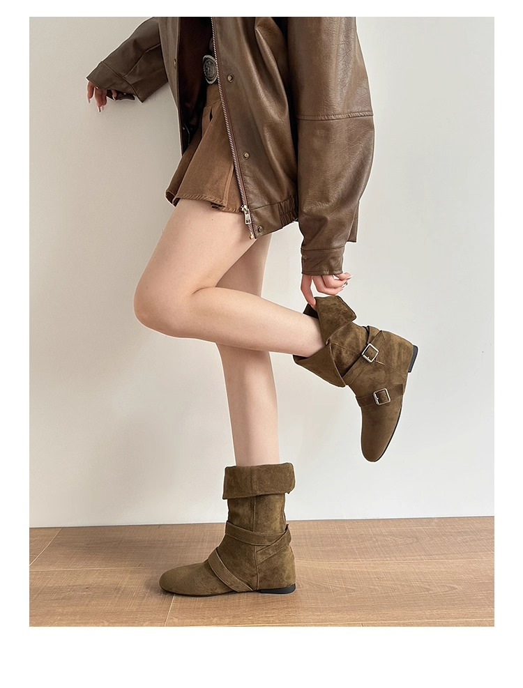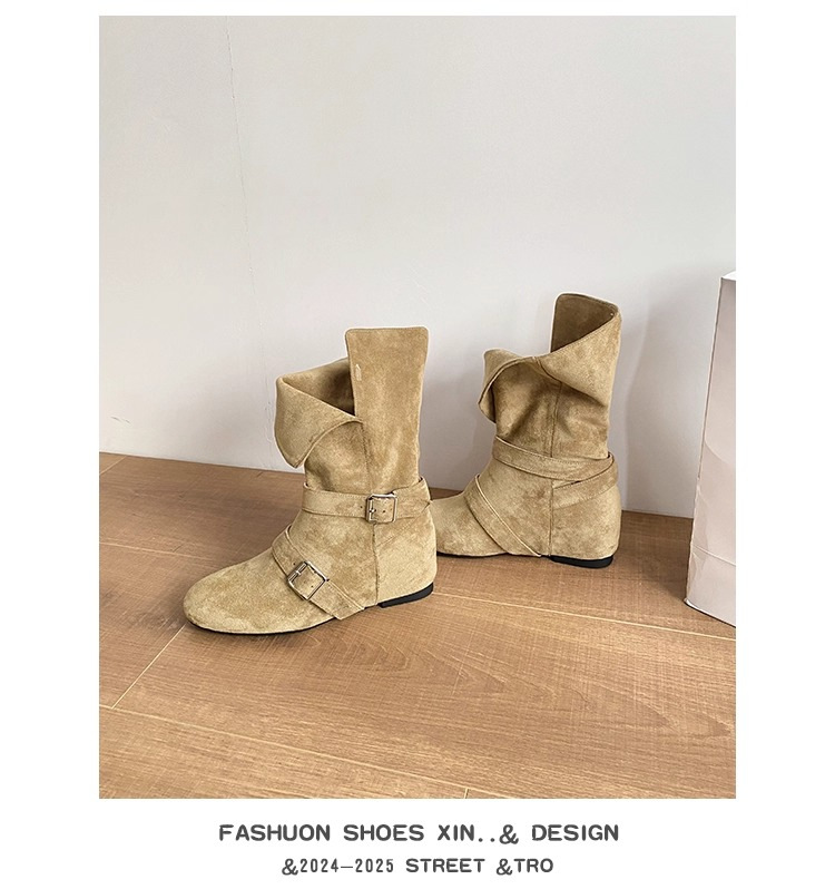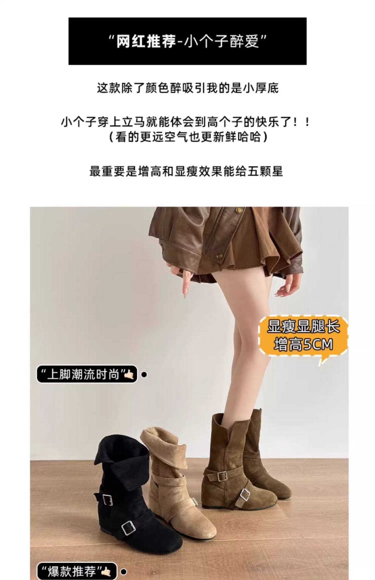 여성을 위한 레트로 벨트 버클 미드 튜브 부츠 2025 가을 겨울 새로운 슬림하고 다재다능한 웨스턴 부츠 내부 높이 증가 마틴 부츠
