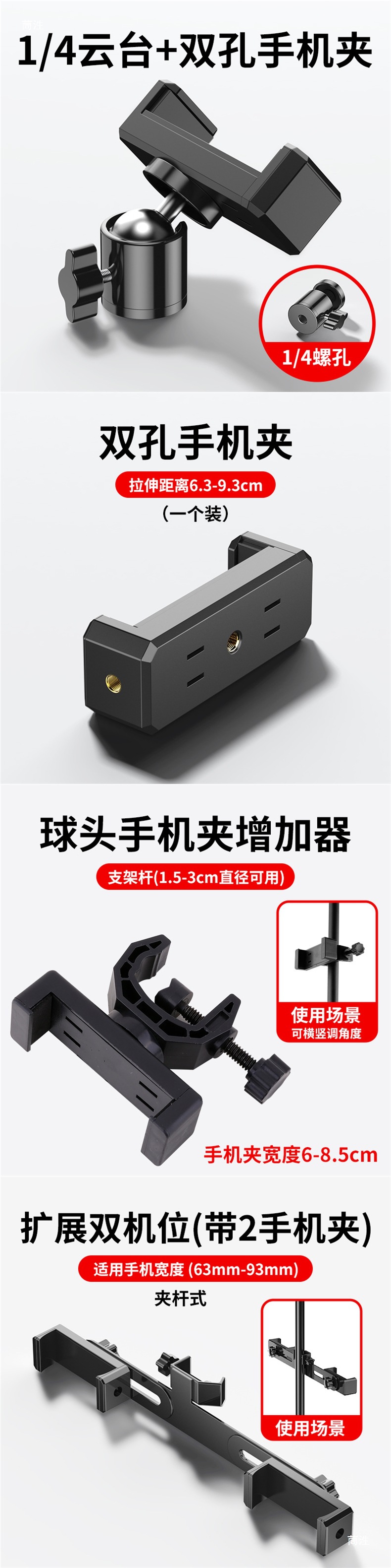 • 1/4 팬/틸트 [메탈] + 이중 구멍 휴대폰 클립