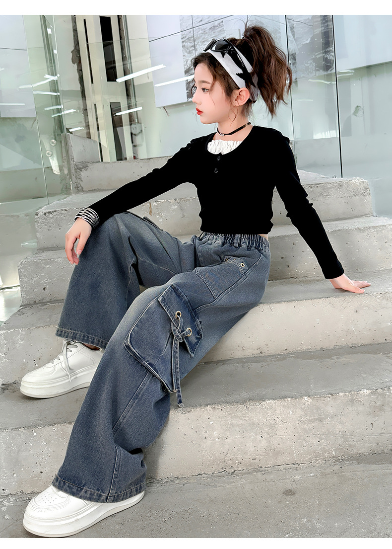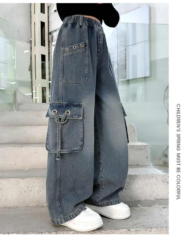 여아 작업복, 봄, 가을 여아 청바지, 트렌디하고 쿨한 루즈한 와이드 팬츠, 캐주얼 가을 아동 바지