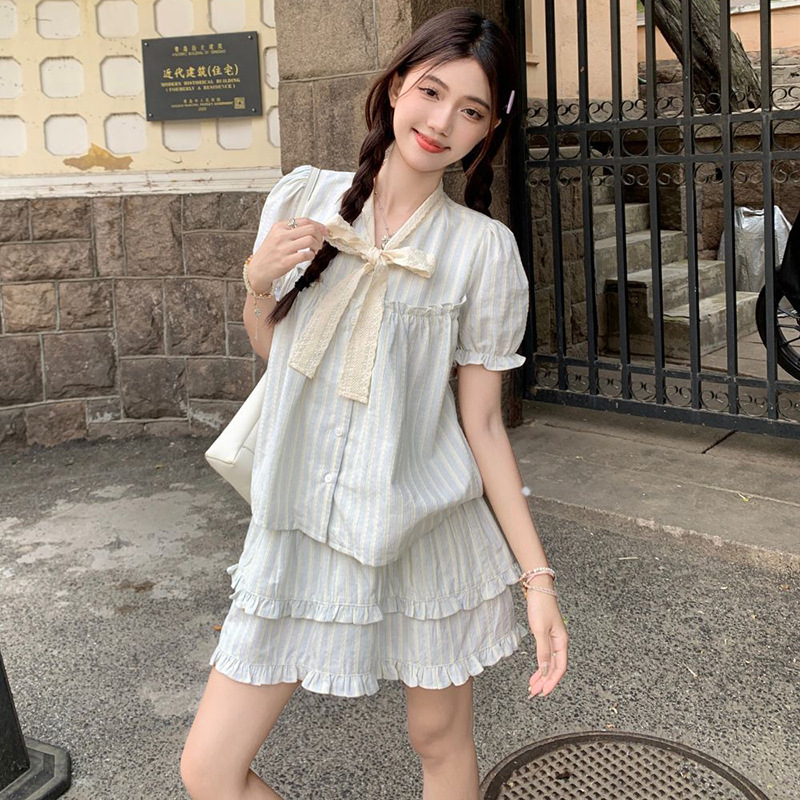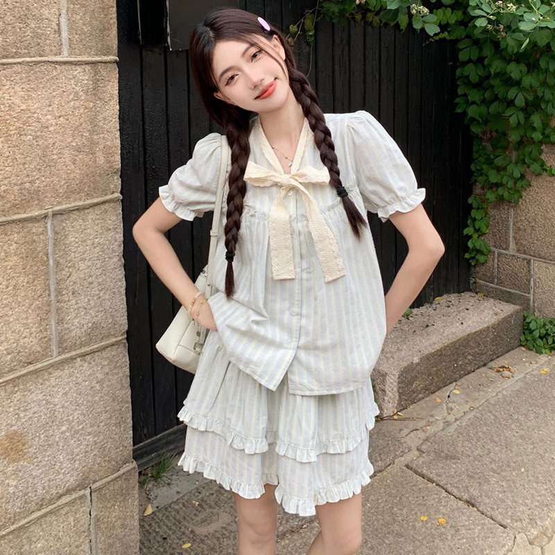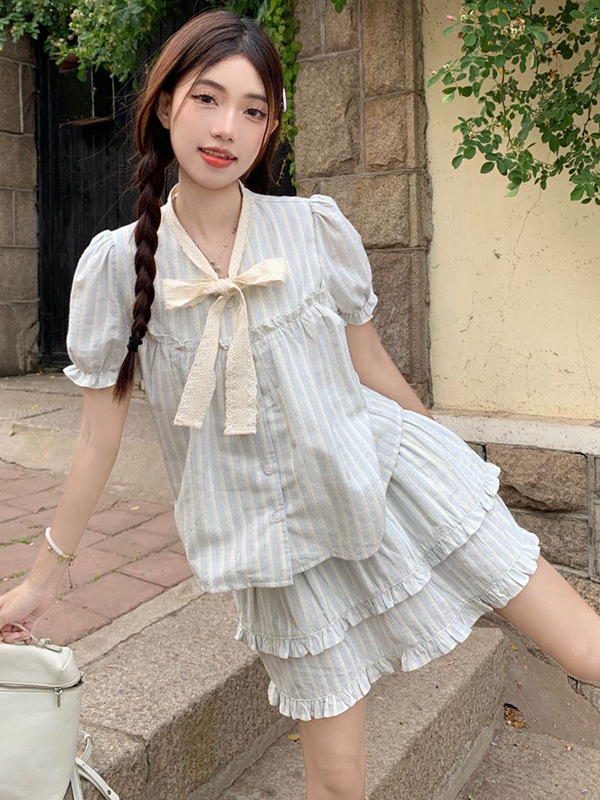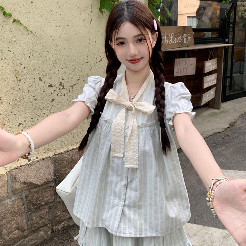 여름 새로운 달콤하고 부드러운 스타일의 나비 넥타이 세련된 레이스 세로 줄무늬 나비 넥타이 퍼프 슬리브 셔츠 여성용