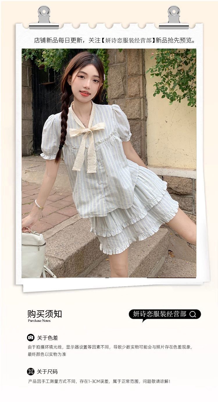 여름 새로운 달콤하고 부드러운 스타일의 나비 넥타이 세련된 레이스 세로 줄무늬 나비 넥타이 퍼프 슬리브 셔츠 여성용스토어 가기