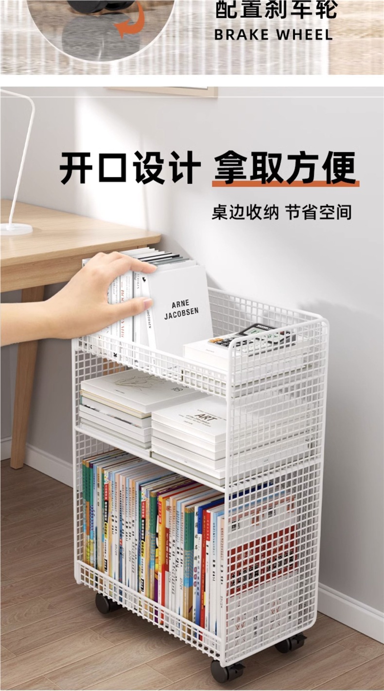 책상 아래 수납 선반, 책상 옆 작은 책장, 바퀴가 달린 이동식 바닥 책상 카트, 책 수납 책장