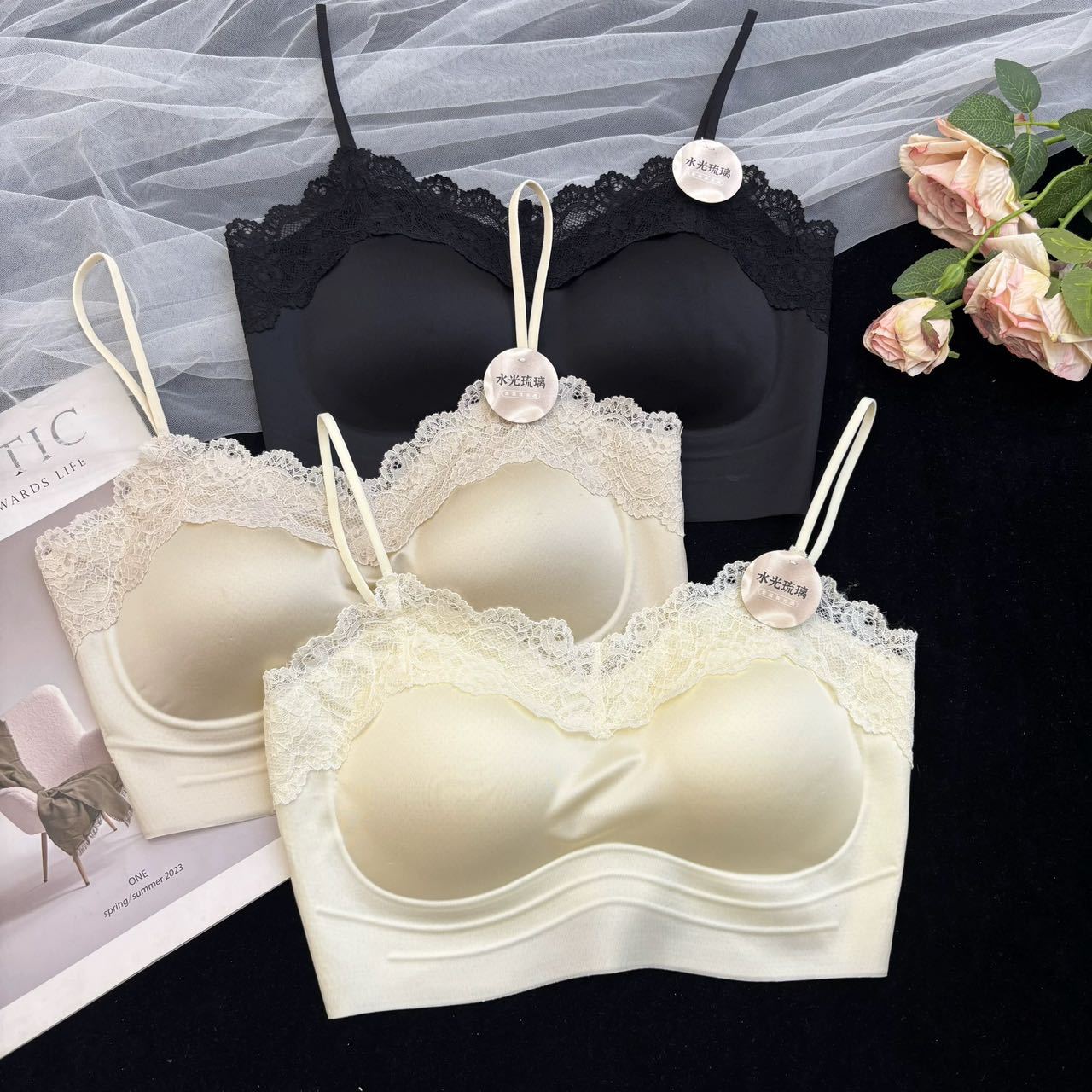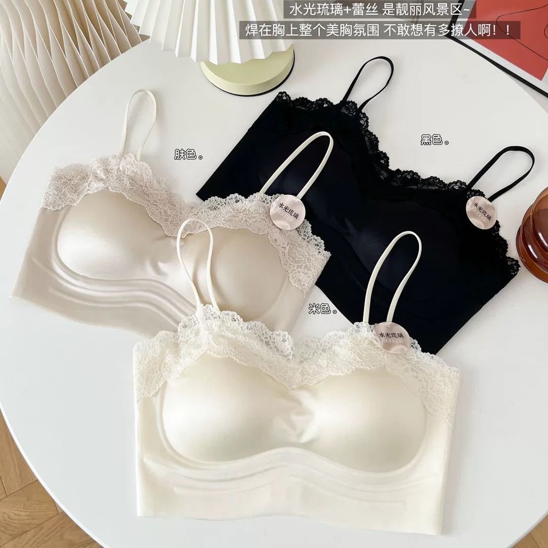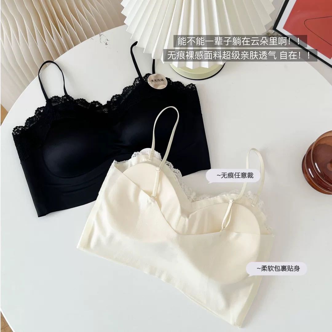 젤리 스트립 소프트 서포트 심리스 아이스 실크 새틴 프렌치 레이스 가슴 패드 일체형 편안하고 통기성이 좋은 여성용 아름다운 백 조끼