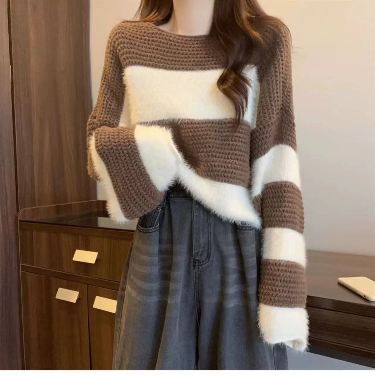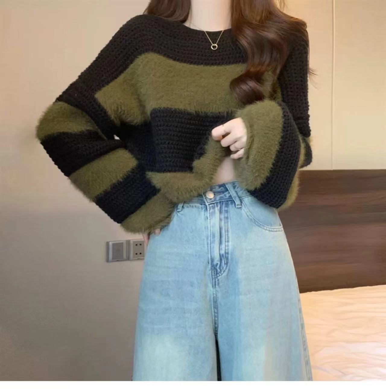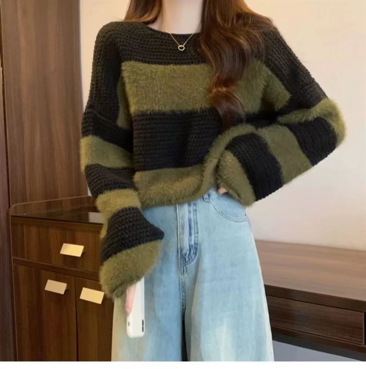 레트로 루즈한 fufu 게으른 스트라이프 스웨터 여성 가을, 겨울 짧은 긴팔 스웨터 아름다운 슬리밍 탑스토어 가기