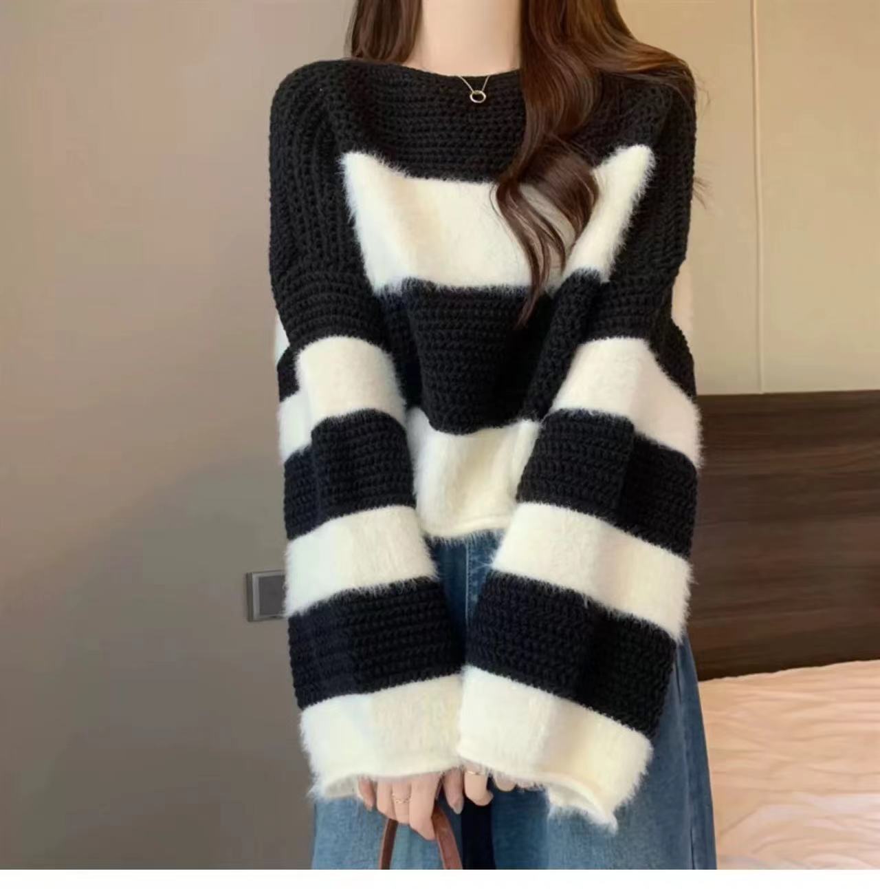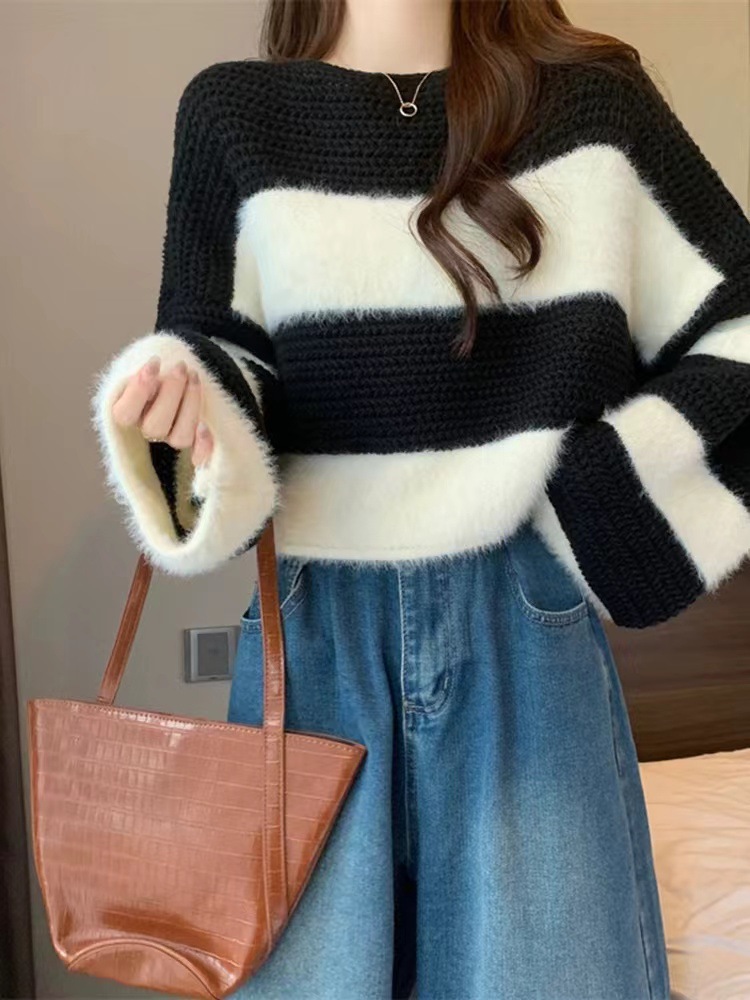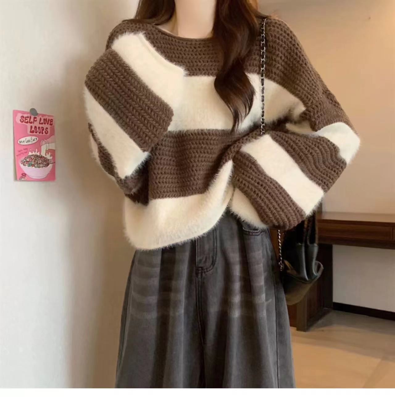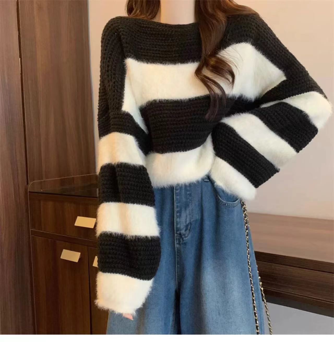레트로 루즈한 fufu 게으른 스트라이프 스웨터 여성 가을, 겨울 짧은 긴팔 스웨터 아름다운 슬리밍 탑