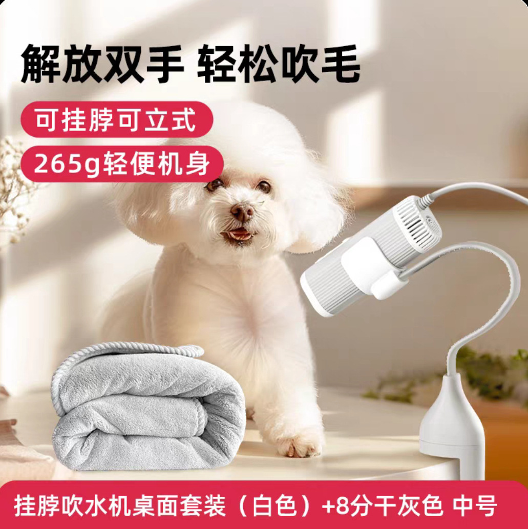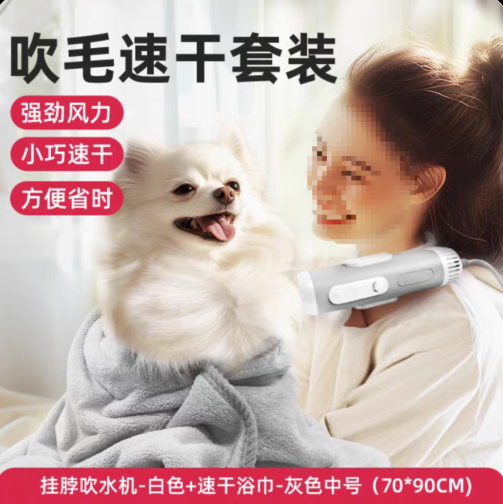 • [핸즈프리 + 속건] 행잉넥 송풍기 - 화이트 + 속건 목욕타월 - 그레이 대형