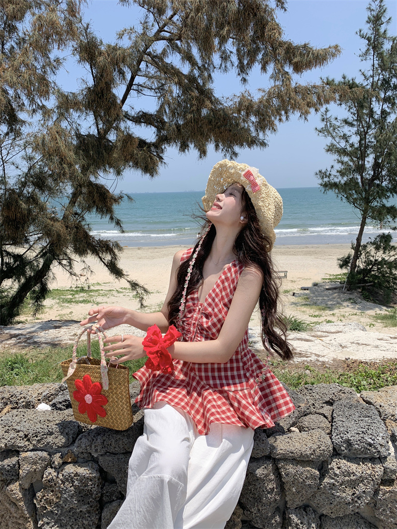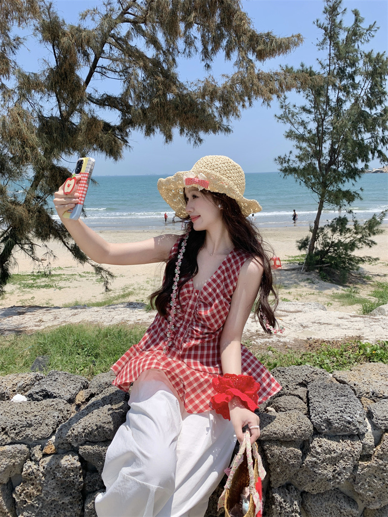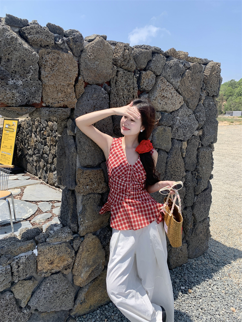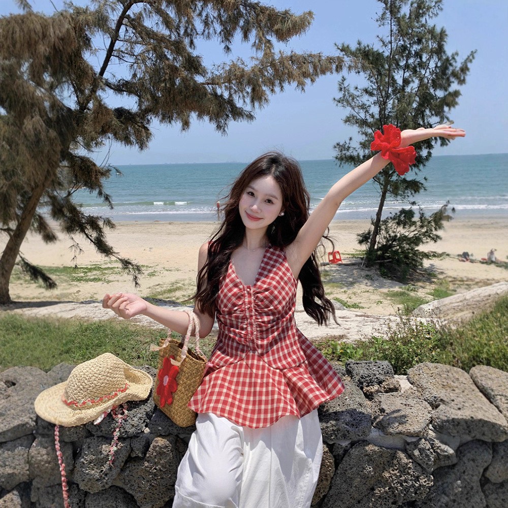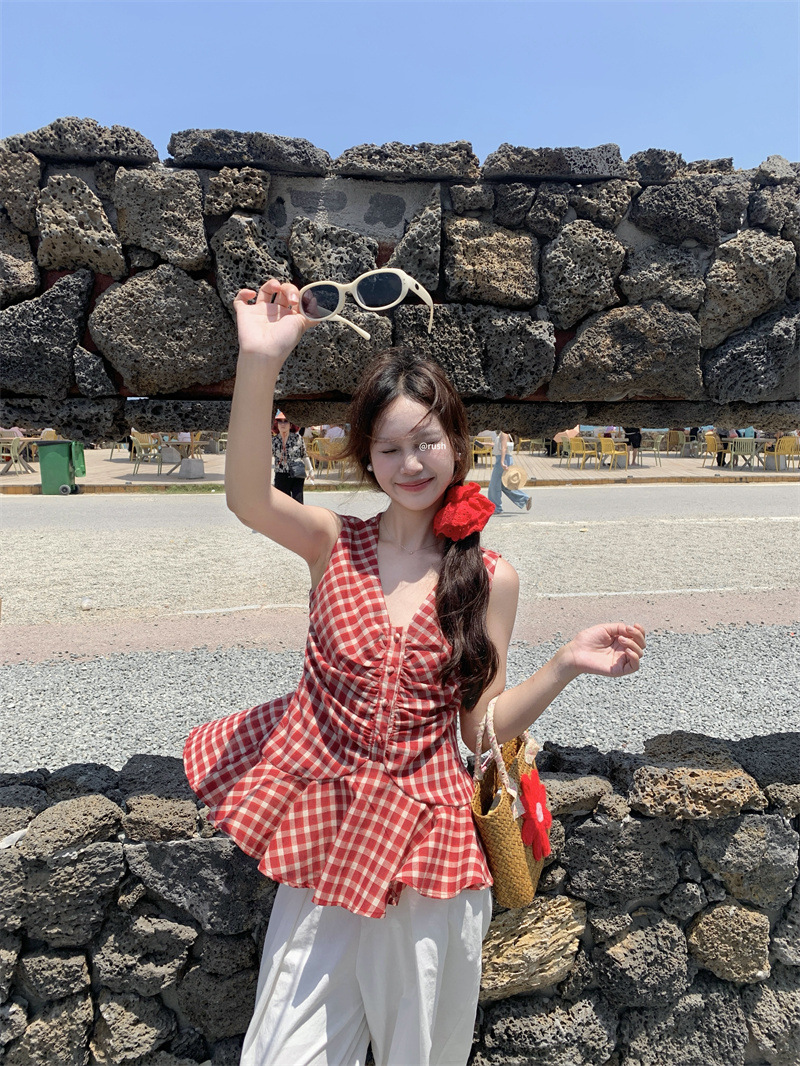 핫걸 스타일 V 넥 조끼 여성 2025 여름 신작 슬림핏 주름 아우터웨어 외국 스타일 서스펜더 탑