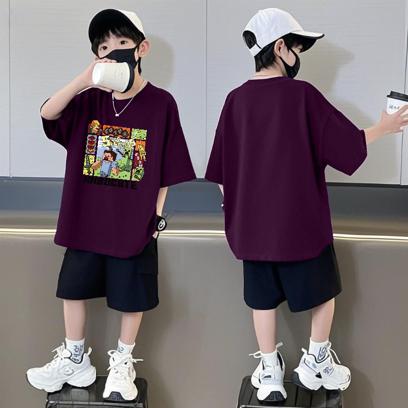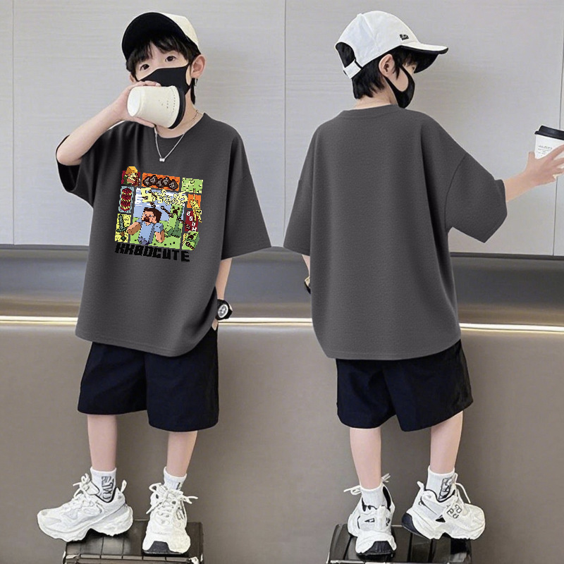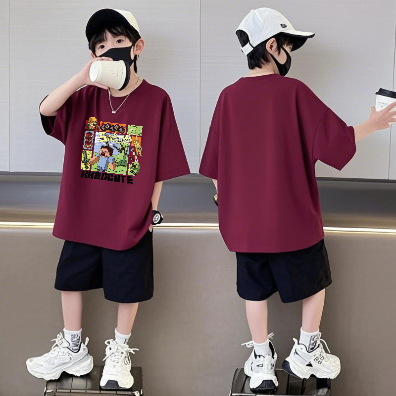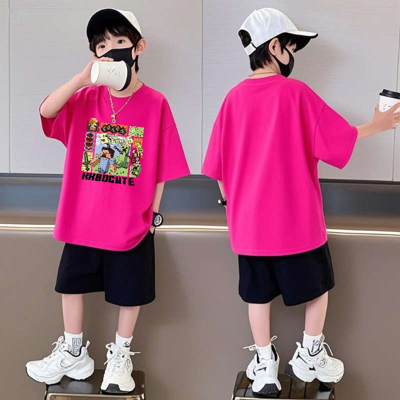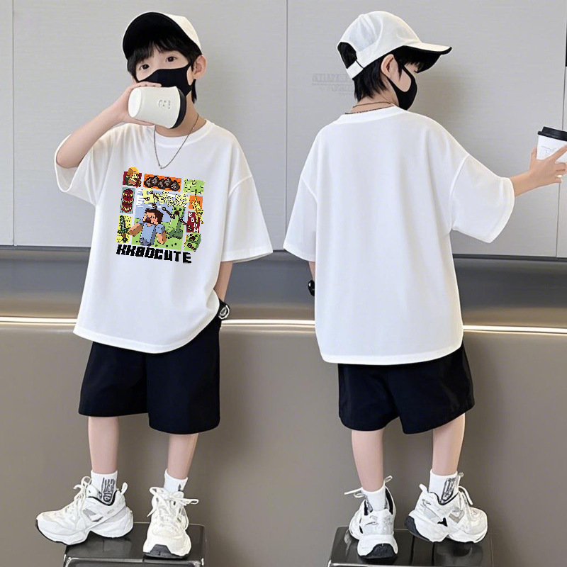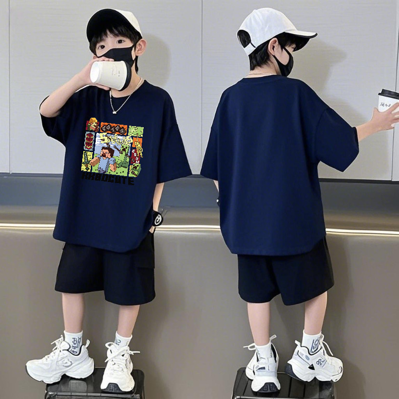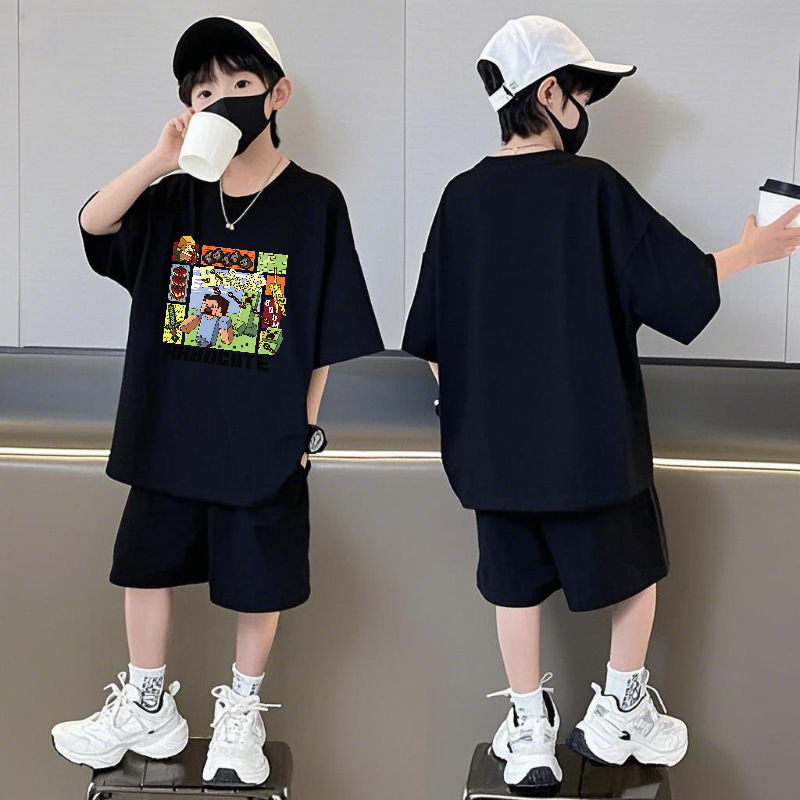 Minecraft 순면 반팔 반바지 소년 정장 여름 느슨한 스포츠 농구 유니폼 중형 및 대형 어린이 투피스 세트