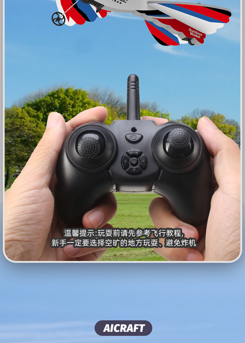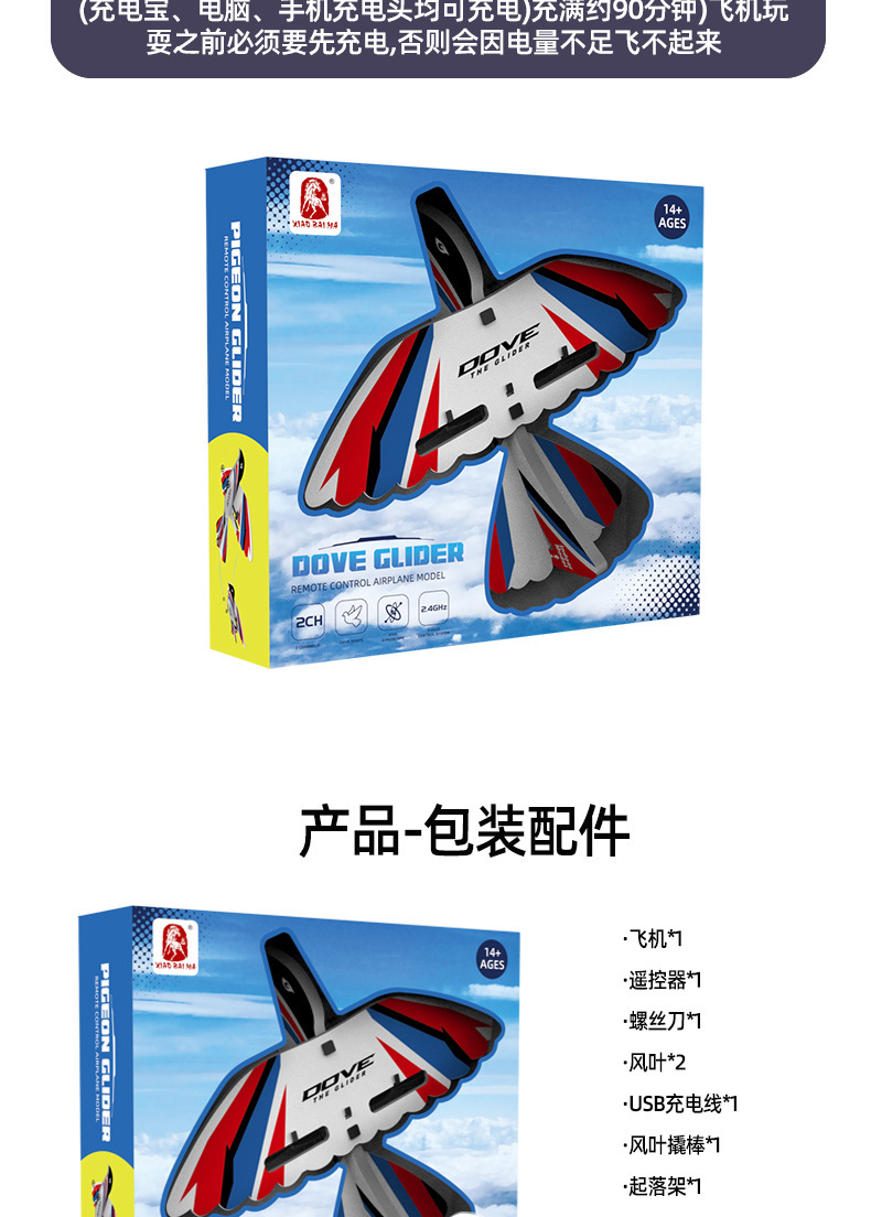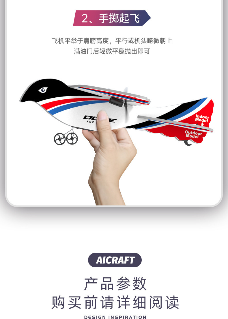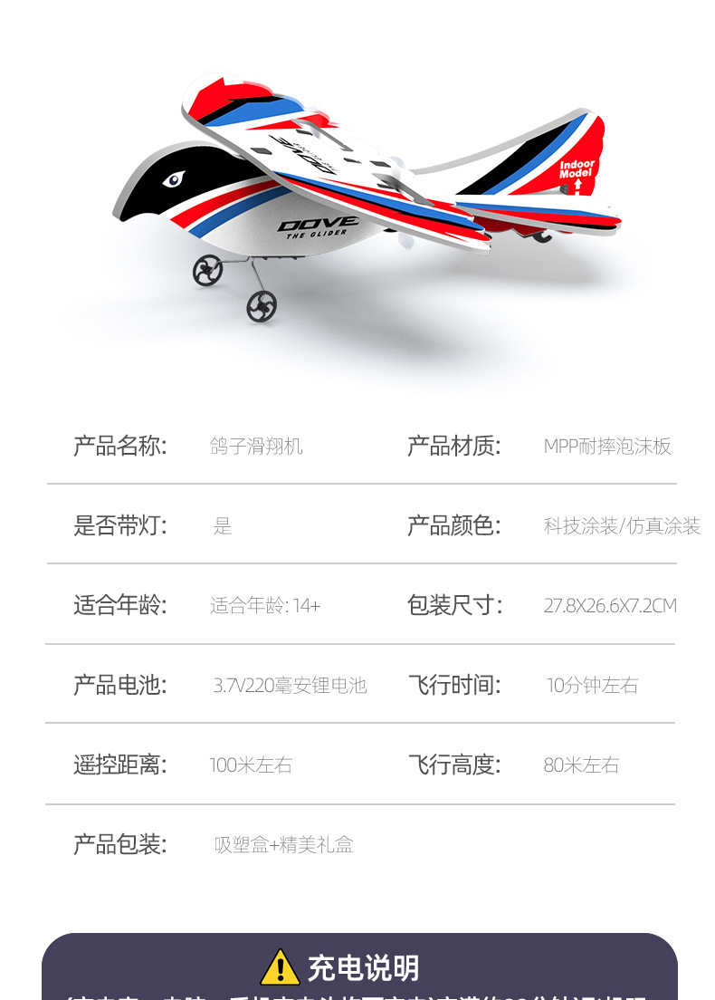 产品功能:室内/外模式,2通滑翔遥控飞机(上升,下降,左转,右转),可调节室内外。