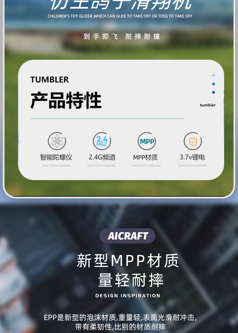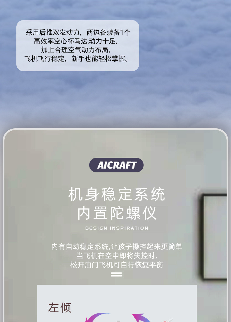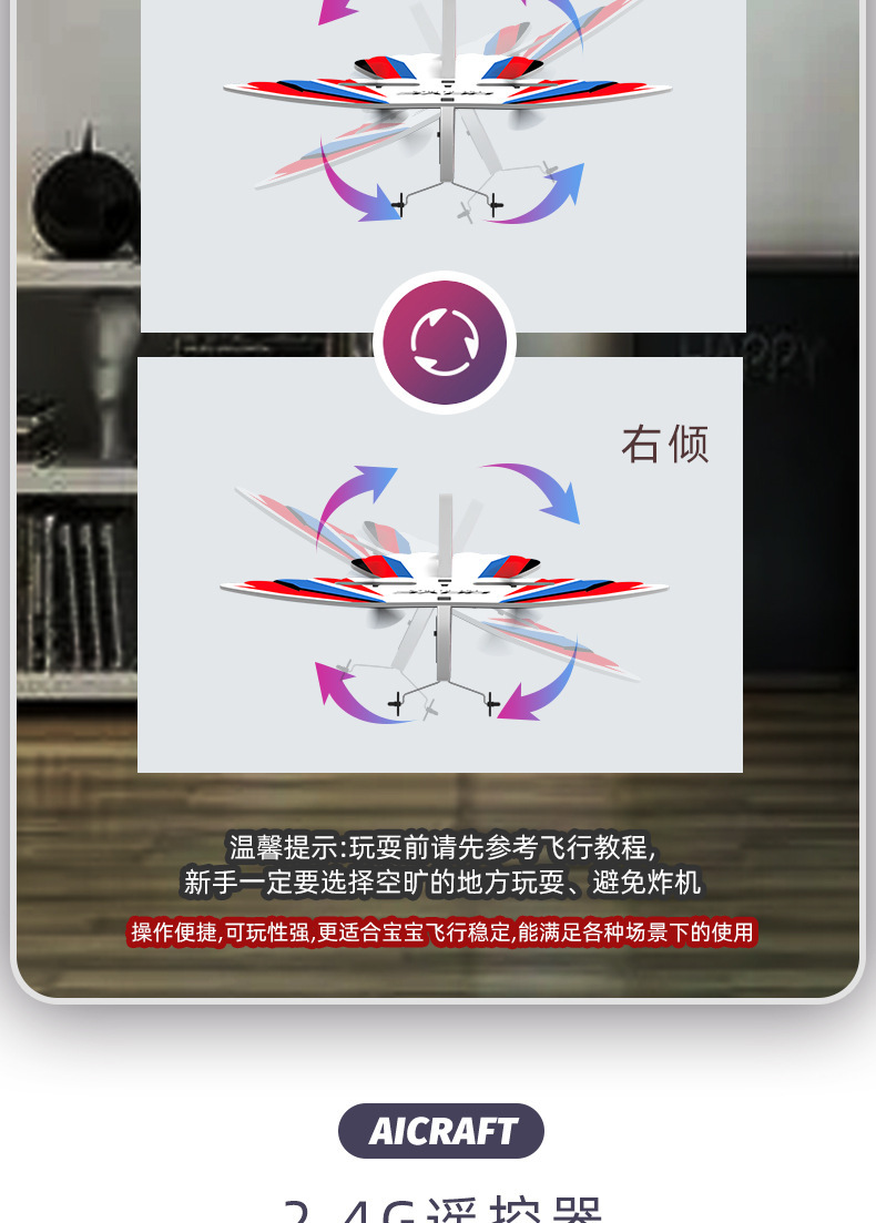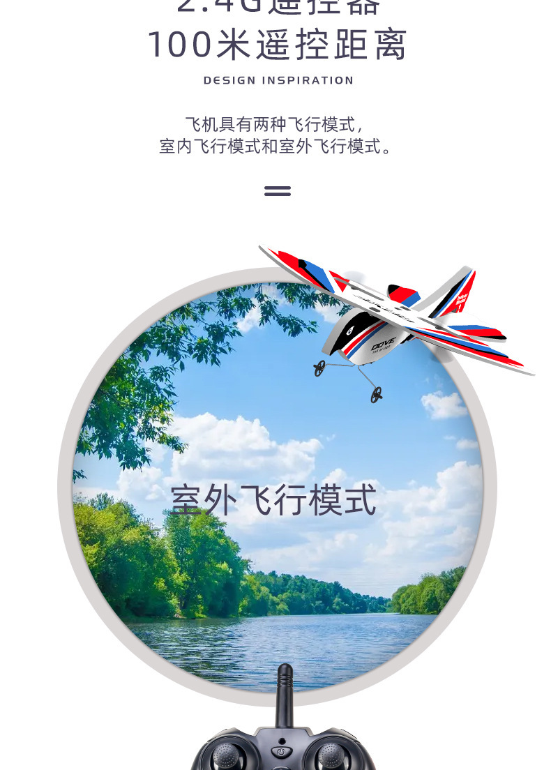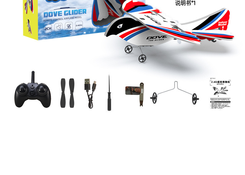 产品功能:室内/外模式,2通滑翔遥控飞机(上升,下降,左转,右转),可调节室内外。