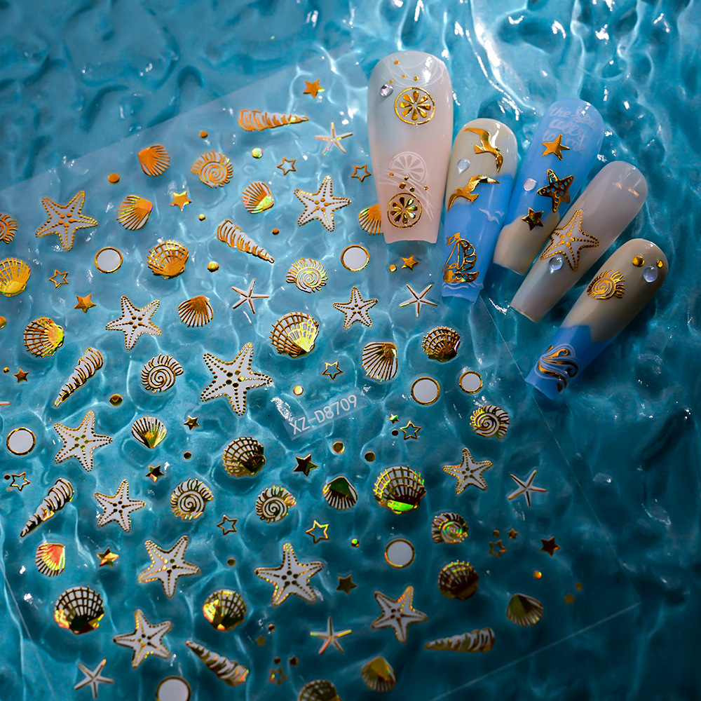 레이저 슈퍼 플래시 오션 네일 아트 스티커 3D 일반 밀가루 핫 스탬핑 쉘 조가비 불가사리 접착제 방수 네일 스티커스토어 가기
