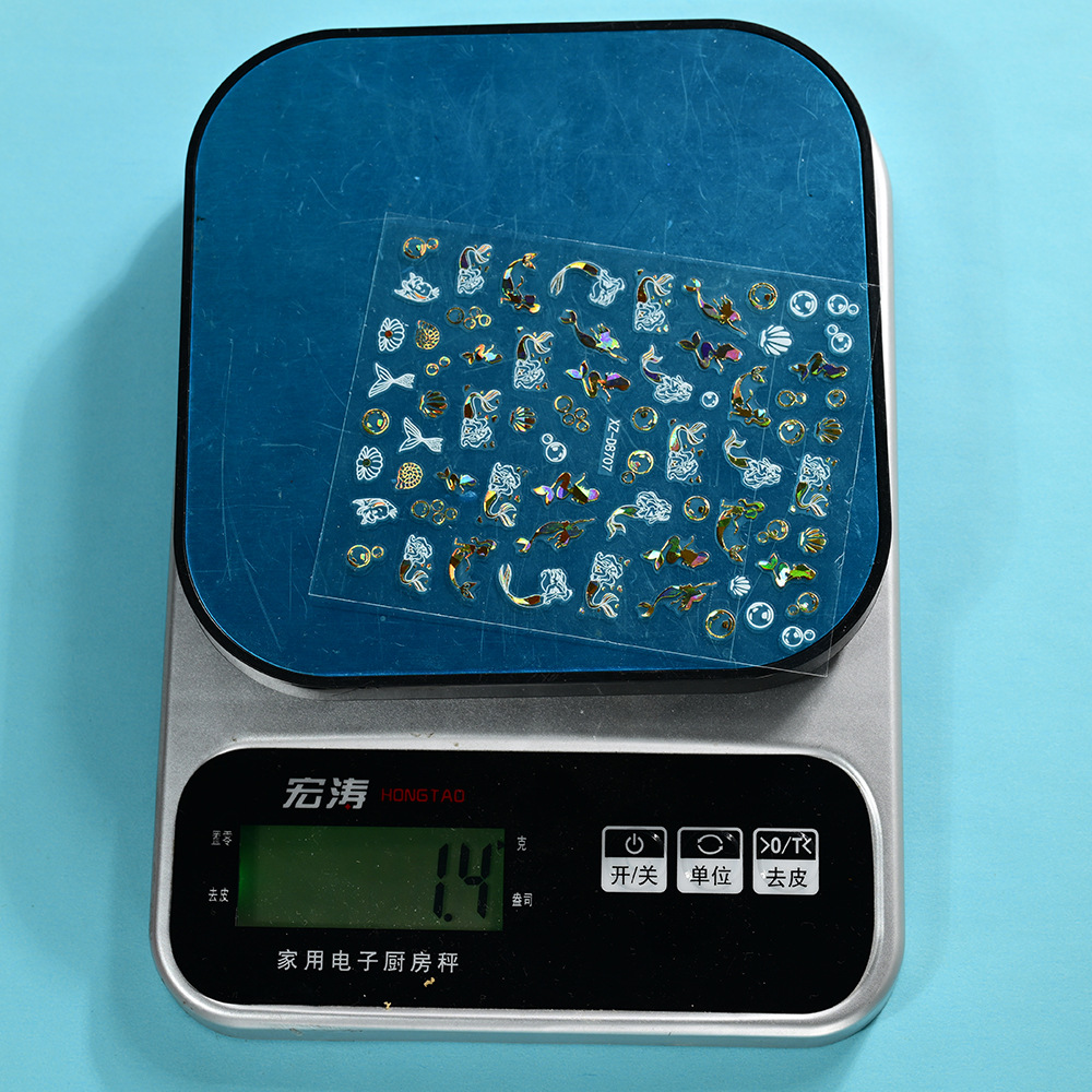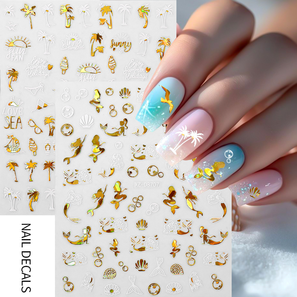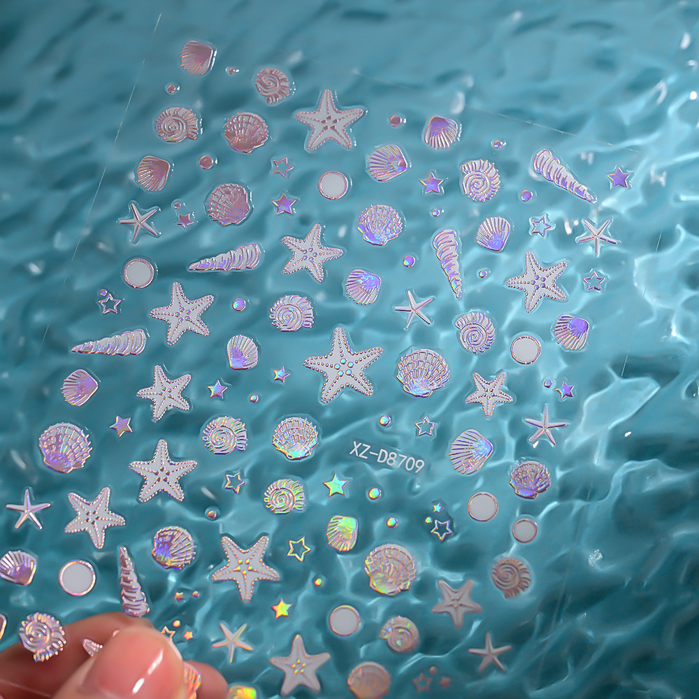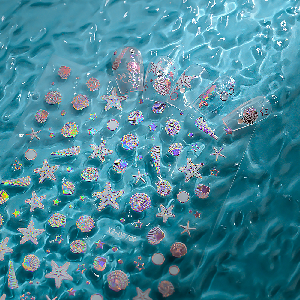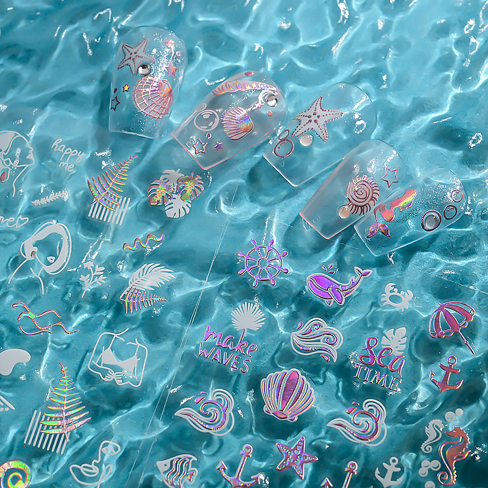 레이저 슈퍼 플래시 오션 네일 아트 스티커 3D 일반 밀가루 핫 스탬핑 쉘 조가비 불가사리 접착제 방수 네일 스티커