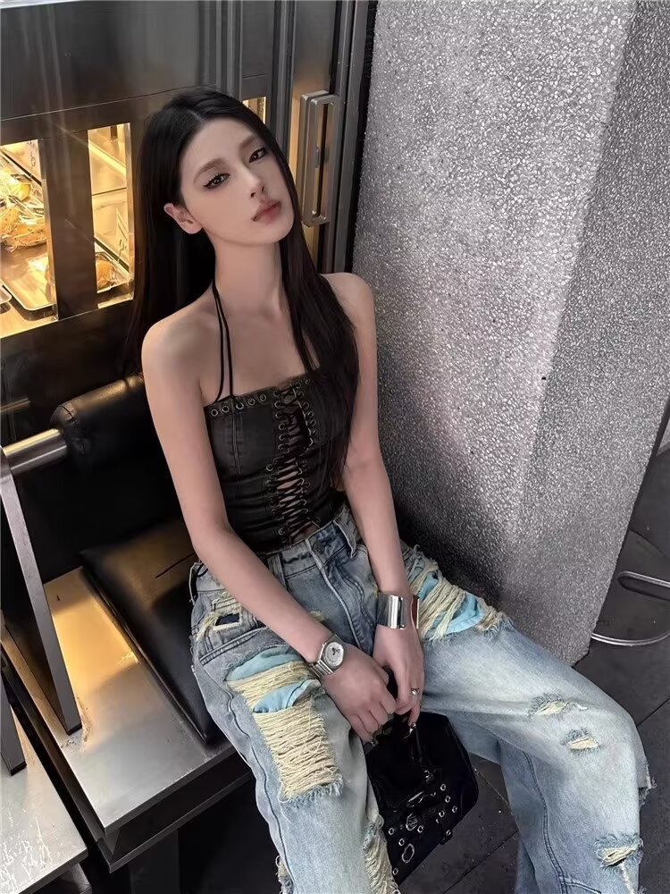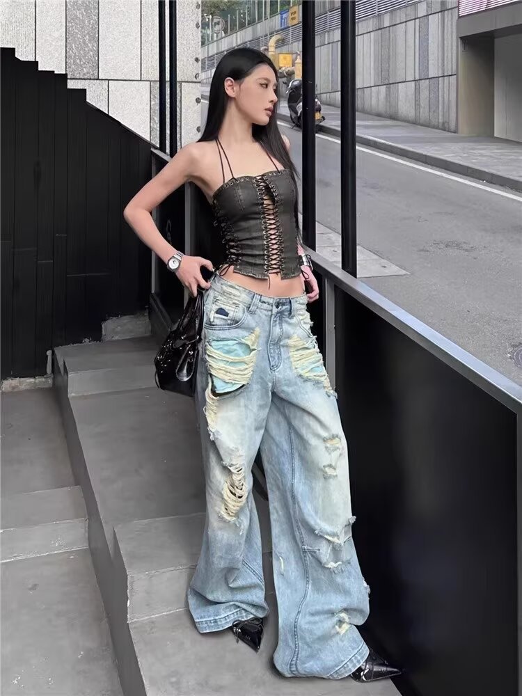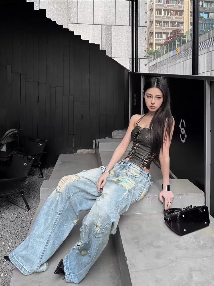 여름 여성을 위한 아메리칸 레트로 디스트레스드 워싱 청바지 새로운 스타일 로우 웨이스트 루즈 라이트 컬러 바닥 길이 스트레이트 바지스토어 가기