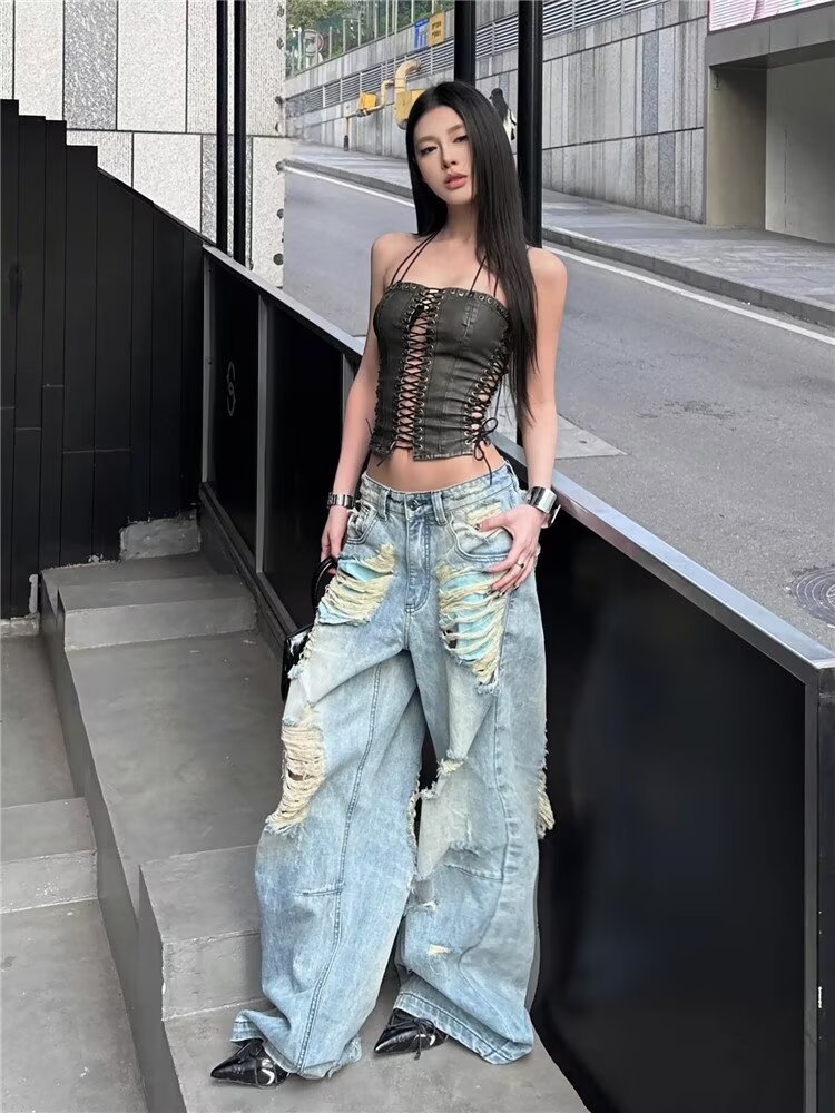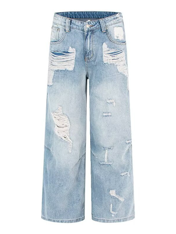 여름 여성을 위한 아메리칸 레트로 디스트레스드 워싱 청바지 새로운 스타일 로우 웨이스트 루즈 라이트 컬러 바닥 길이 스트레이트 바지
