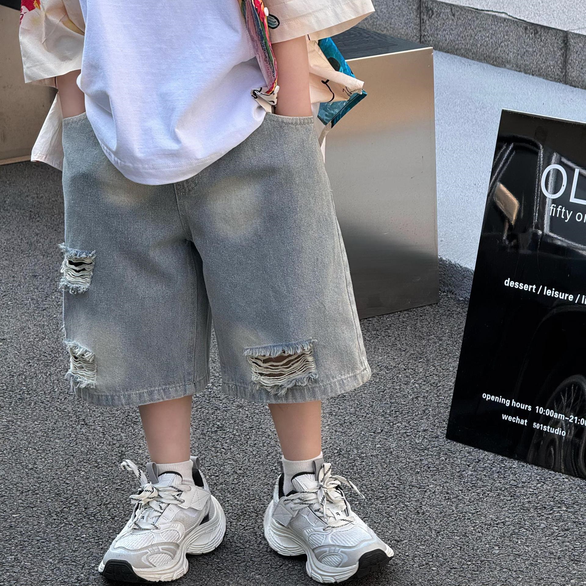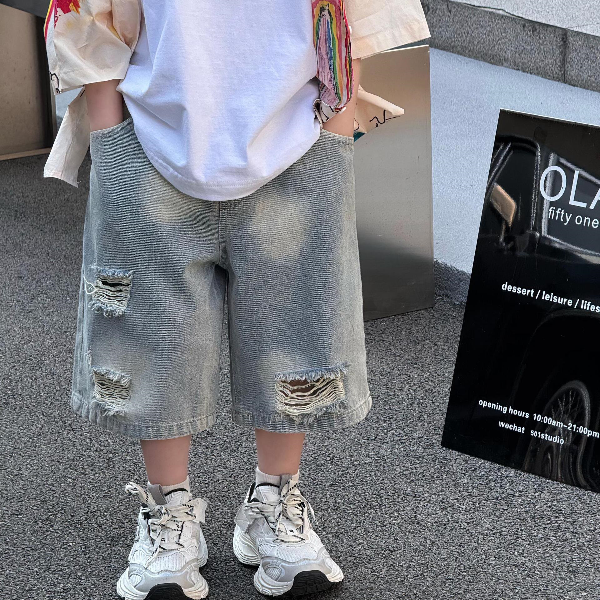 여름 신작 한국 스타일 소년 패션 다재다능한 심플 루즈 찢어진 청바지 아동 반바지 유행