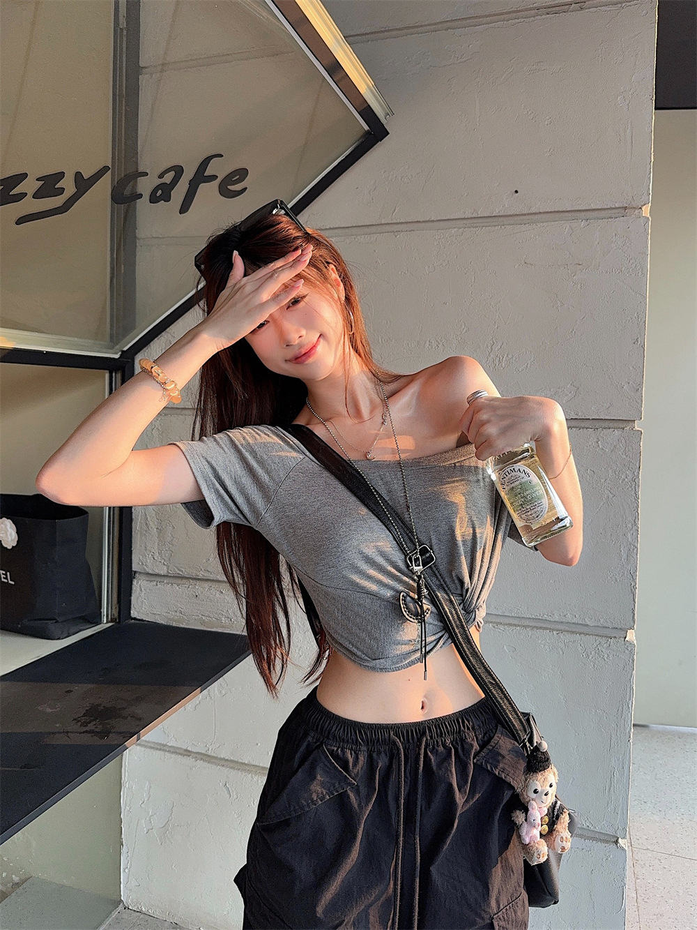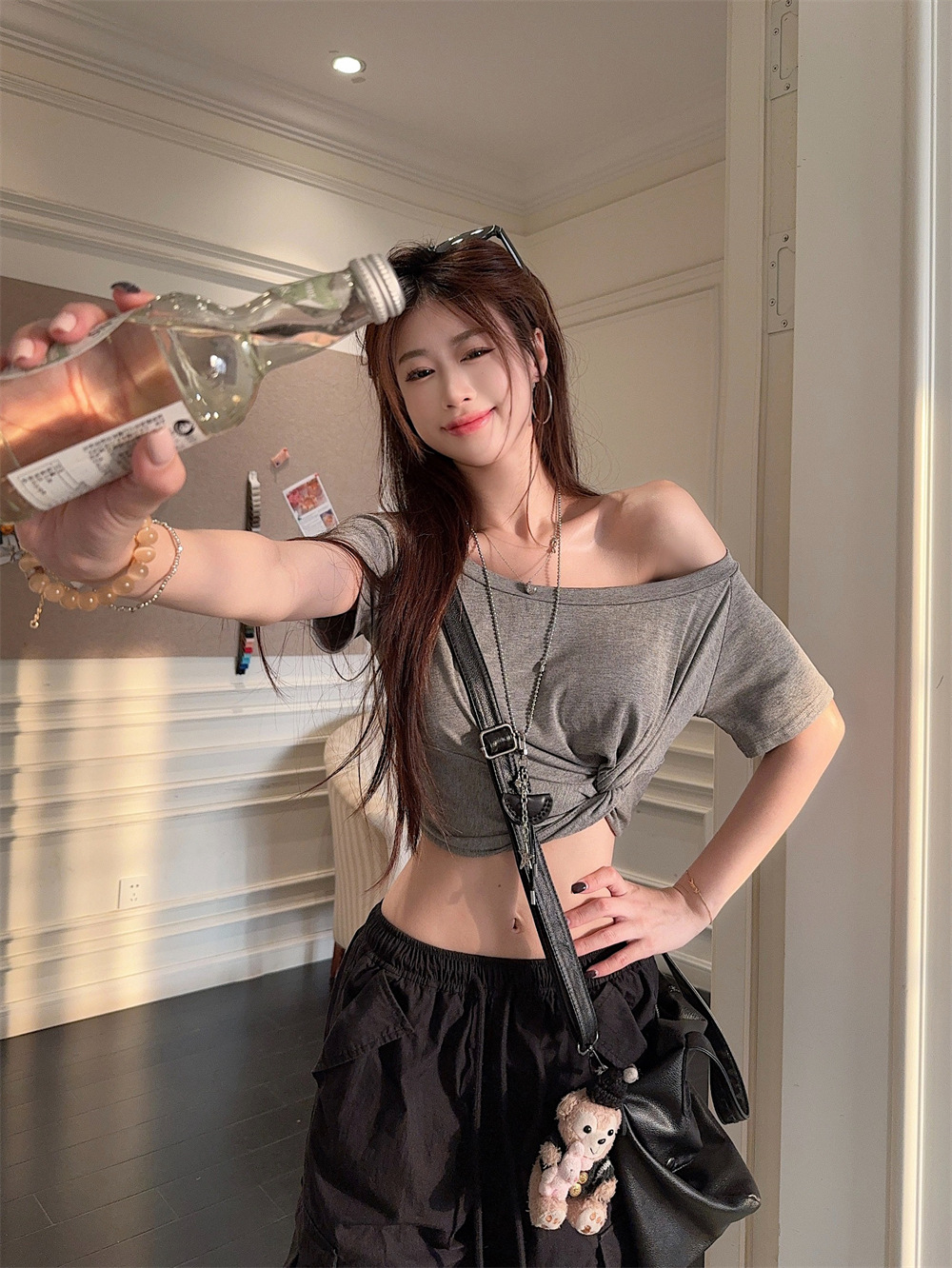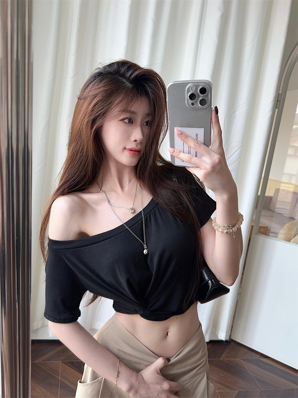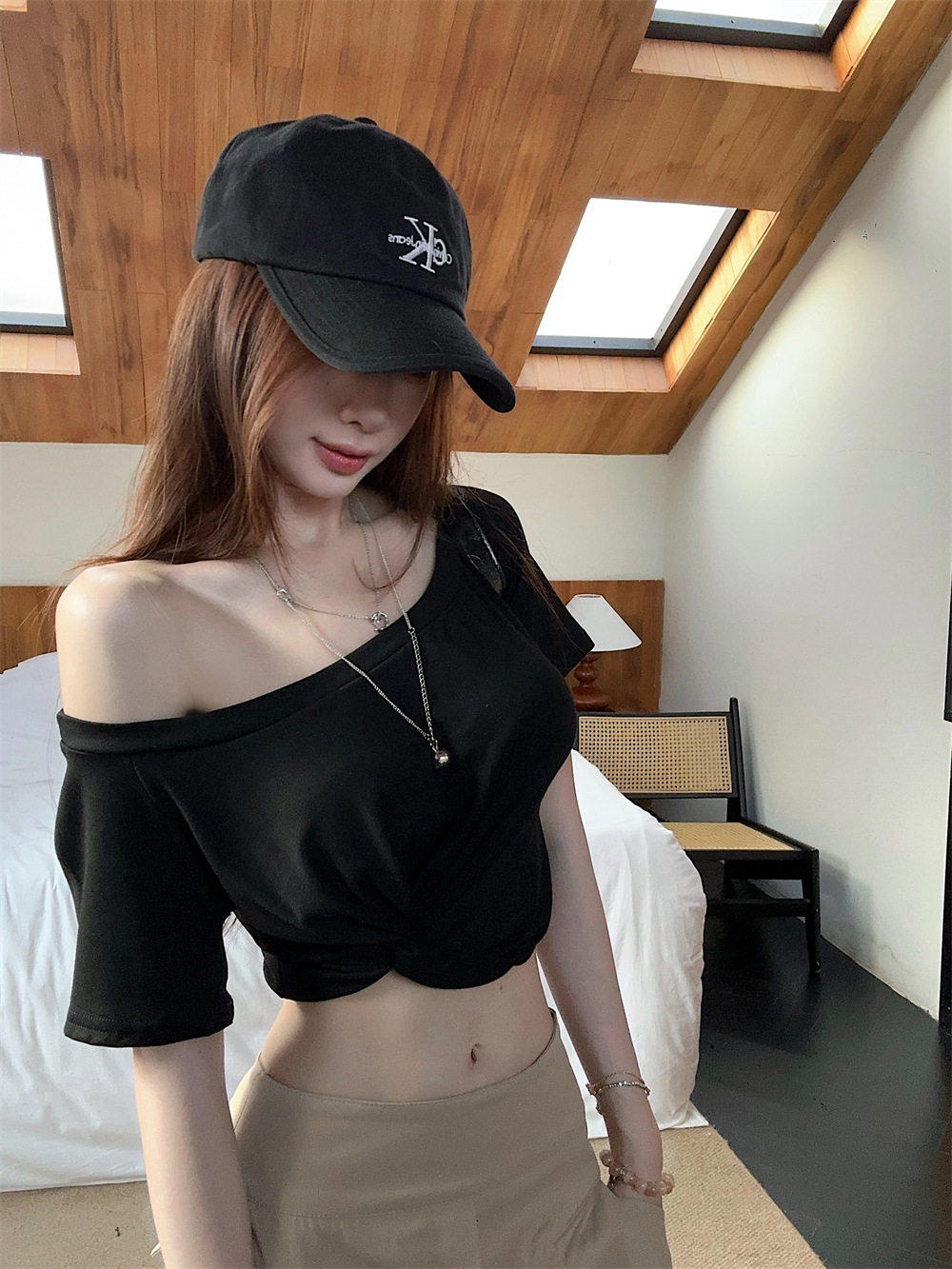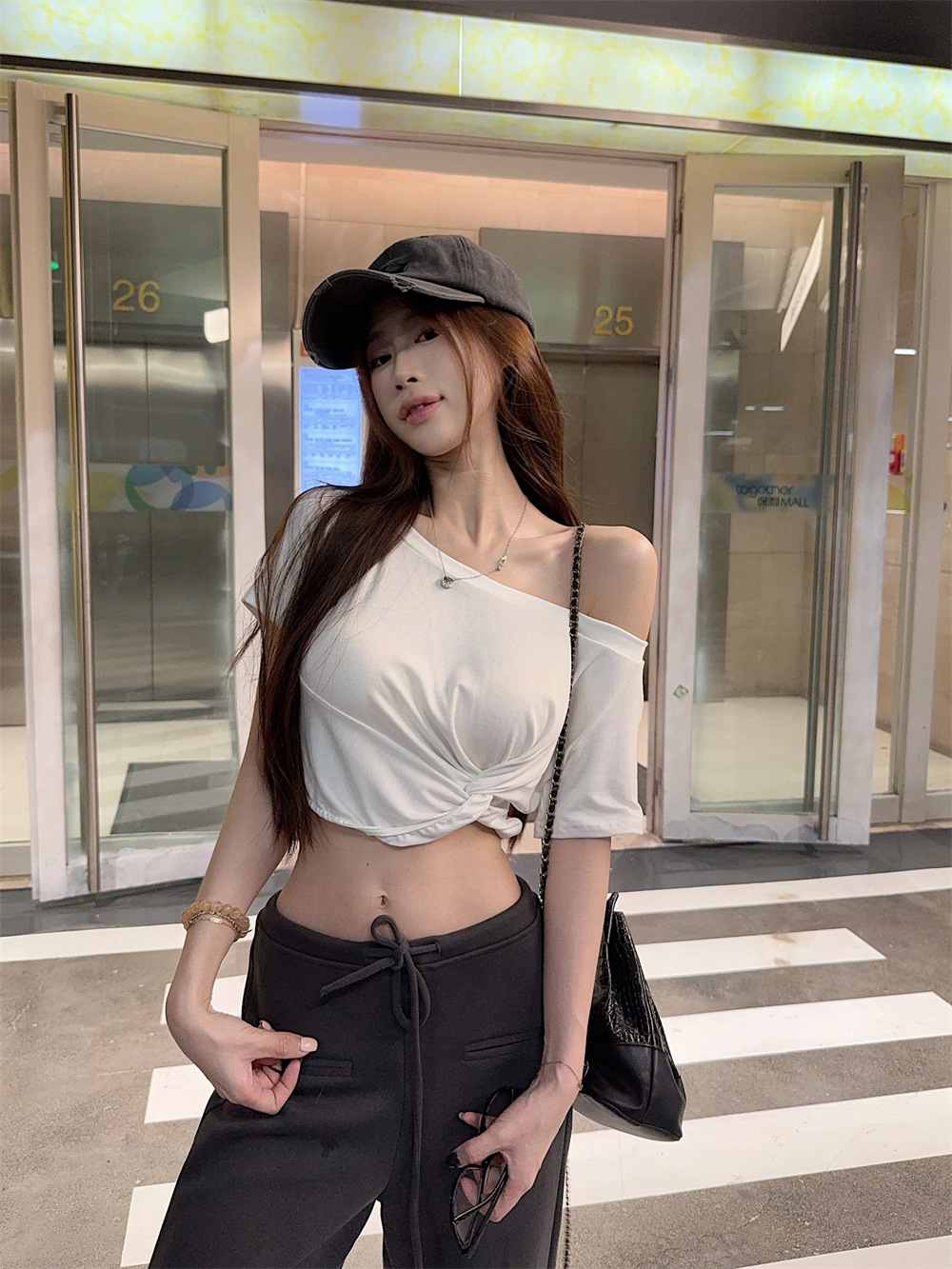 핫걸 화이트 오프숄더 반팔 티셔츠 여성 여름 트위스트 슬림 디자인 틈새 슬리밍 크롭 탑