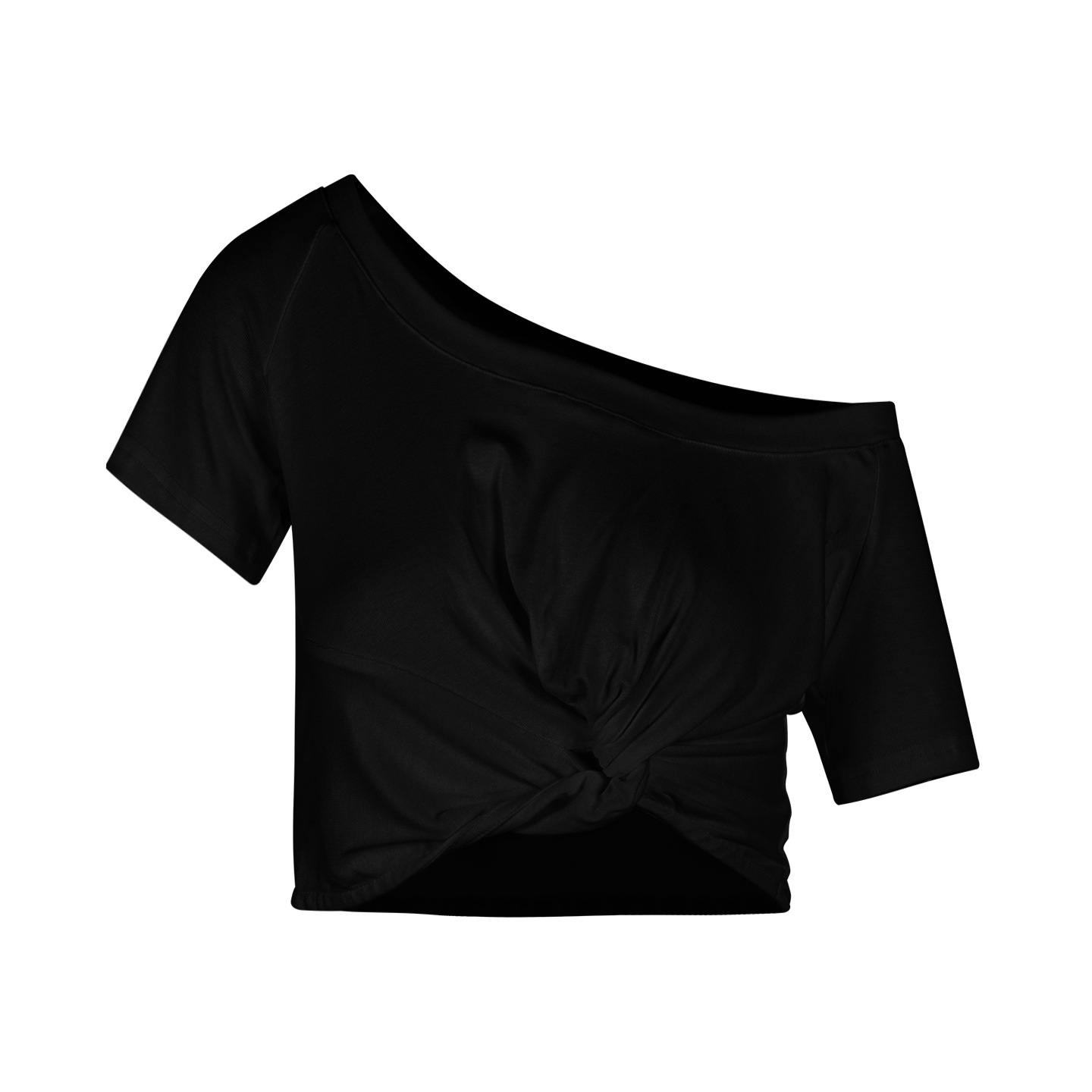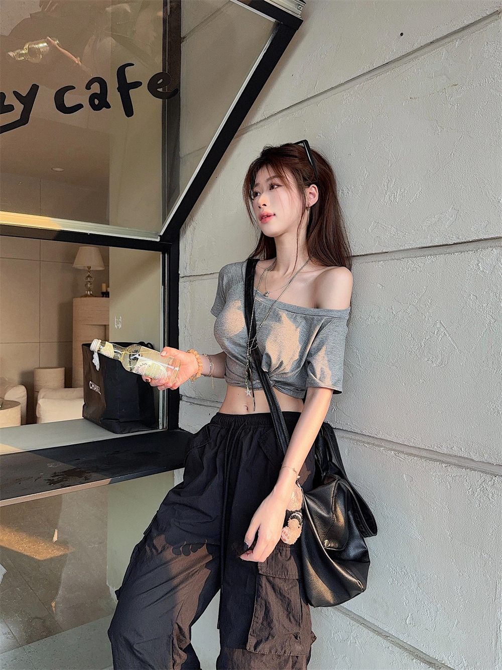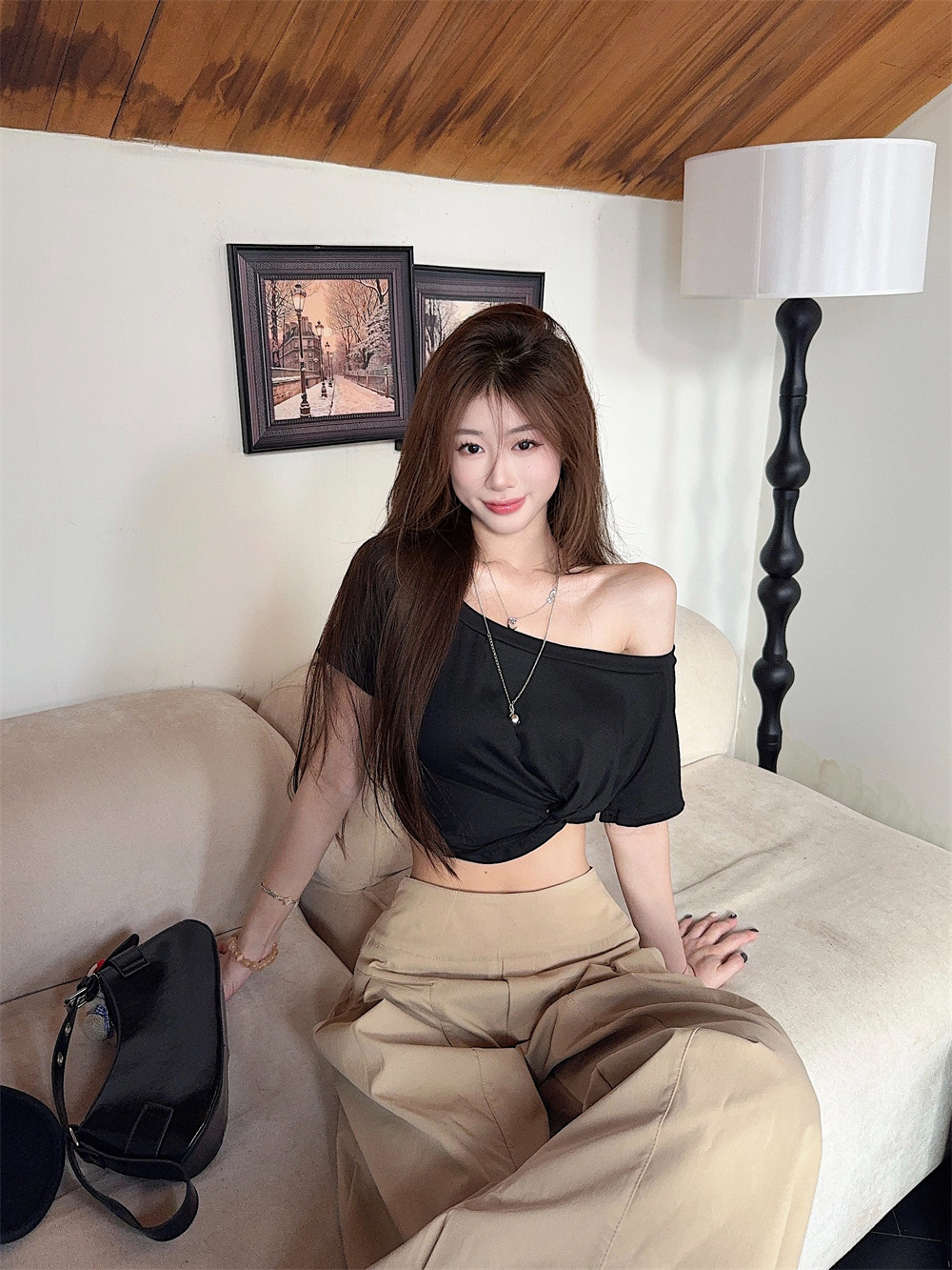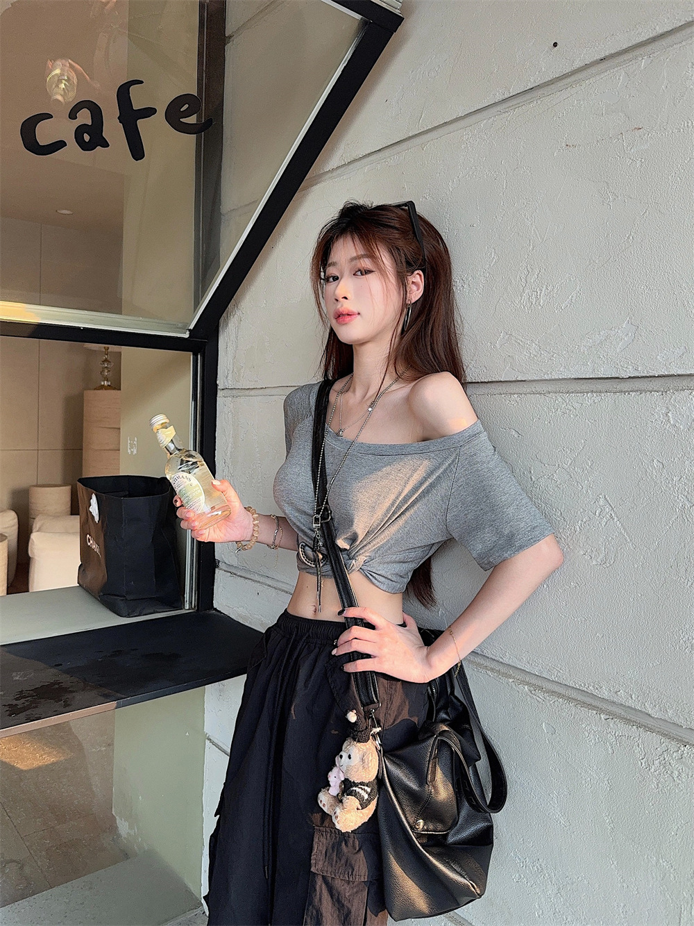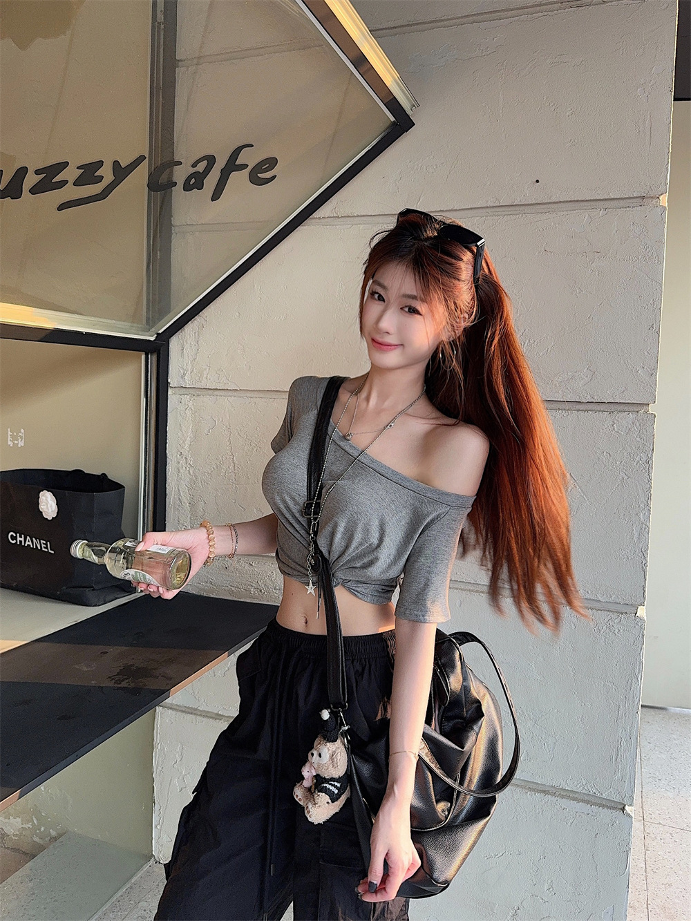 핫걸 화이트 오프숄더 반팔 티셔츠 여성 여름 트위스트 슬림 디자인 틈새 슬리밍 크롭 탑