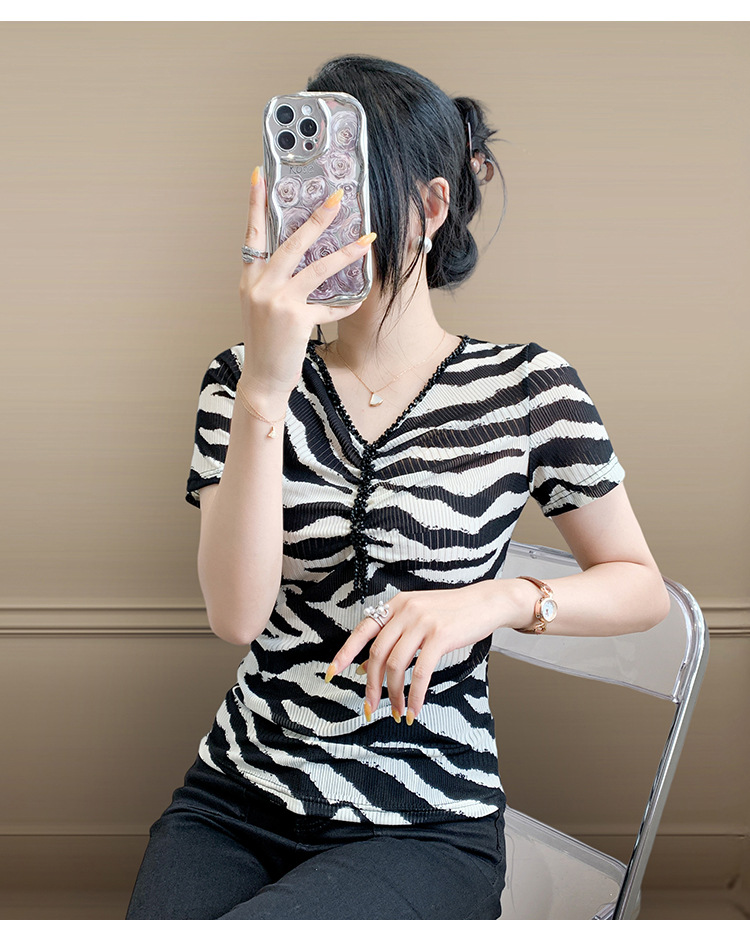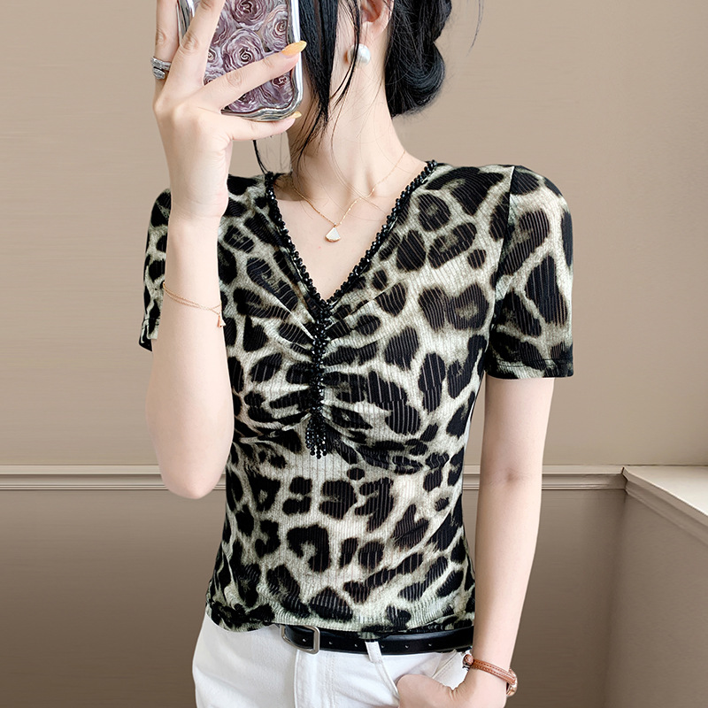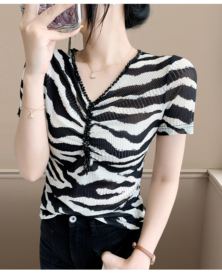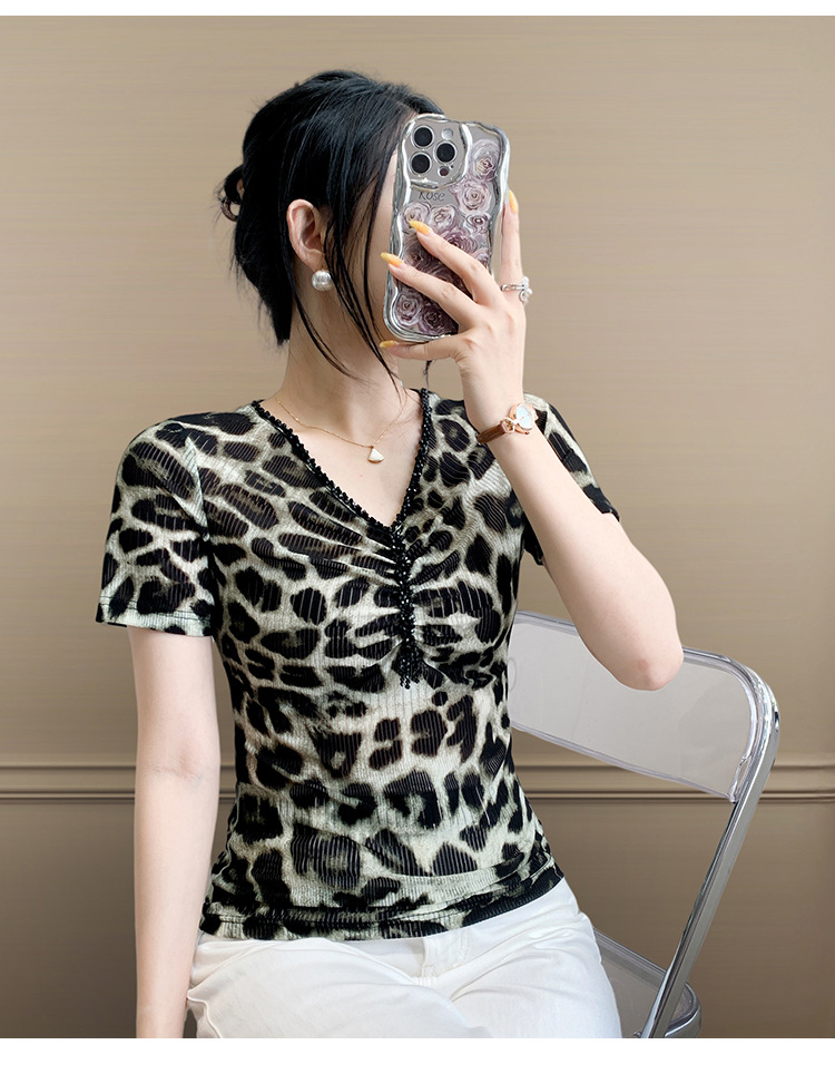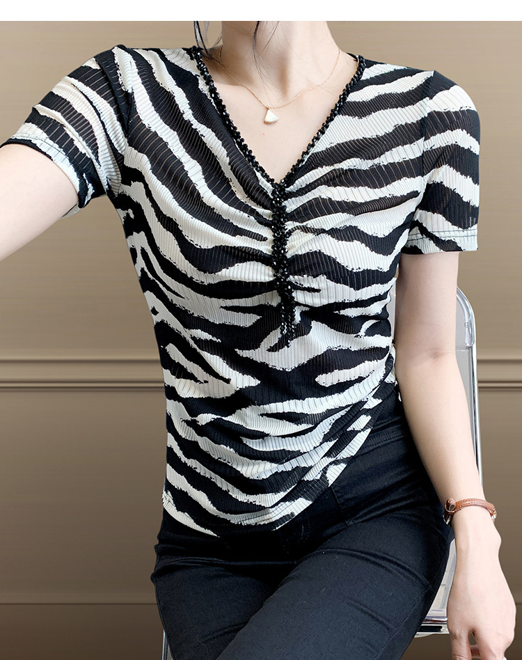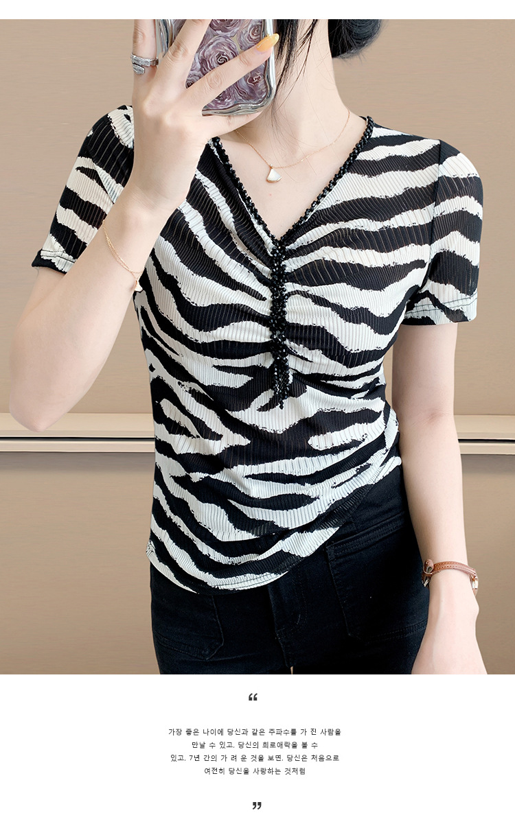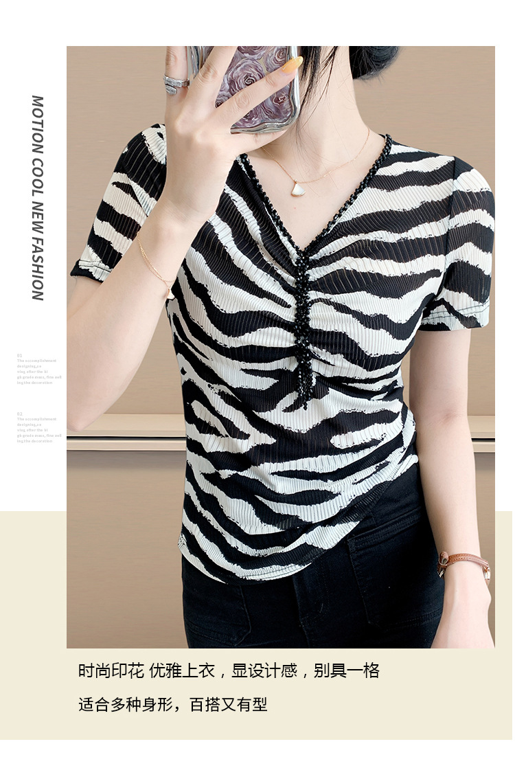 유럽 역 2025 새로운 반팔 티셔츠 여성 프린트 메쉬 v 넥 탑 하이 엔드 패션 여름 구슬 반팔스토어 가기