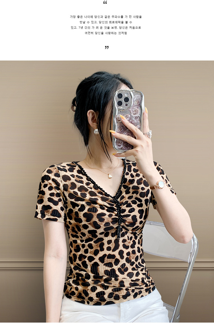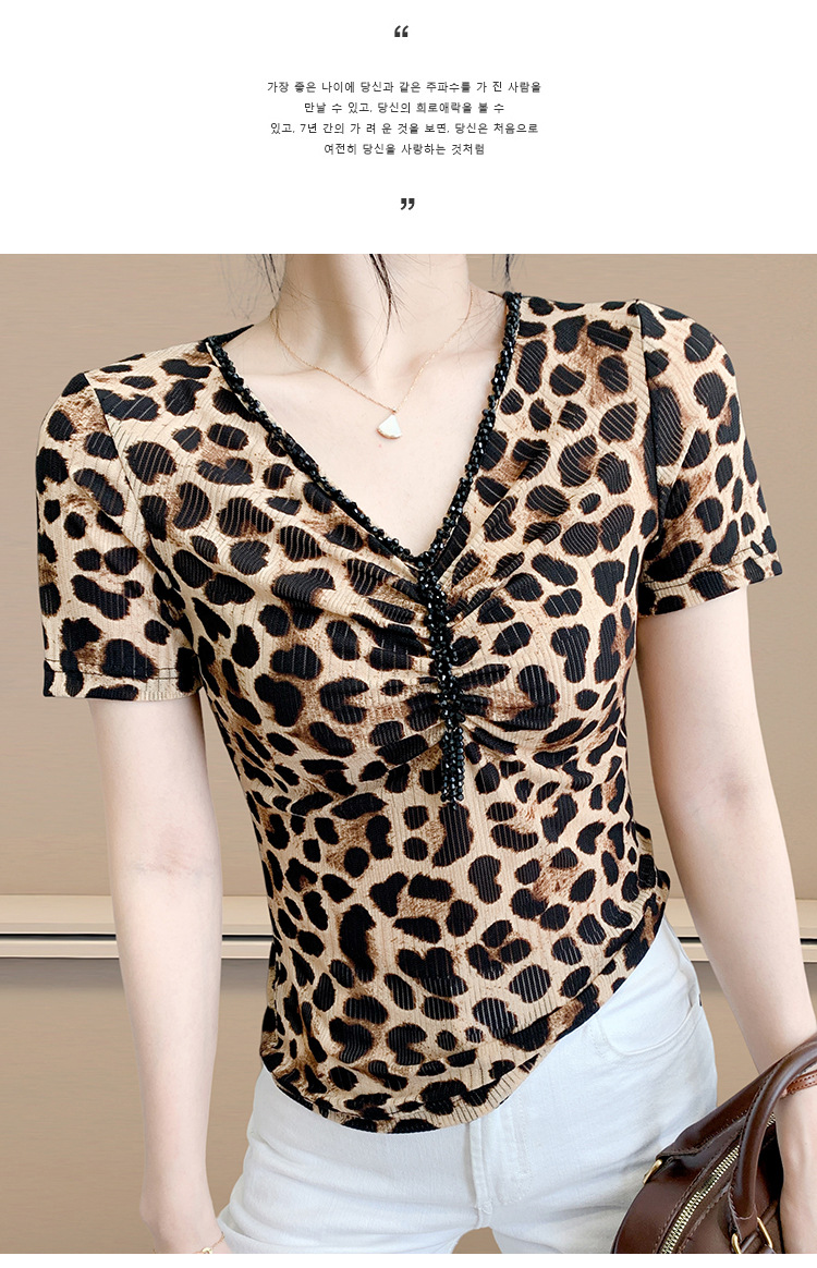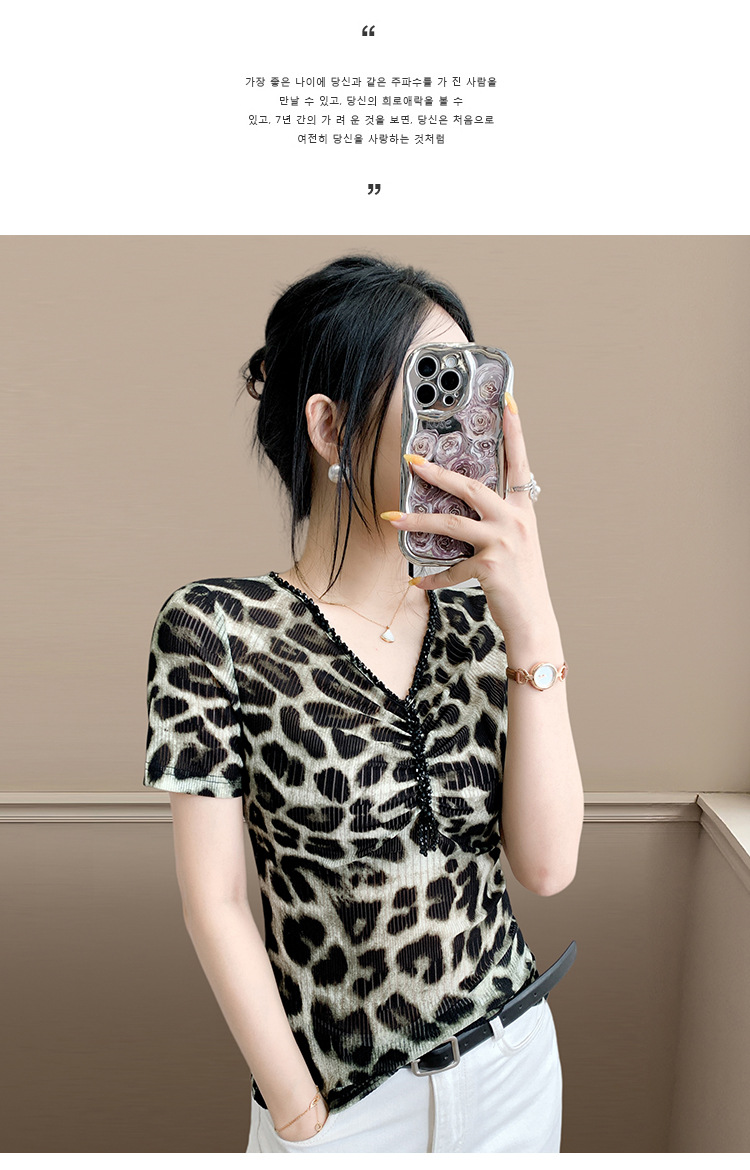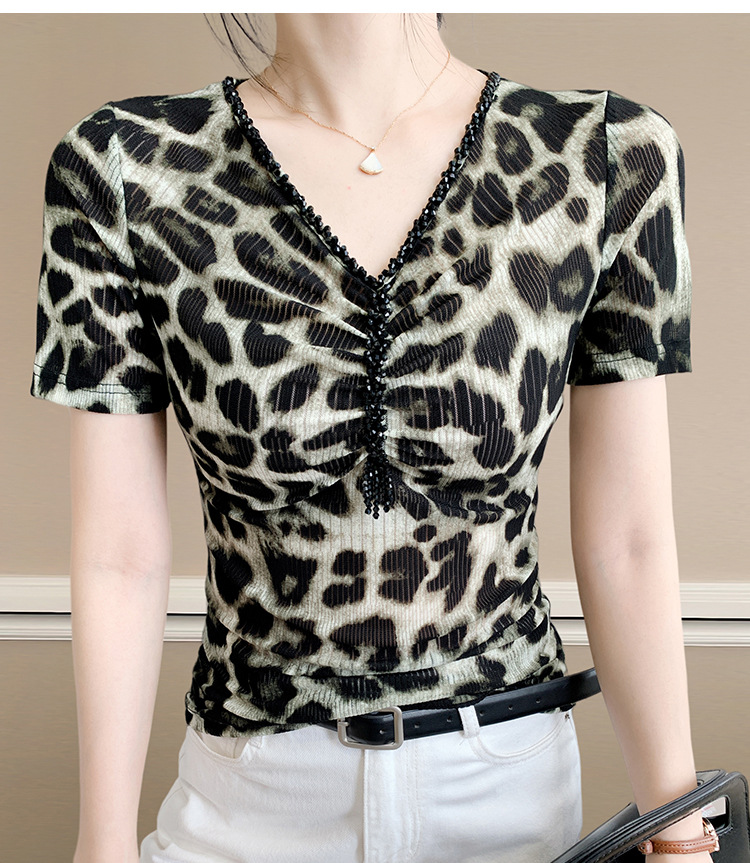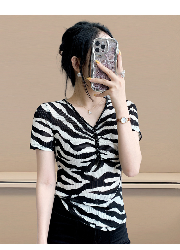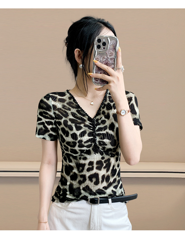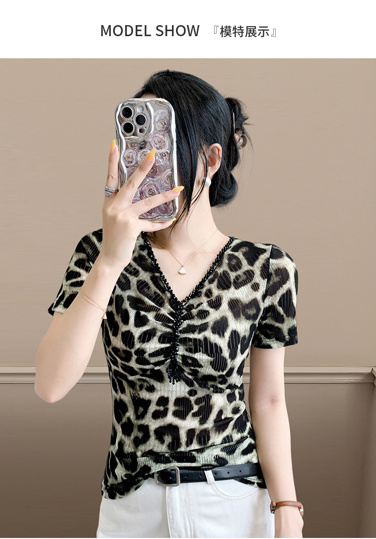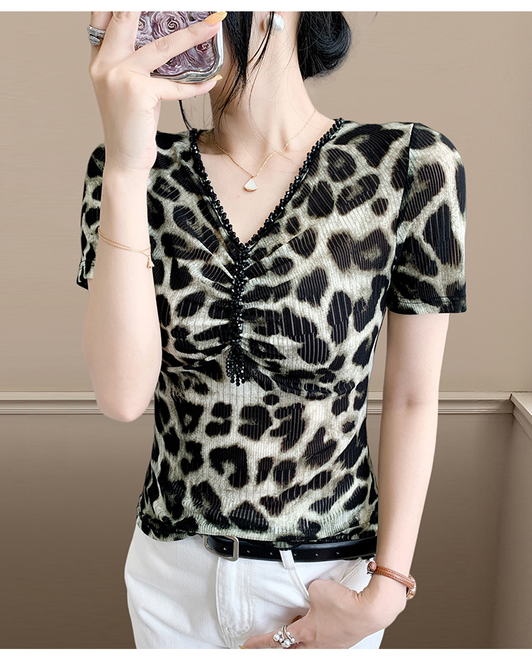 유럽 역 2025 새로운 반팔 티셔츠 여성 프린트 메쉬 v 넥 탑 하이 엔드 패션 여름 구슬 반팔스토어 가기