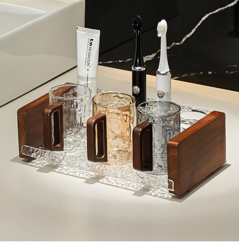 • 원목 손잡이 물 골판지 컵(호박색 1개 투명 1개) + 아카시아 나무 아크릴 칫솔 홀더
