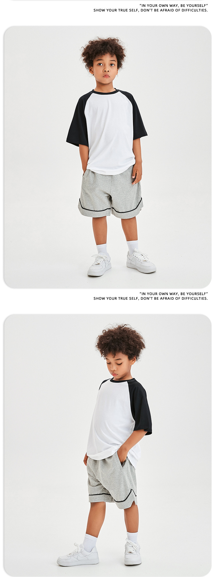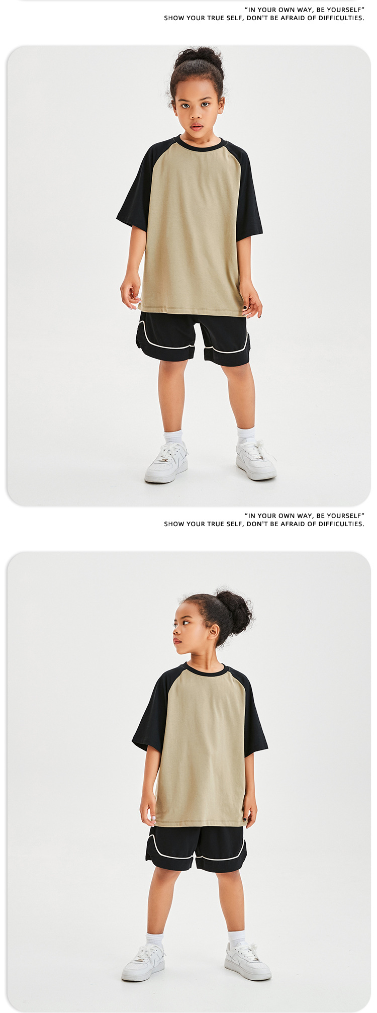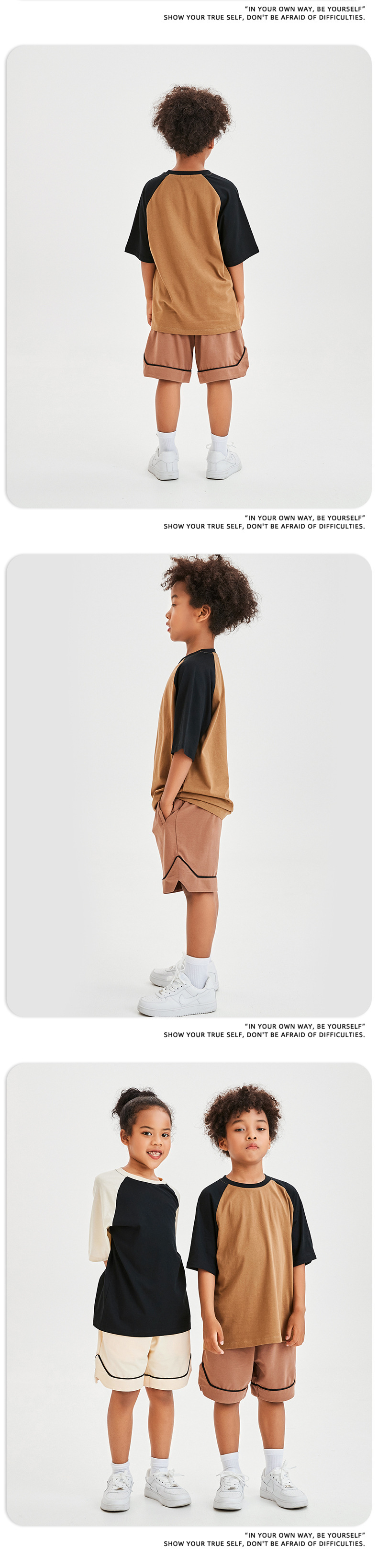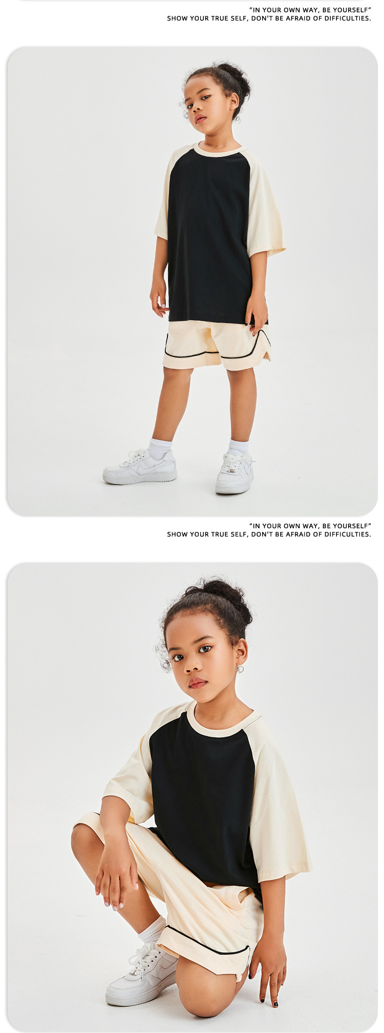 TILANI 아동복 유럽과 미국의 트렌디 브랜드 순면 남성과 여성의 대형 어린이 대비 색상 어깨 슬리브 학생 스포츠 루즈 투피스 세트