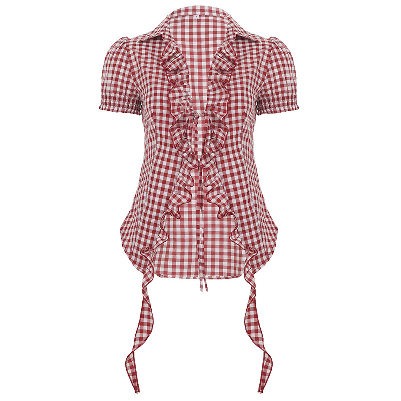 프렌치 레트로 레드 체크 무늬 셔츠 탑 신작 여성용 주름 장식 레이스 업 퍼프 슬리브 반소매 티셔츠스토어 가기