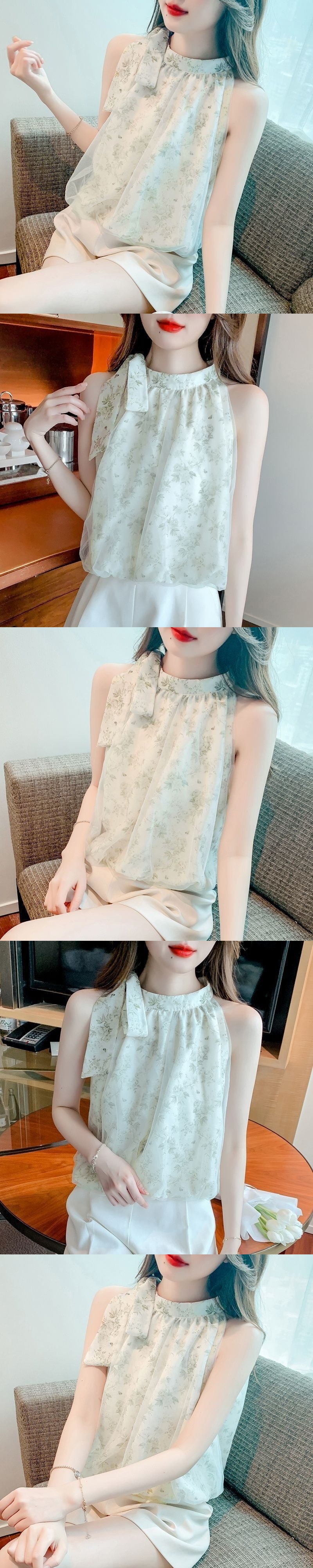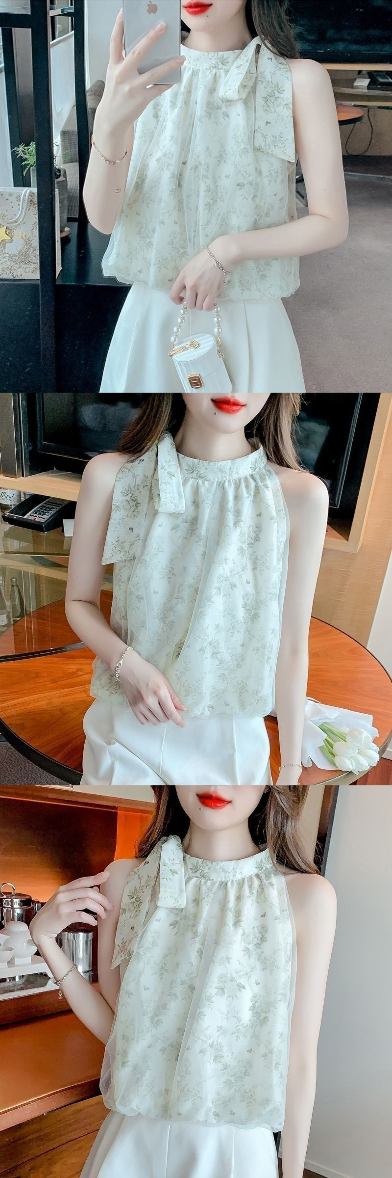여성을위한 프랑스 꽃 민소매 조끼 쉬폰 셔츠 여름 2023 새로운 한국 스타일 틈새 기질 오프 숄더 홀터 탑스토어 가기