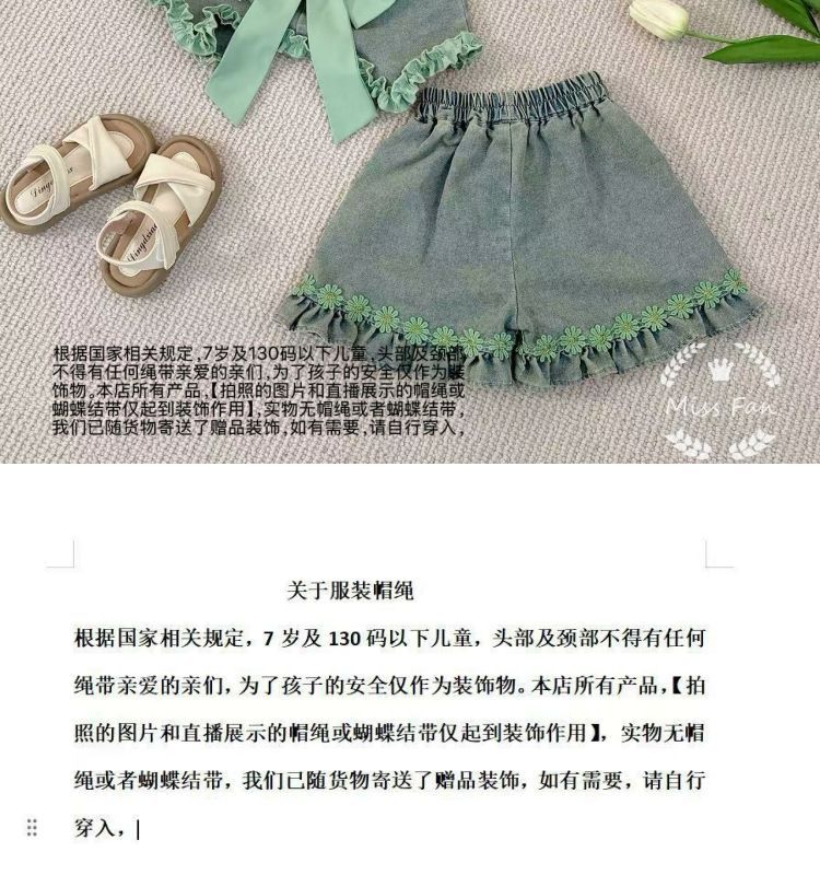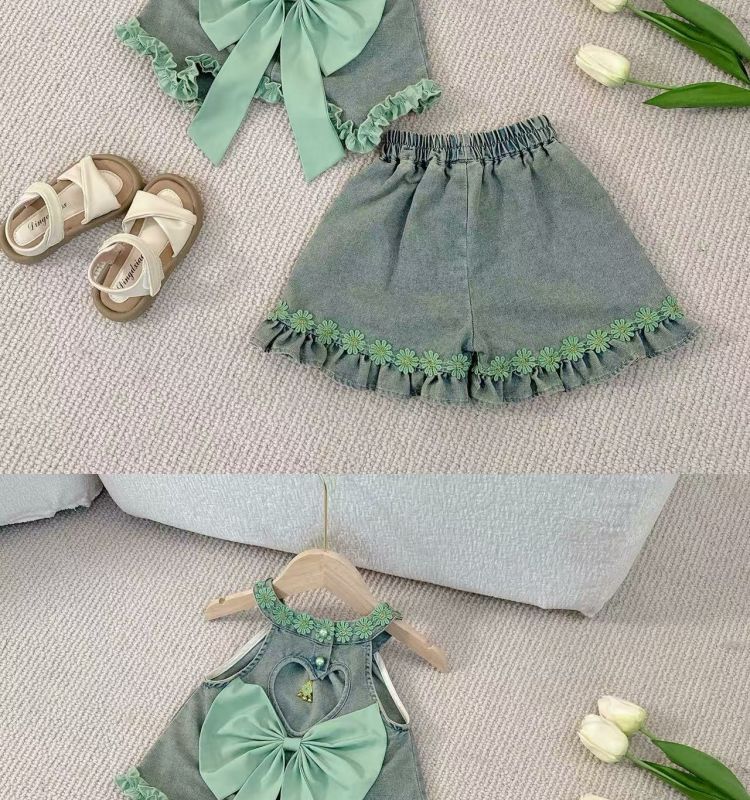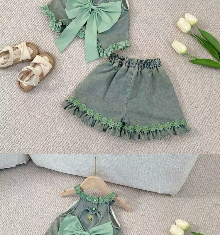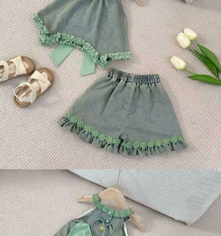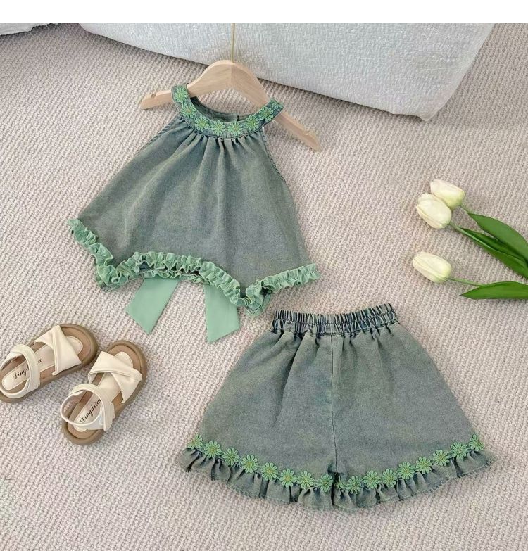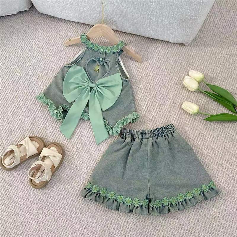 2025 여름 소녀의 세련된 데님 스플 라이스 자수 반바지 정장 투피스 세트 소녀 소프트 데님 민소매스토어 가기
