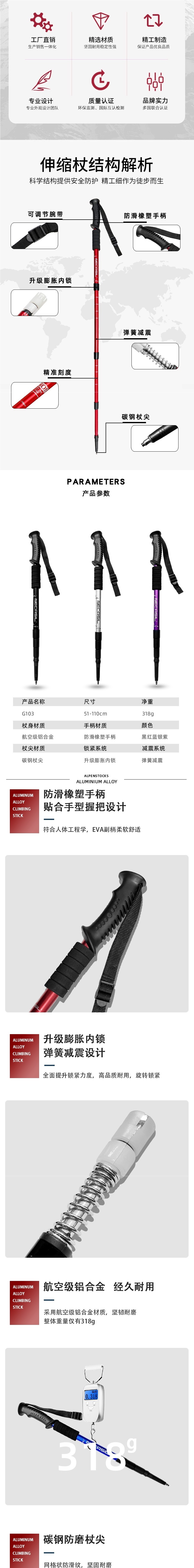 • 4개 섹션 텔레스코픽 | 스트레이트 핸들 레드 50-110cm (충격 흡수 시스템 내장)