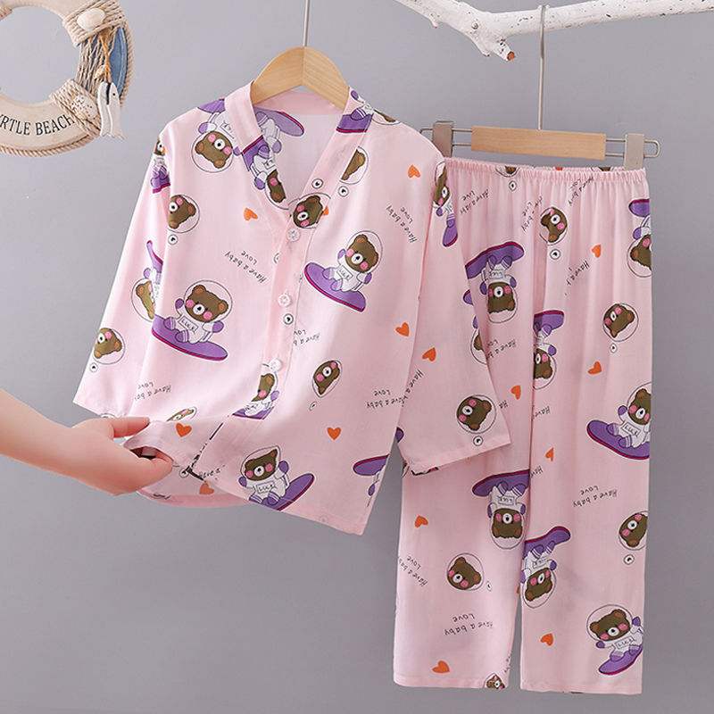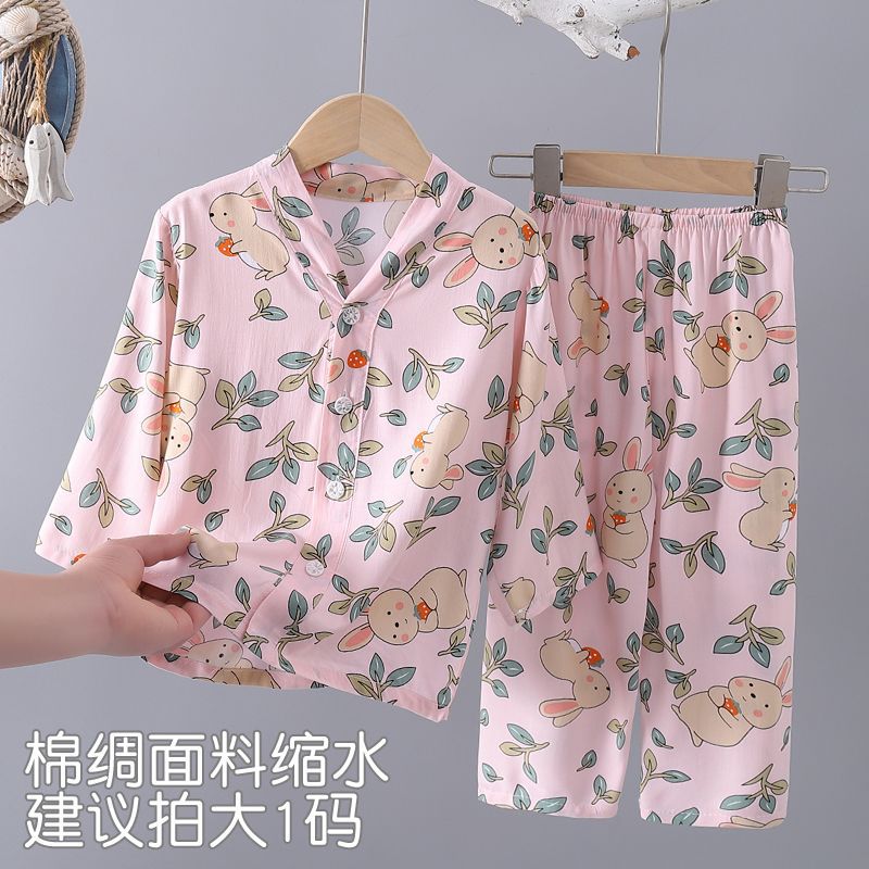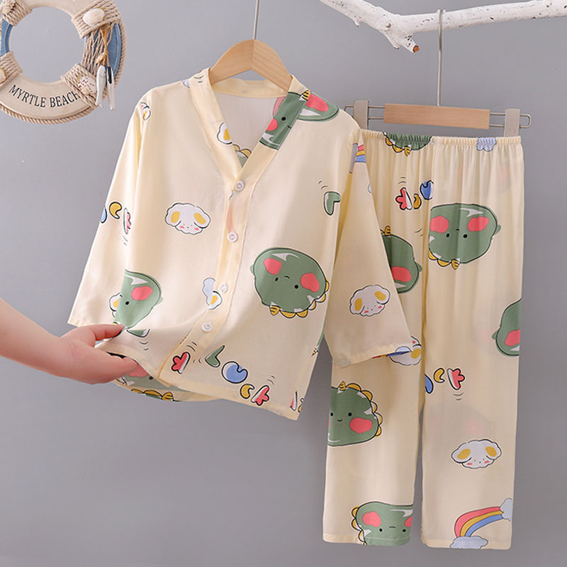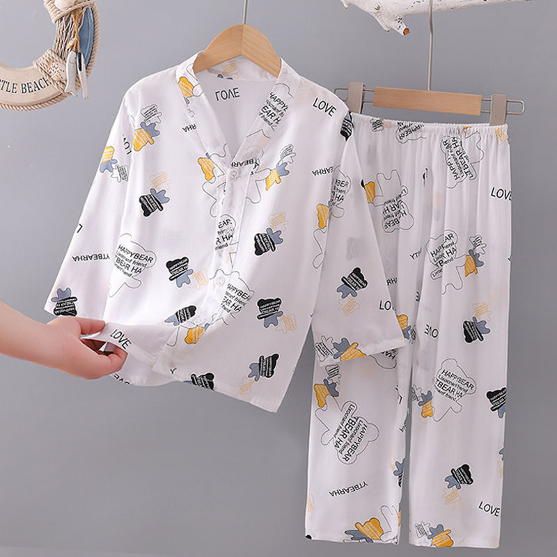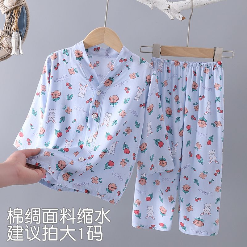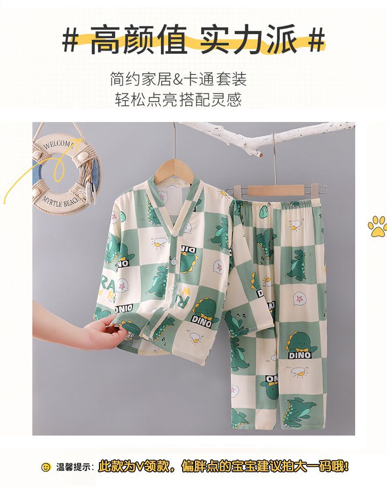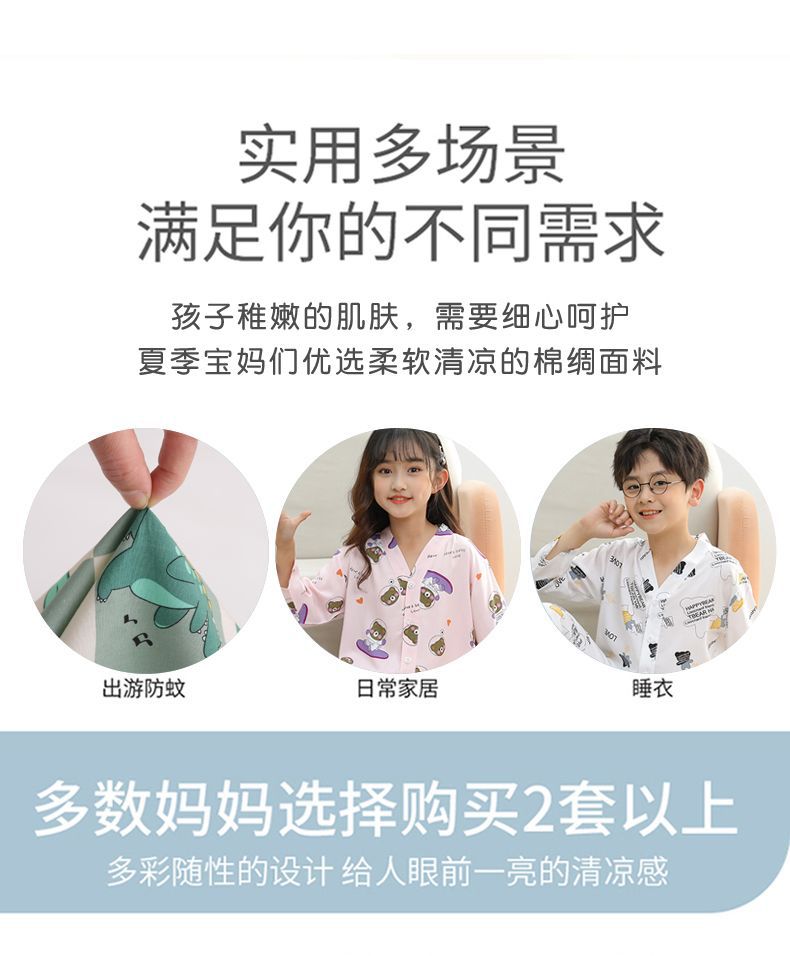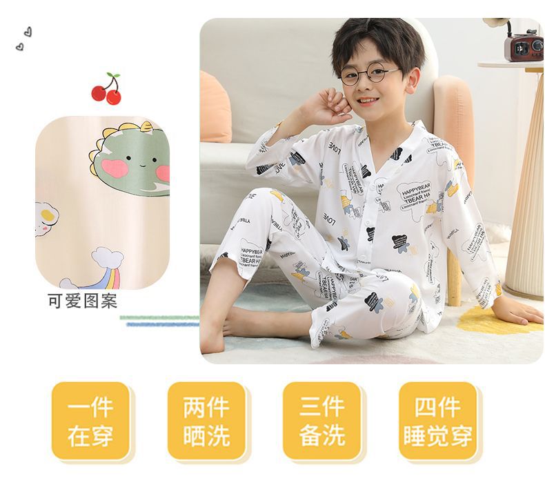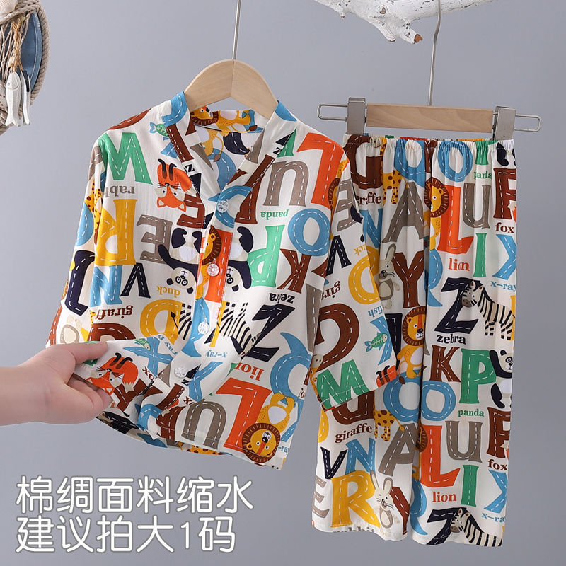 여름 어린이 면 실크 잠옷 얇은 칼라 긴팔 소년 면 실크 에어컨 가정복 중대형 어린이 정장스토어 가기