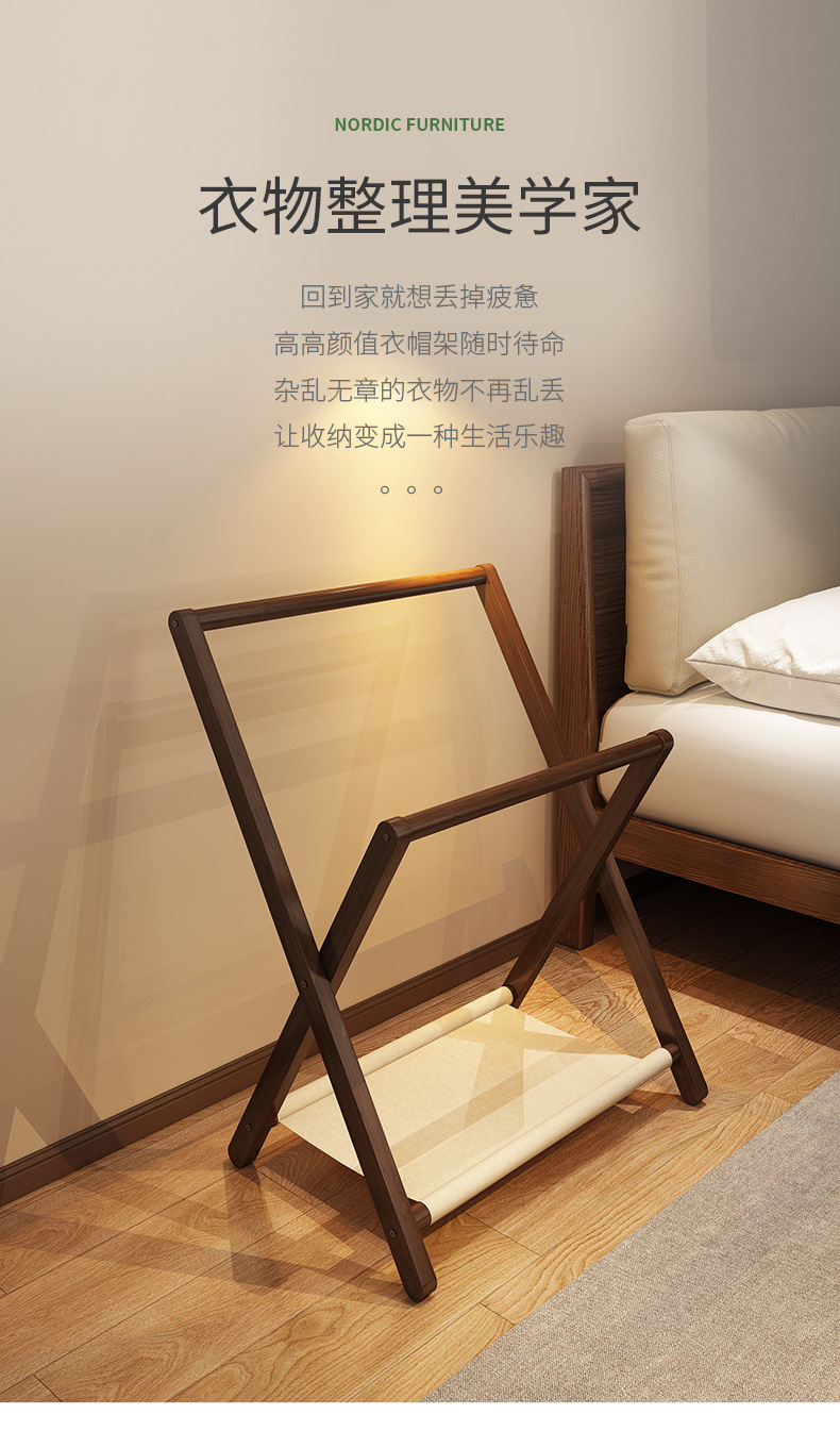 침대 옆 옷걸이, 바닥에 작은 원목 침실, 밤에 잠을 잘 때 임시 옷과 바지 보관, 북유럽