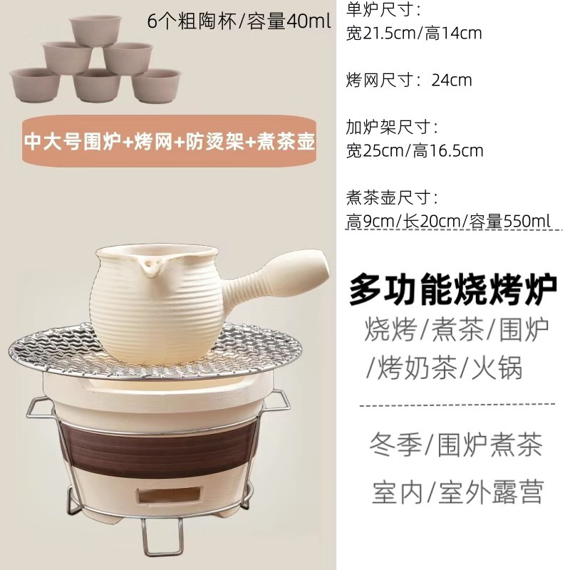 • 중소형 숯불 난로 + 그릴 그리드 + 난로 선반 + 우아한 찻주전자 + 석기 컵 6개