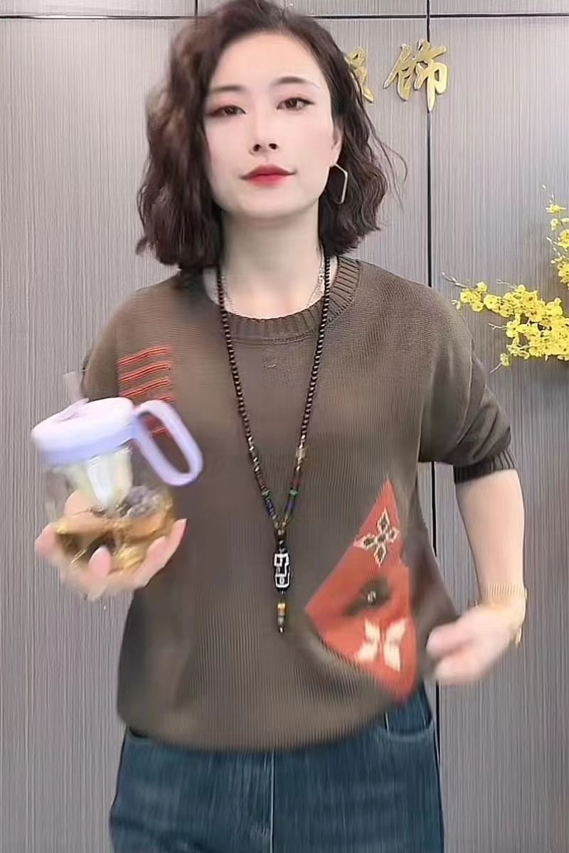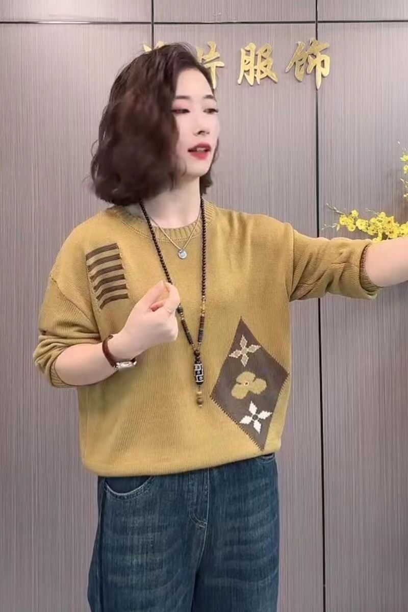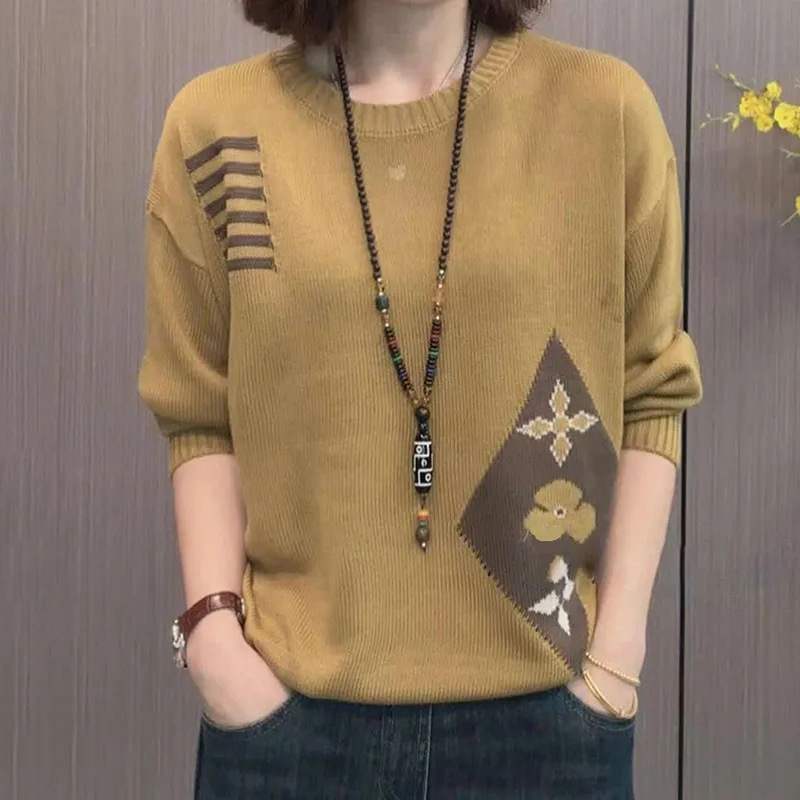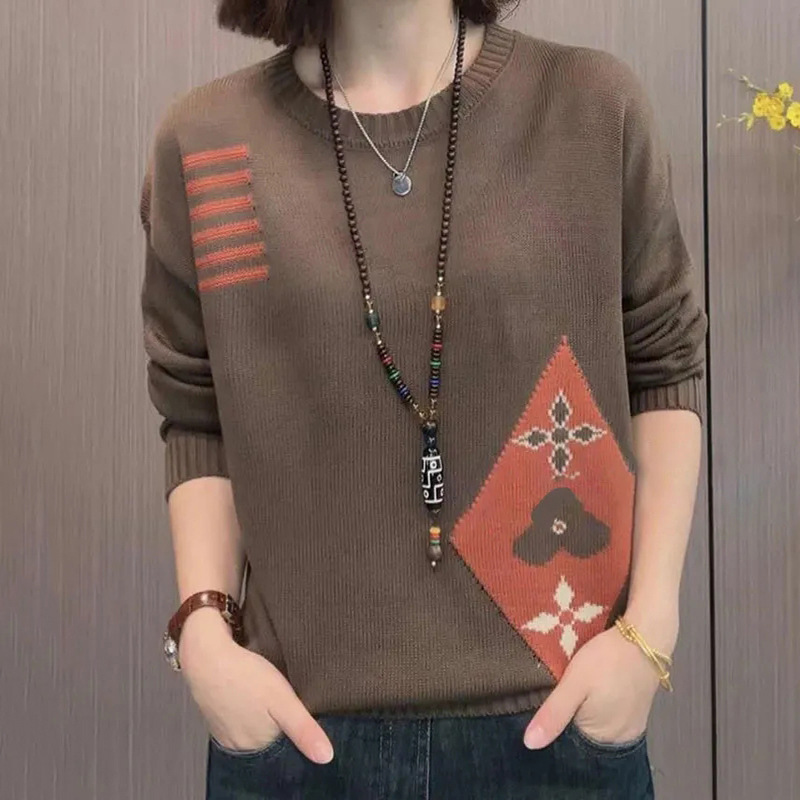 여성을위한 느슨한 슬림 대형 자카드 라운드 넥 스웨터 봄 새로운 민족 스타일 니트 바닥 봄, 가을 다목적 탑