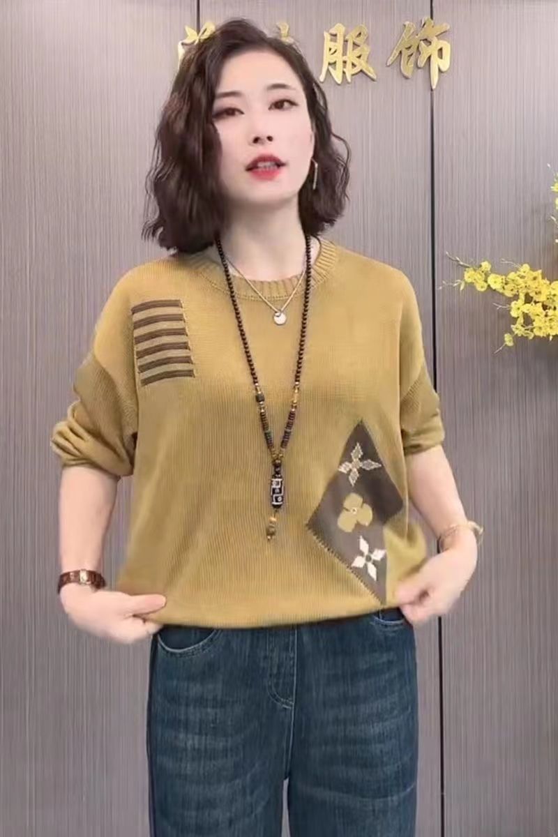 여성을위한 느슨한 슬림 대형 자카드 라운드 넥 스웨터 봄 새로운 민족 스타일 니트 바닥 봄, 가을 다목적 탑스토어 가기