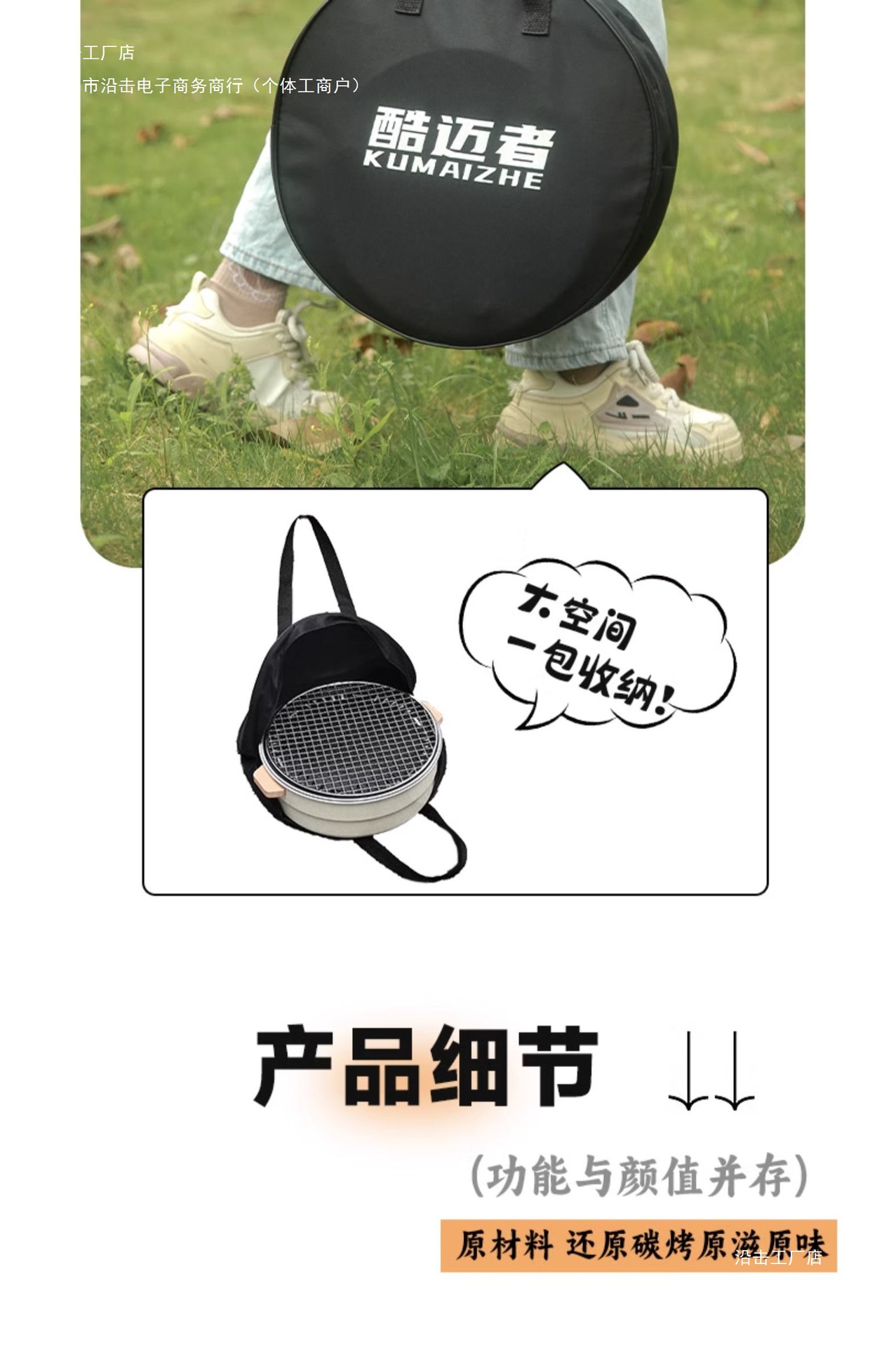 • 업그레이드된 화로 + 그릴 그리드 + 베이킹 팬 + 바베큐 집게 + 옥스포드 천 보관 가방 + 과일 숯 12개 + 500ml 구운 우유 캔