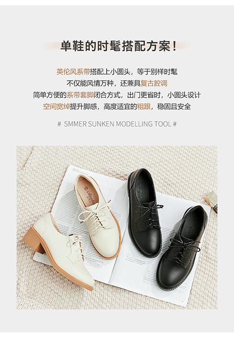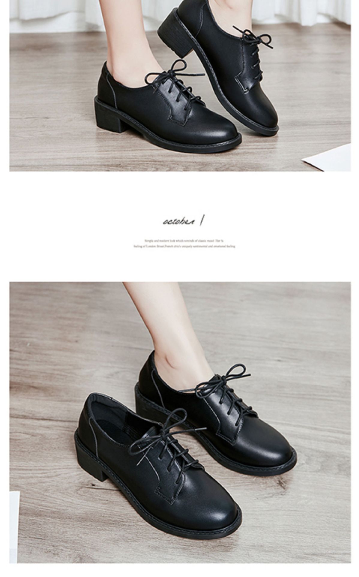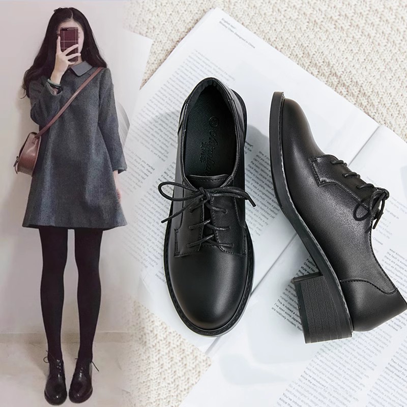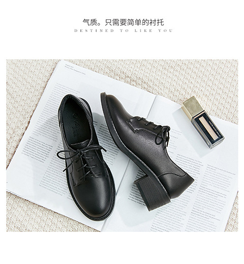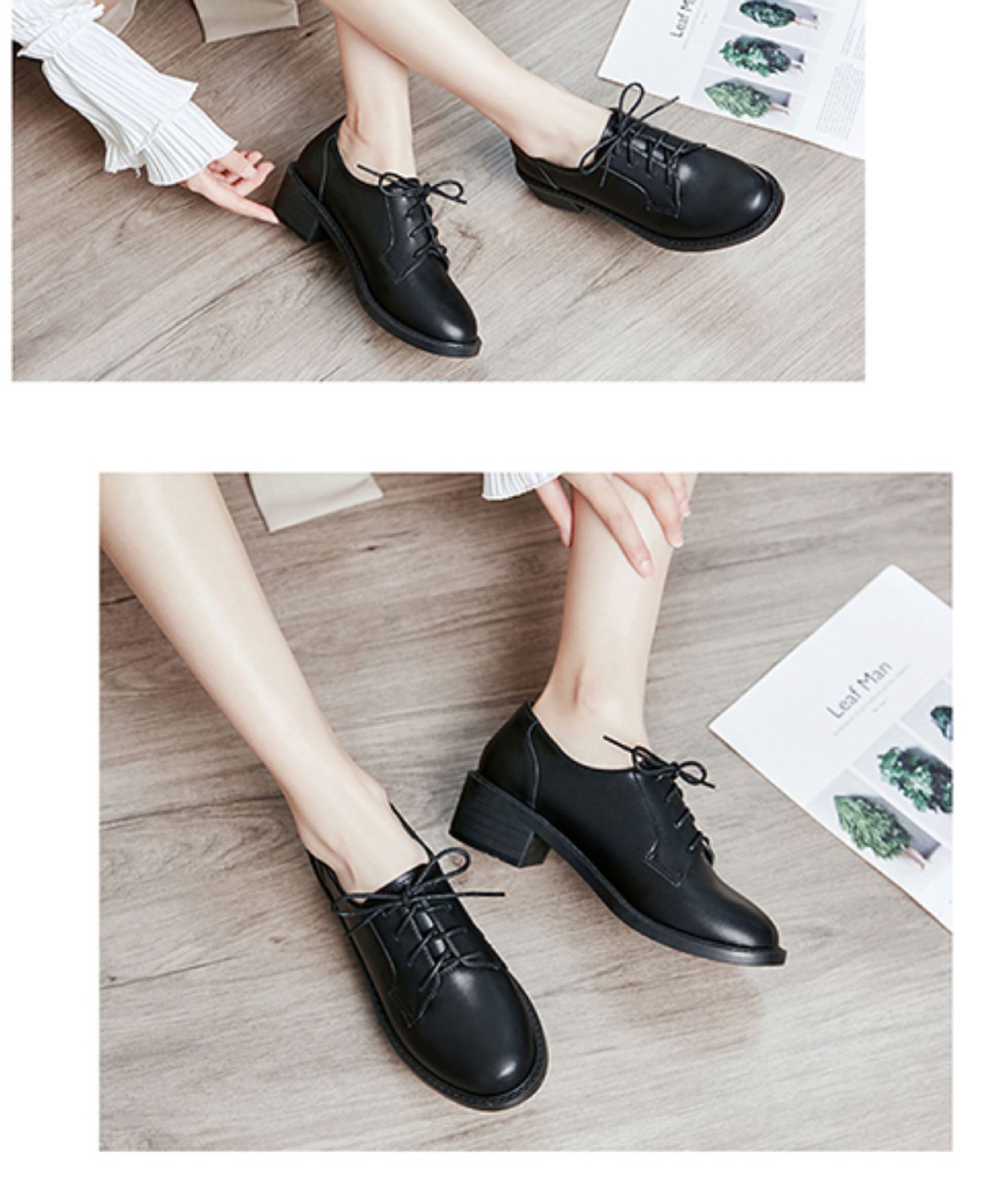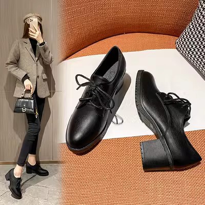 작업화, 여성용 부드러운 밑창, 작업용 편안함, 검은색 하이힐, 영국식 작은 가죽 신발, 봄 가을 통근 여성화, 미드힐 싱글 슈즈스토어 가기