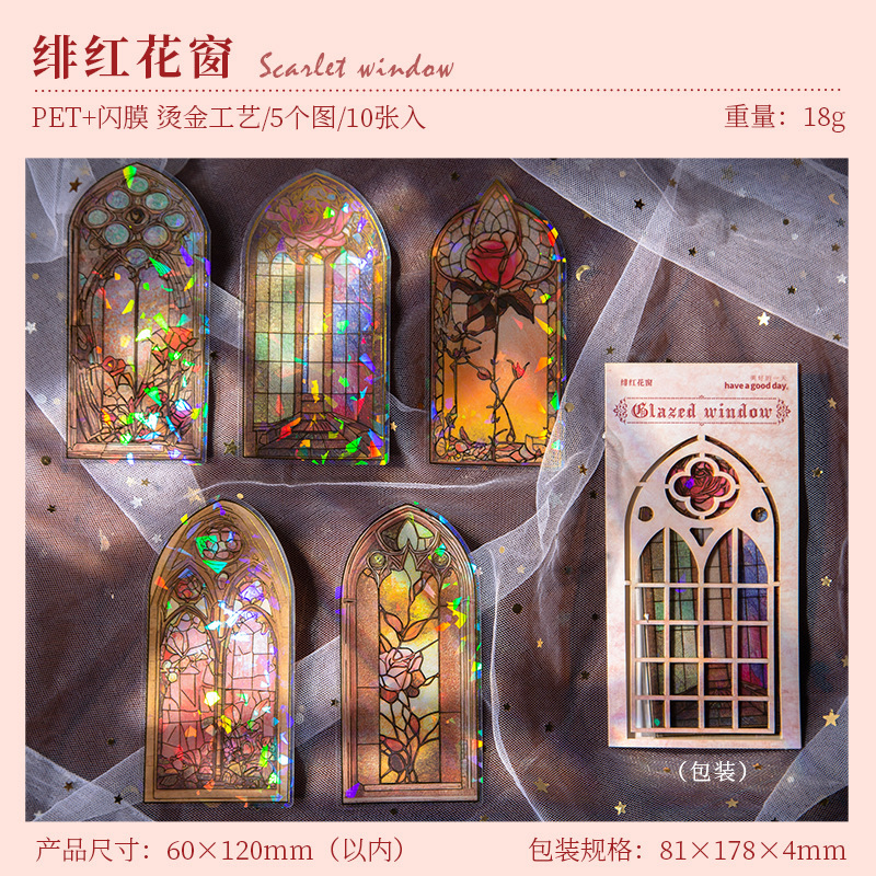 유리 꽃창 시리즈 아름다운 날 핫 스탬핑 PET 스티커 복고풍 꽃창 핸드북 소재 스티커 복고풍 6 스타일스토어 가기