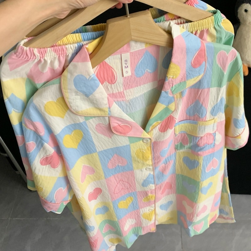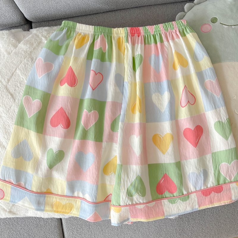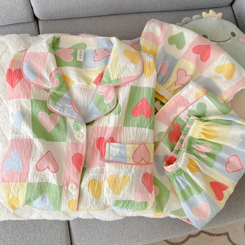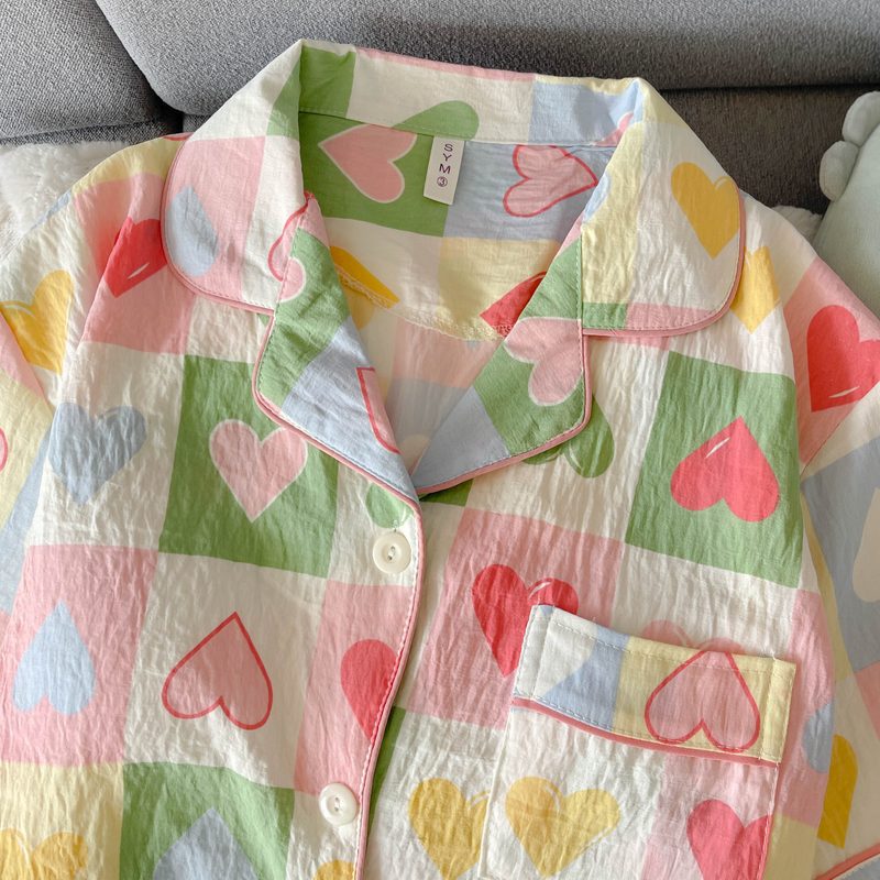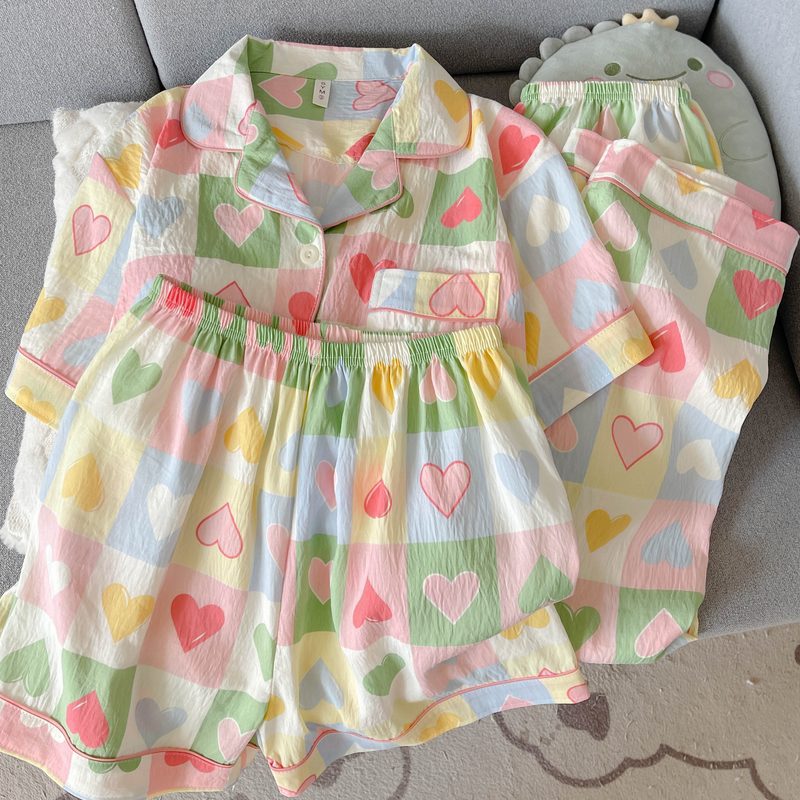 여성용 대형 잠옷, 봄 여름 반팔 소녀 핑크 스위트 체크 무늬 러브 3피스 슈트, 외부 착용 가능스토어 가기