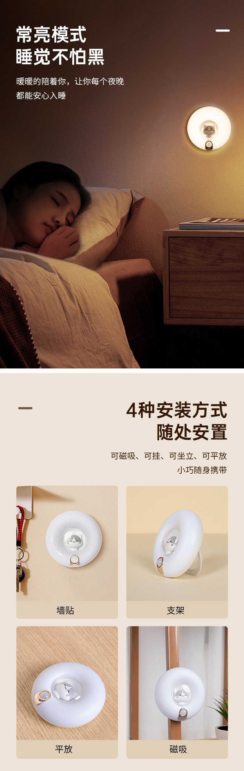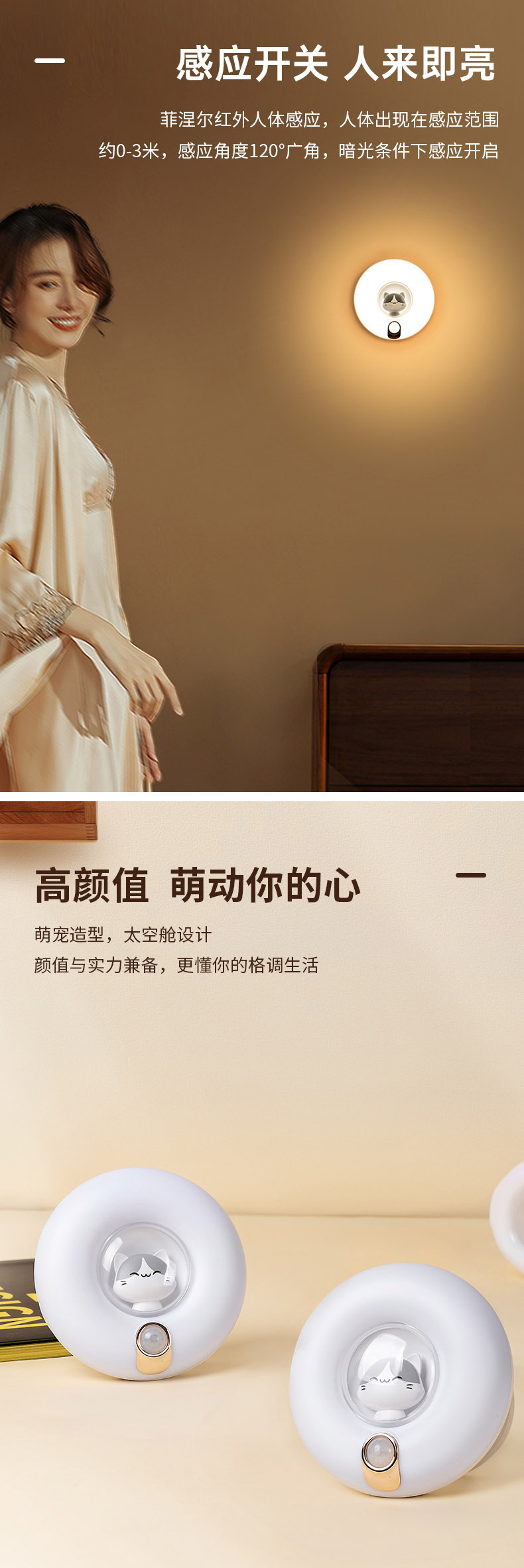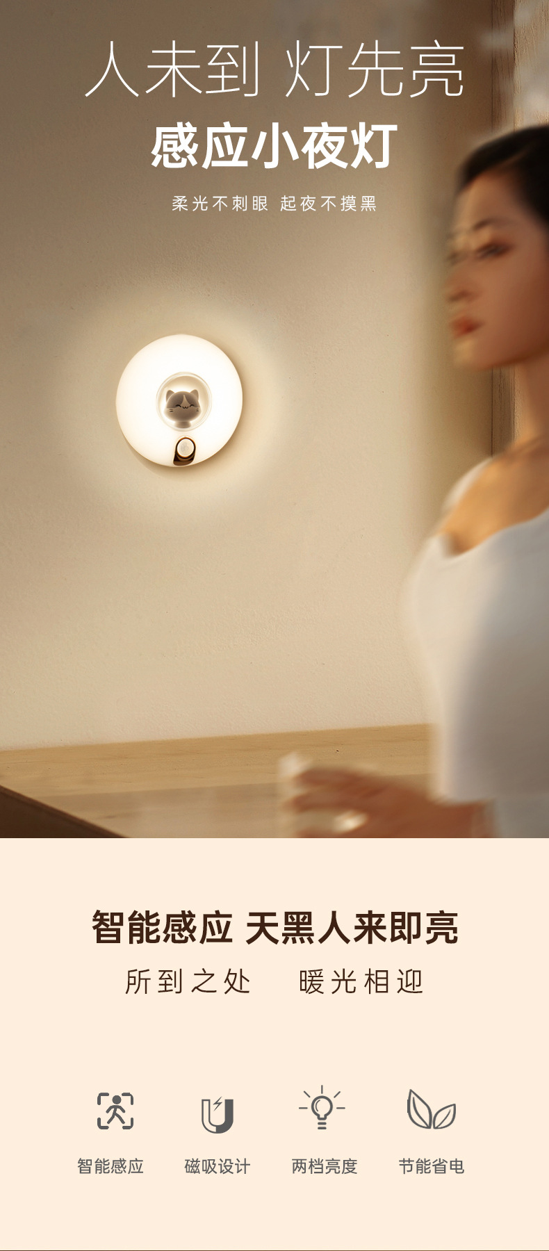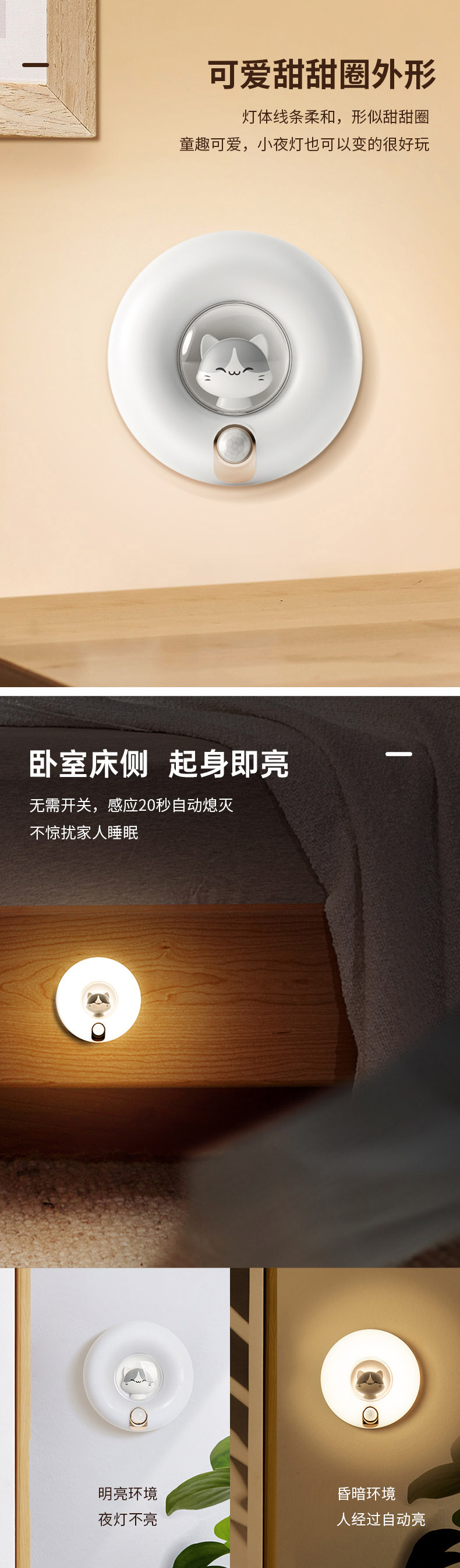 작은 밤 고양이 인체 유도 램프 소리 및 빛 제어 충전 홈 옷장 계단 배선없는 LED 야간 조명