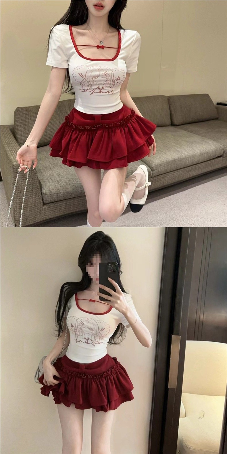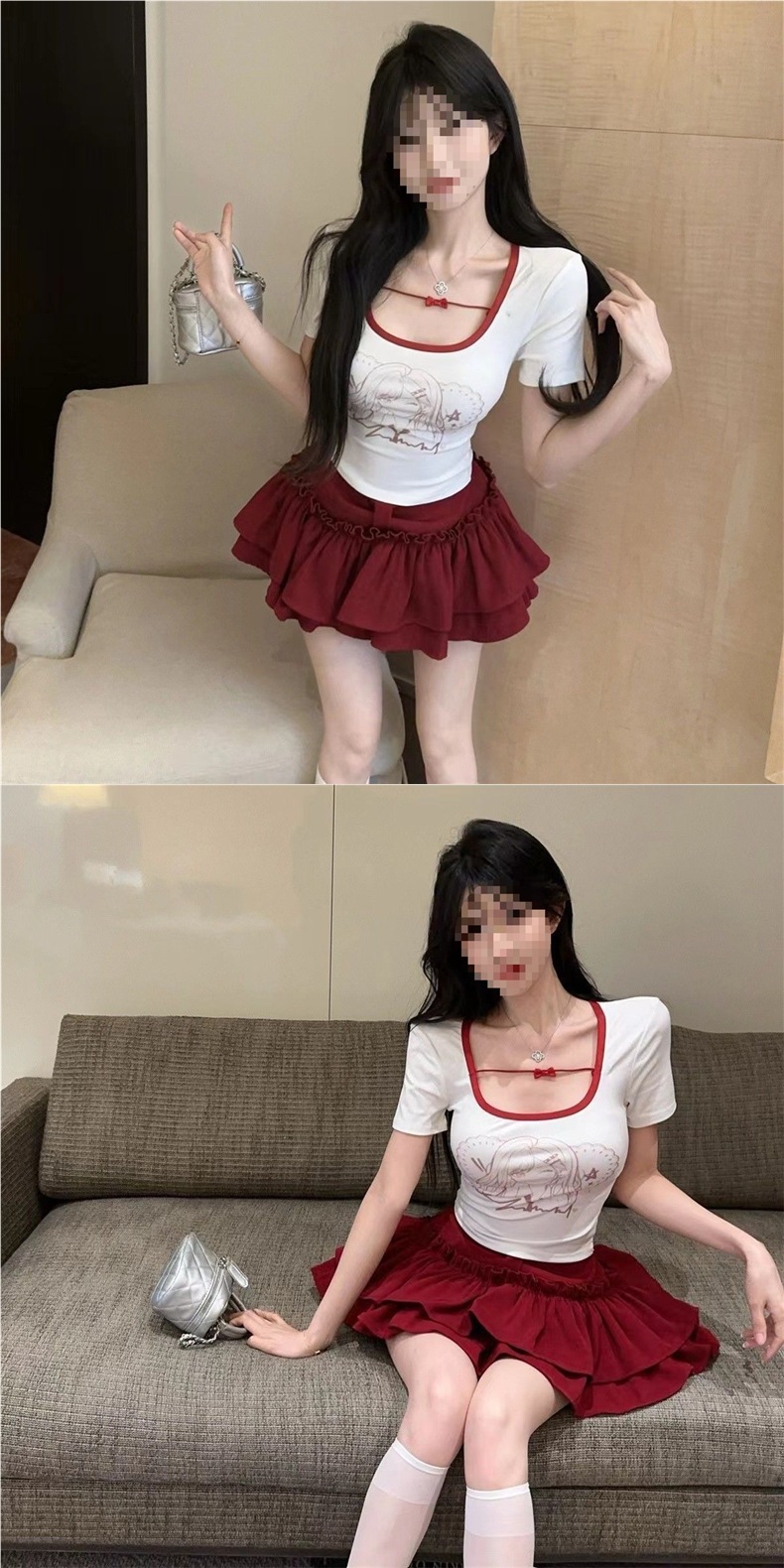 소녀들을 위한 달콤하고 매콤한 섹시 슈트, 핫걸 슬림 반팔 티셔츠, 여름 상의, 투투 스커트, 여름용 투피스 세트스토어 가기