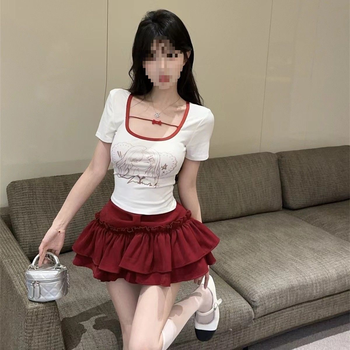 소녀들을 위한 달콤하고 매콤한 섹시 슈트, 핫걸 슬림 반팔 티셔츠, 여름 상의, 투투 스커트, 여름용 투피스 세트