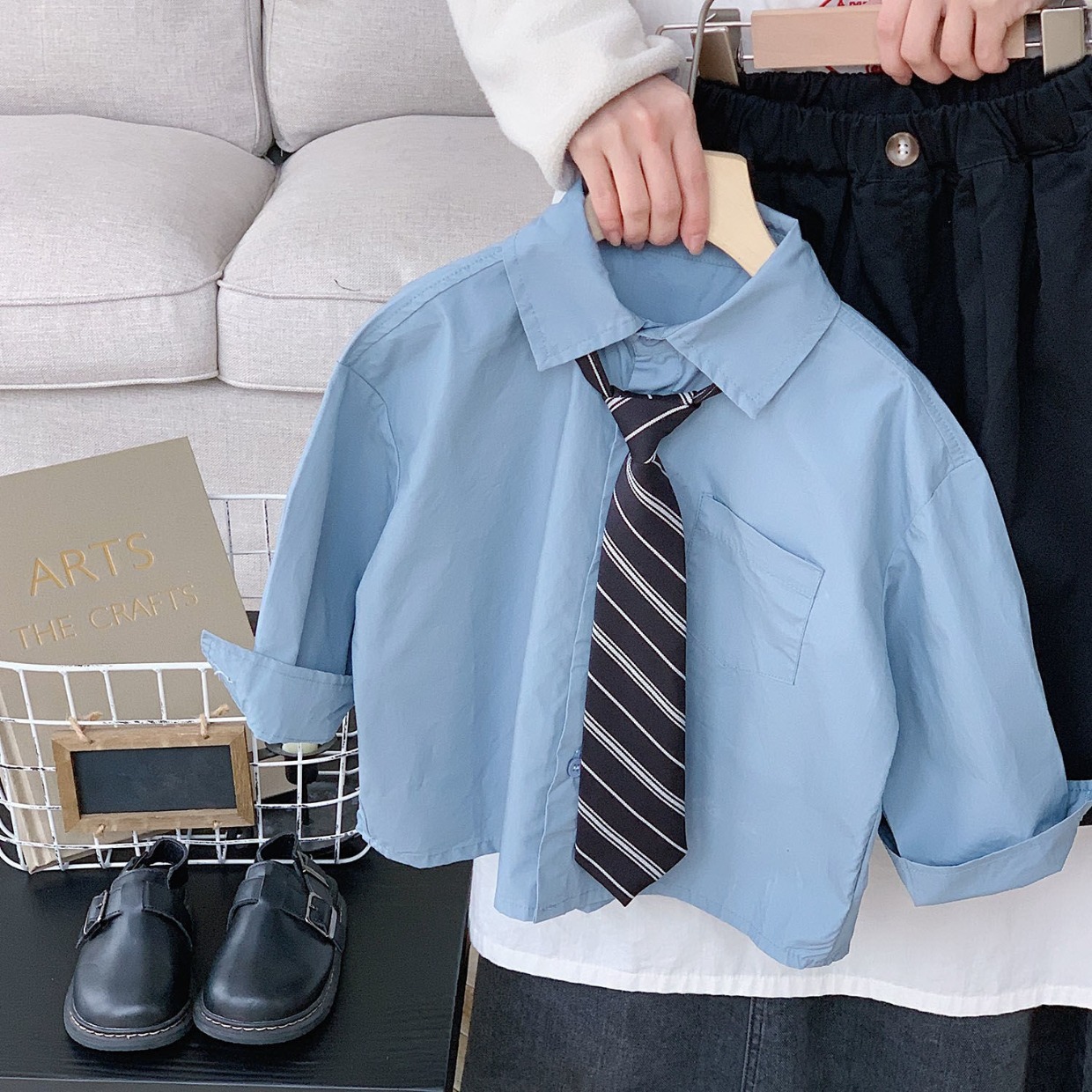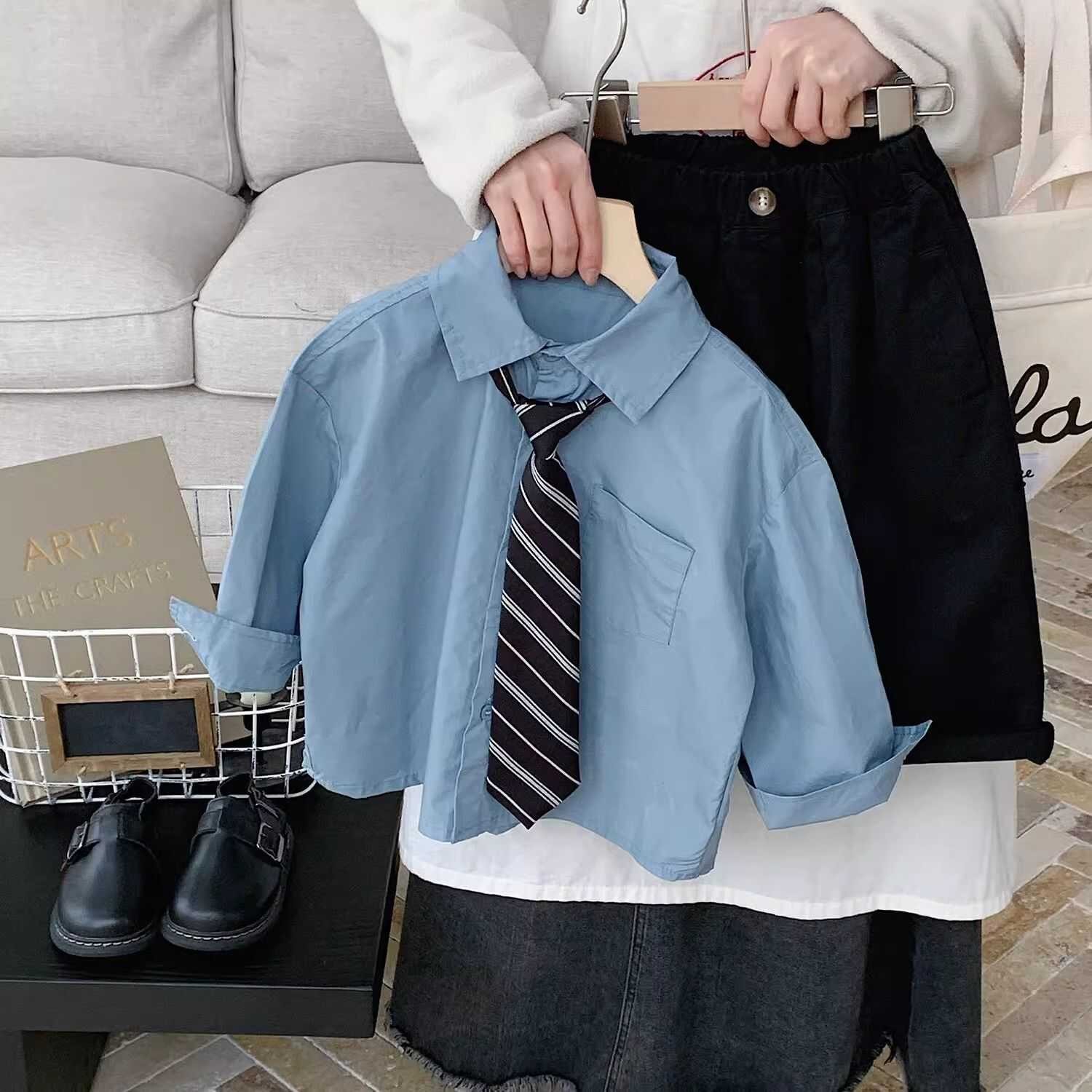 아동용 다용도 셔츠 봄 신작 소년 베이비 한국식 대학 넥타이 블루 셔츠 캐주얼 탑스토어 가기