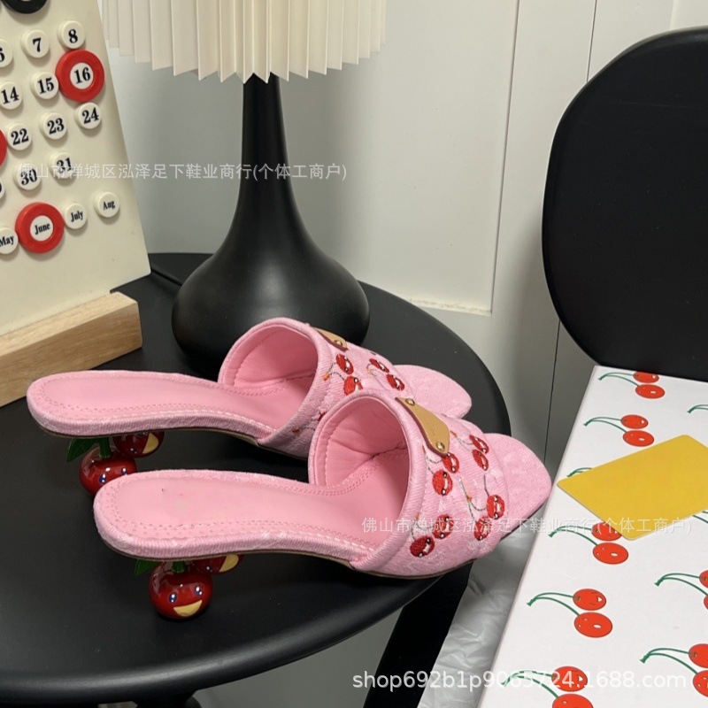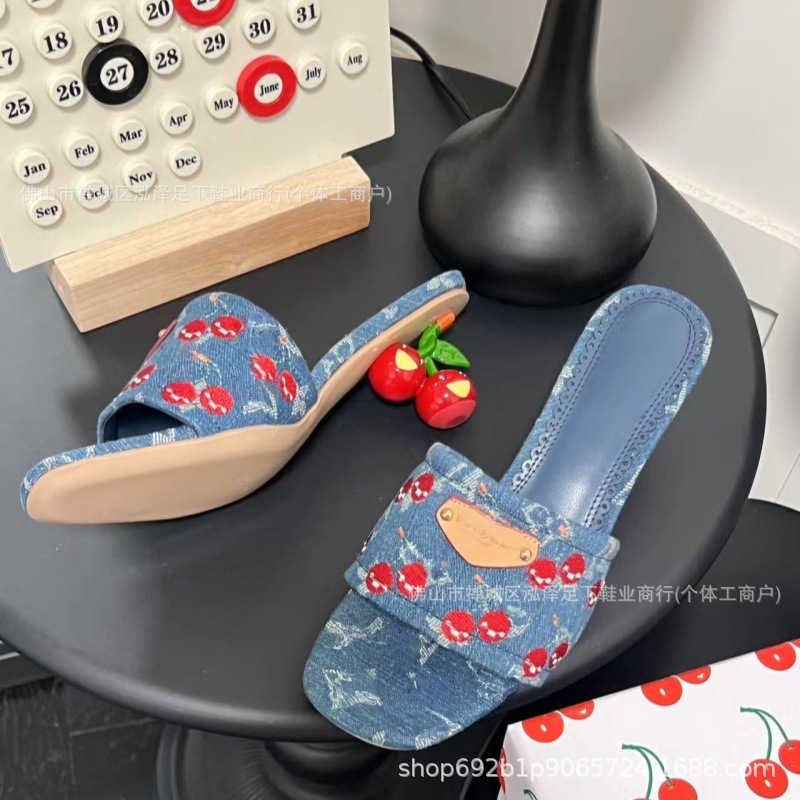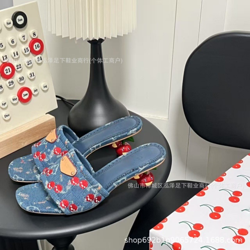 2025 봄 여름 신작 체리 자수 데님 뮬 하이힐 샌들 여성용 레트로 슬리퍼
