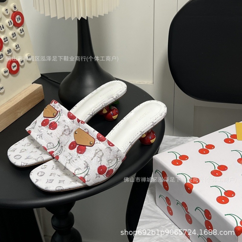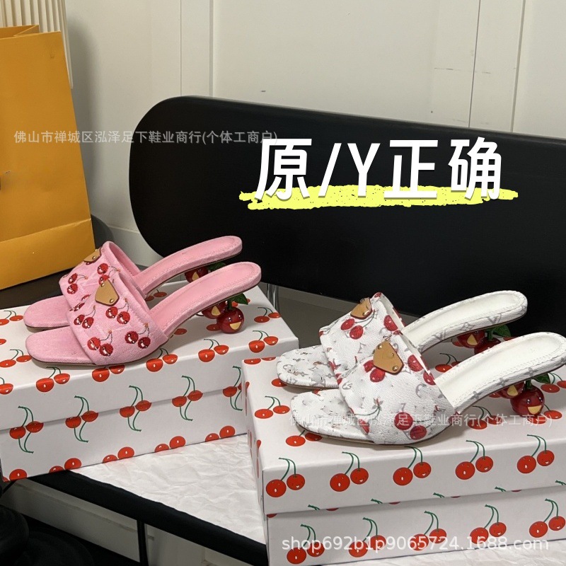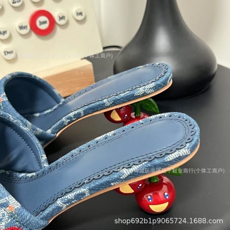 2025 봄 여름 신작 체리 자수 데님 뮬 하이힐 샌들 여성용 레트로 슬리퍼스토어 가기